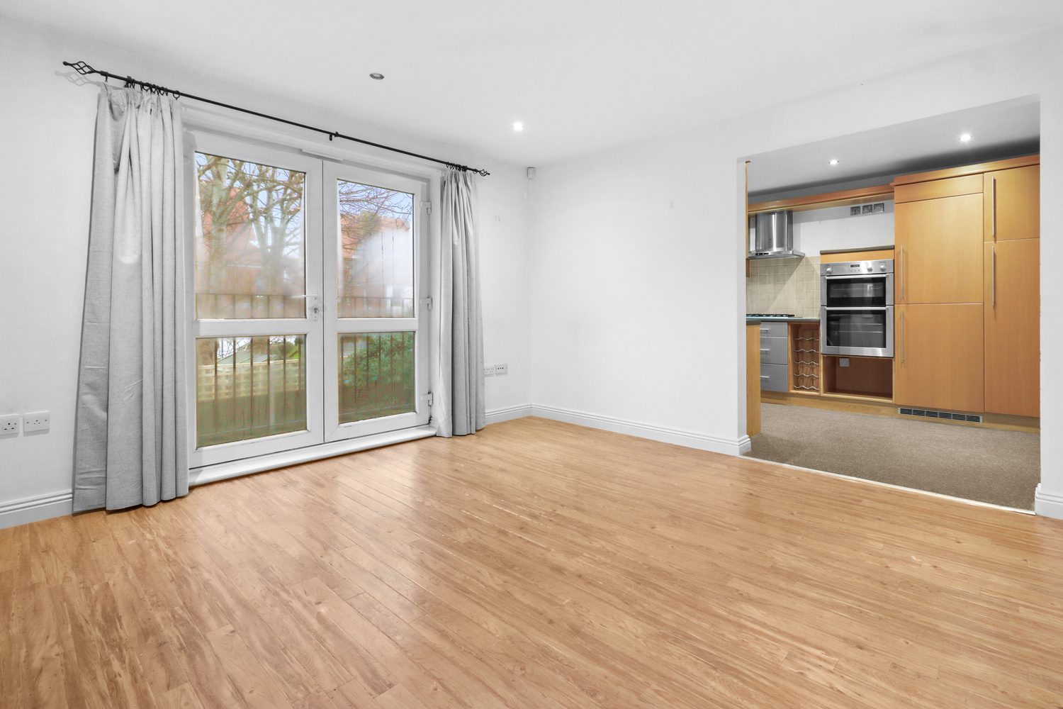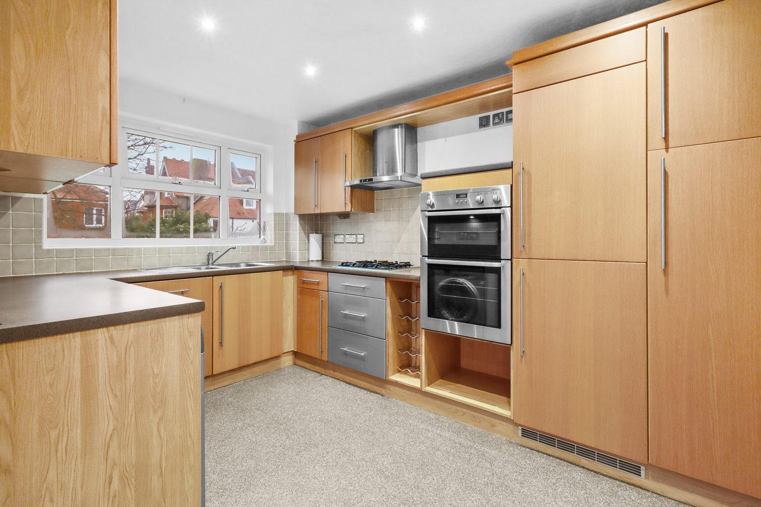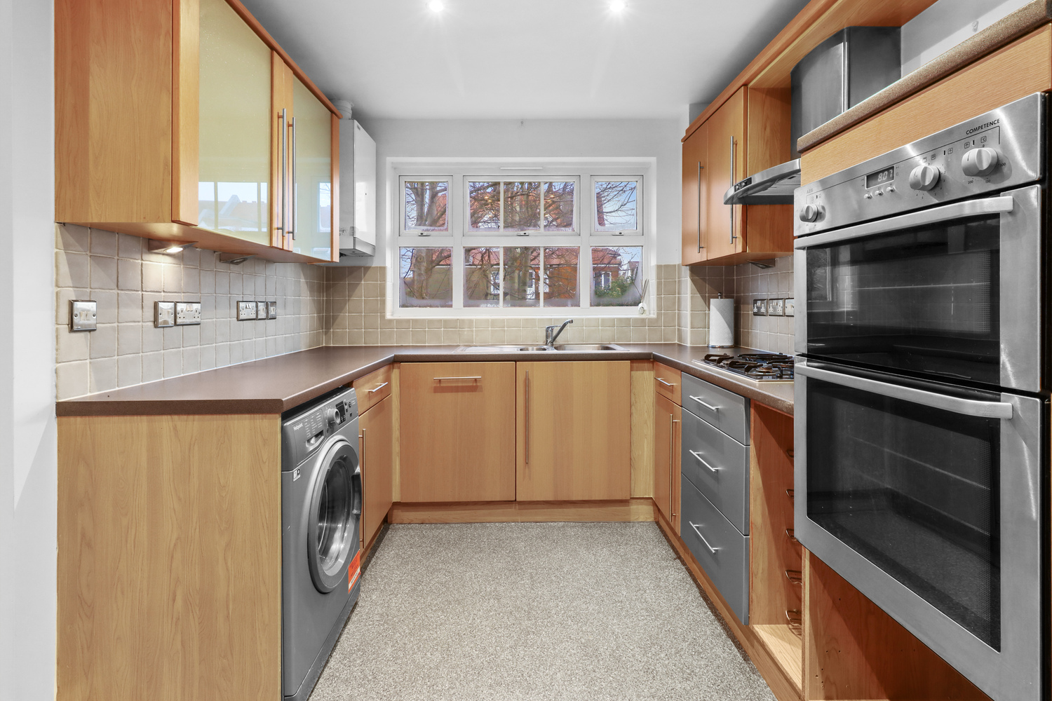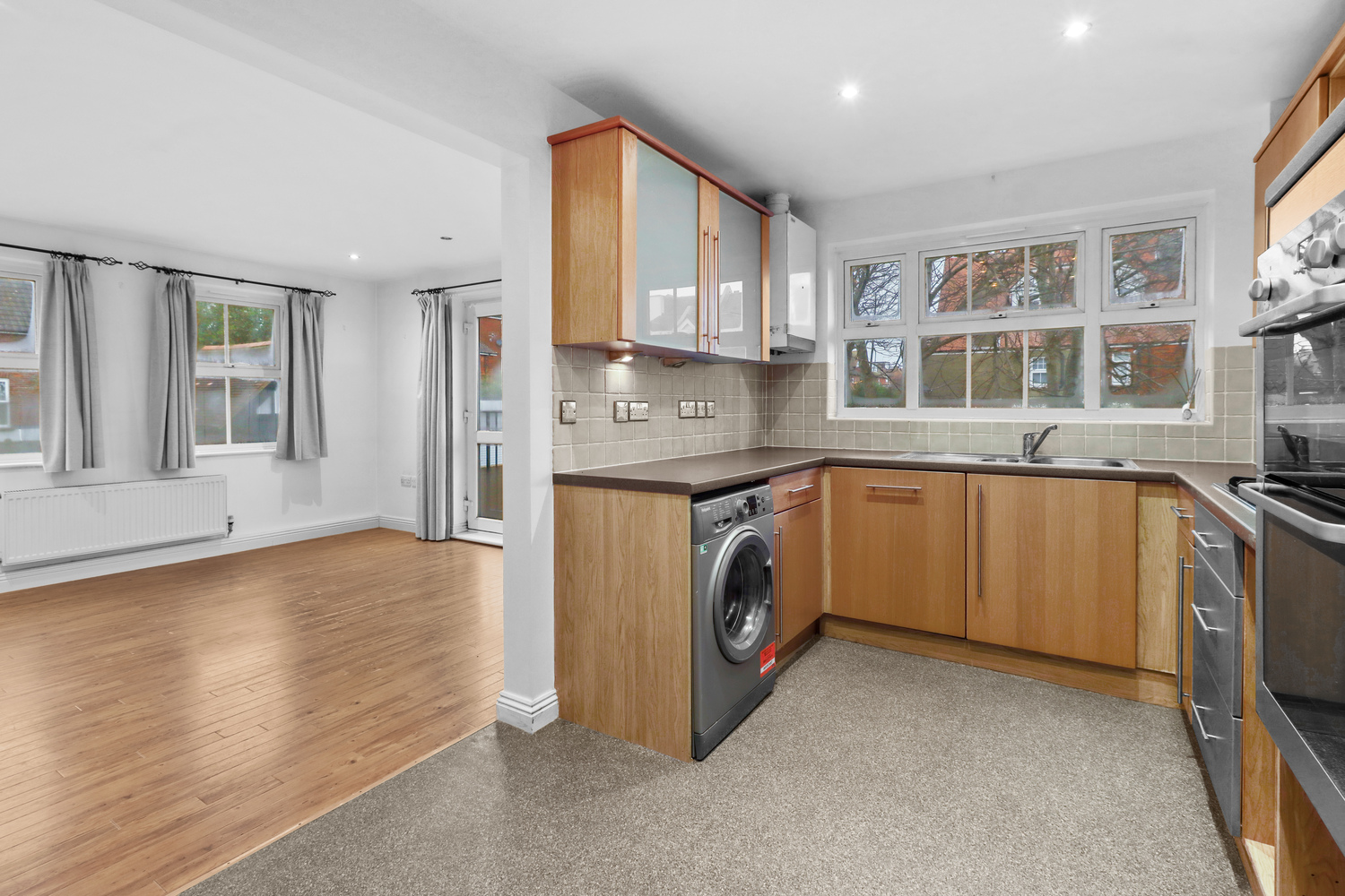 The light and airy living room is spacious and leads nicely onto the modern kitchen which is fitted with a range of wall mounted and matching base units with work surface over and comes complete with integrated cooker, gas hob with extractor hood over, fridge and freezer and space for washing machine.