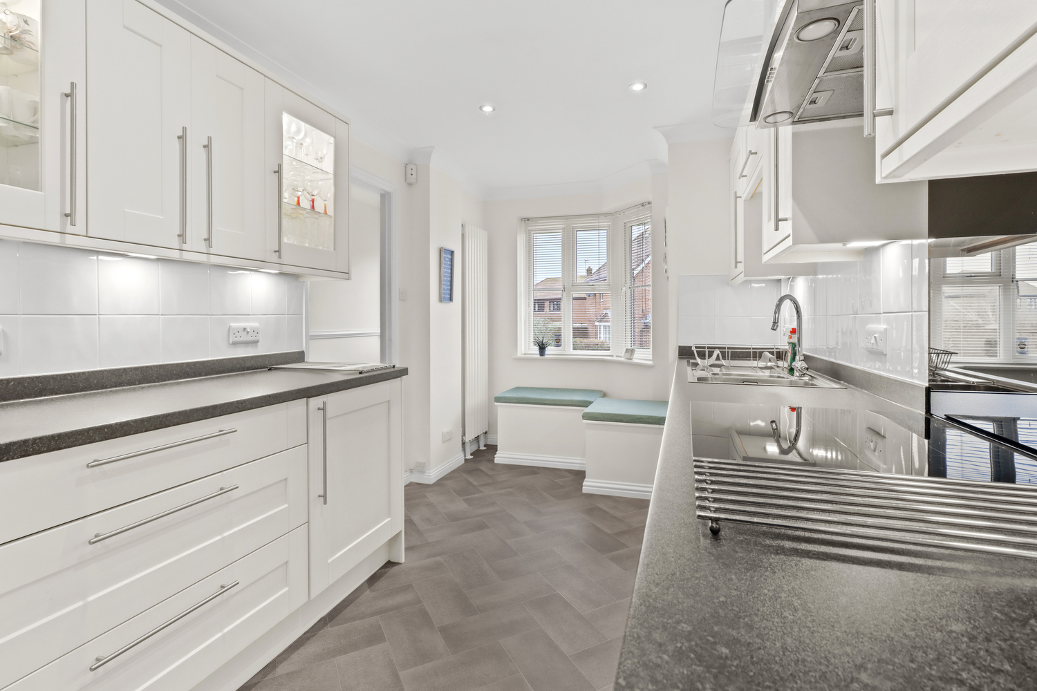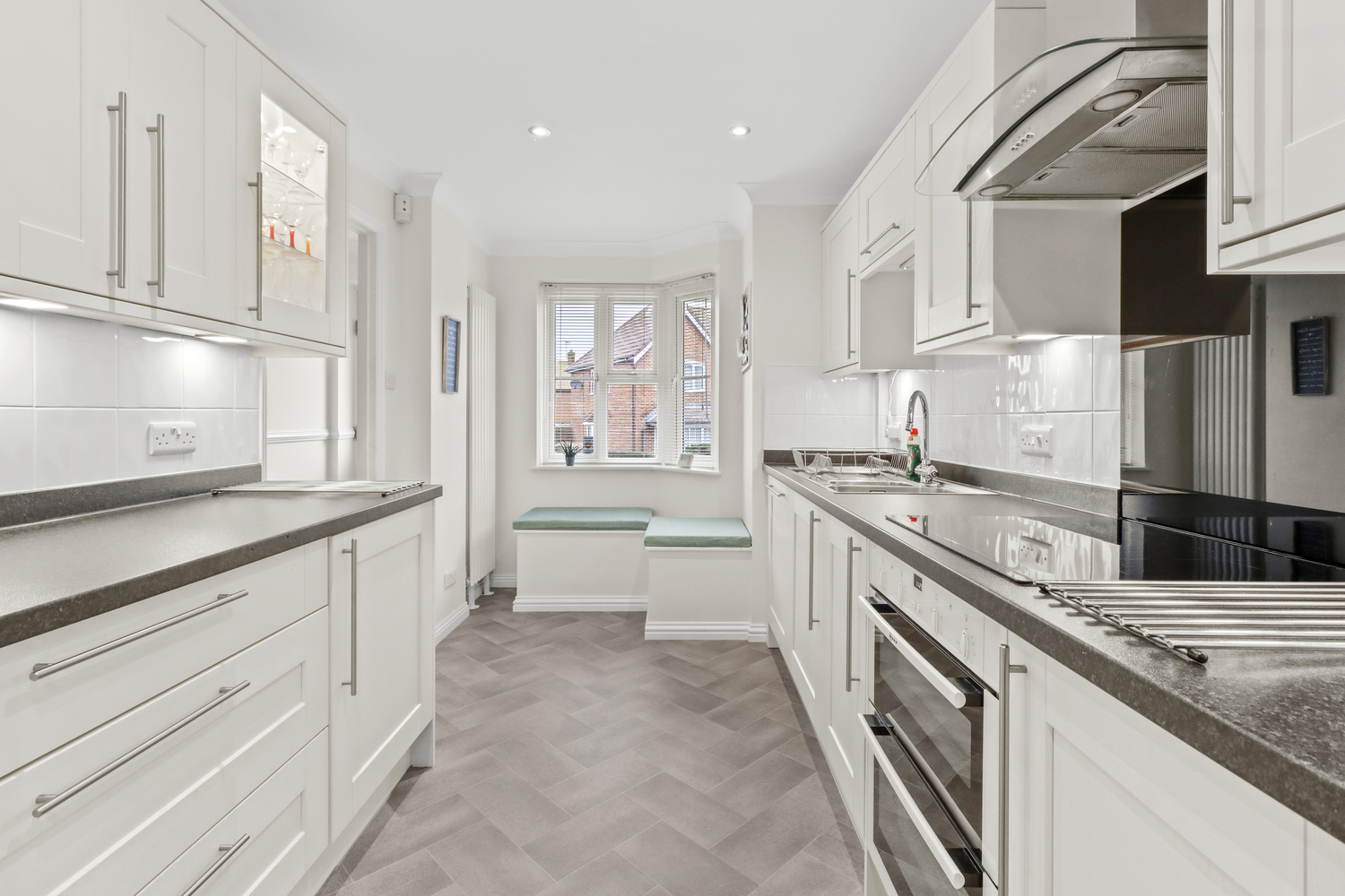 The modern kitchen is fitted with a range of wall mounted and matching base units with work surface over. It comes complete with a one and a half bowl stainless steel sink unit with mixer taps, integrated dishwasher, fridge and freezer and a built in oven with four ring induction hob with extractor hood over. There is space and plumbing for a washing machine, enclosed wall mounted boiler and side access and a seating area fitted into the bay window.
