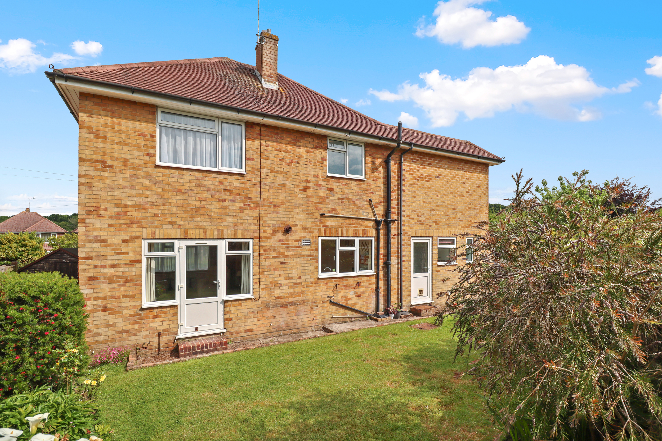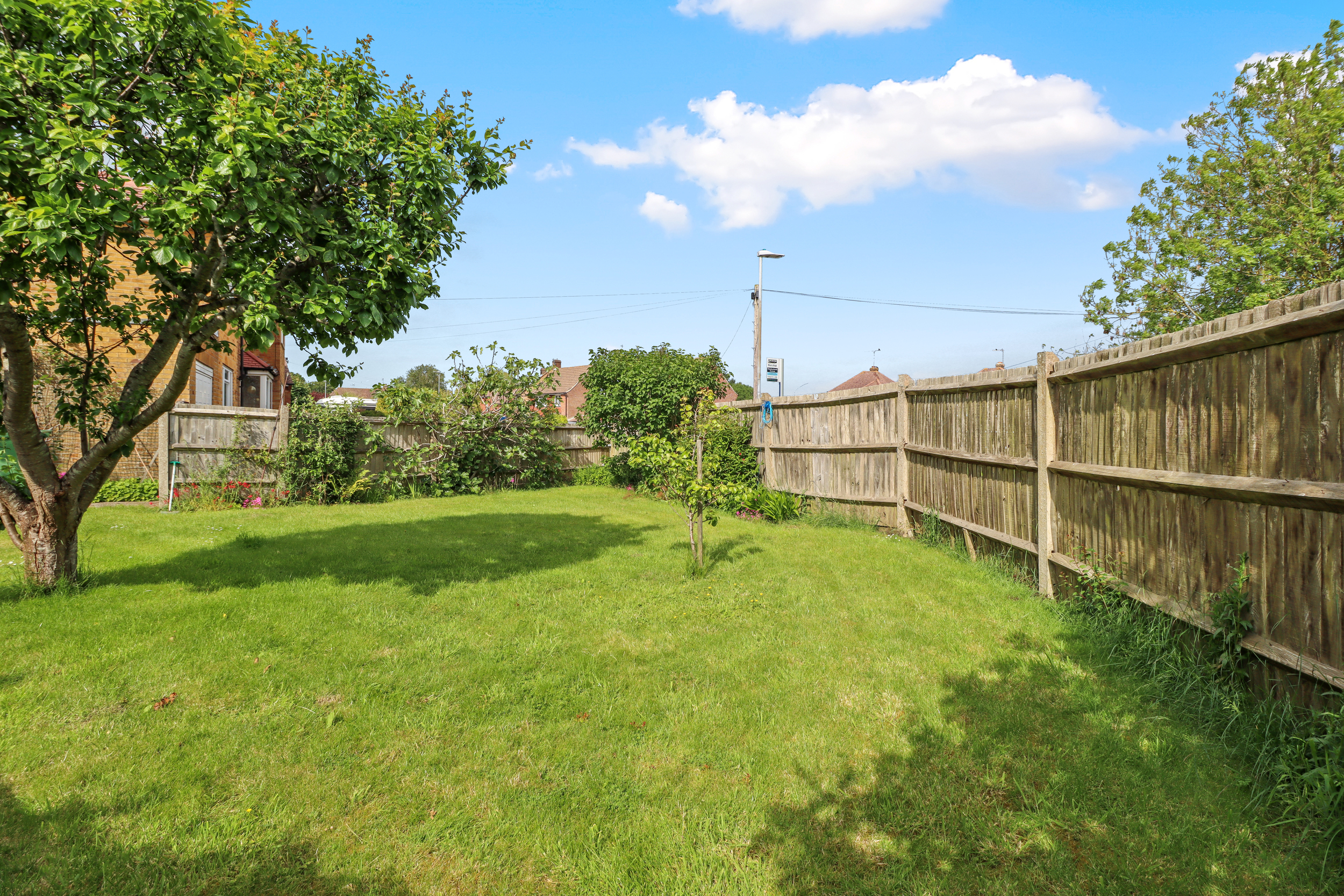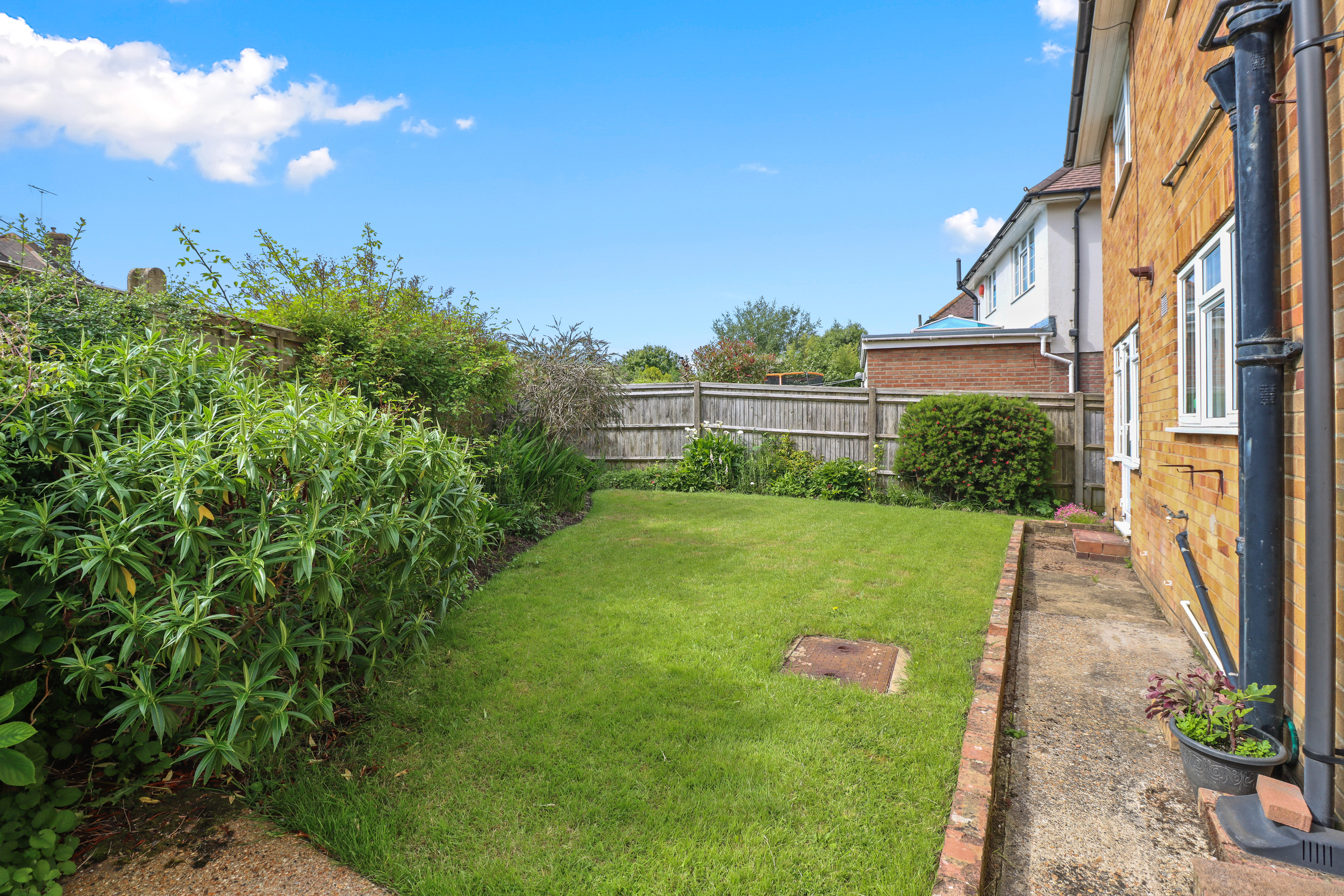 The rear garden is fully enclosed, primarily laid to lawn, offering a safe and spacious area for outdoor activities.