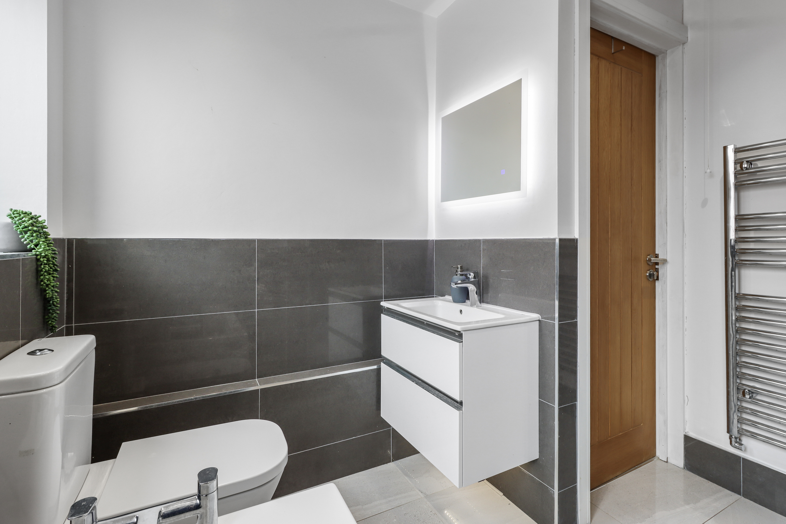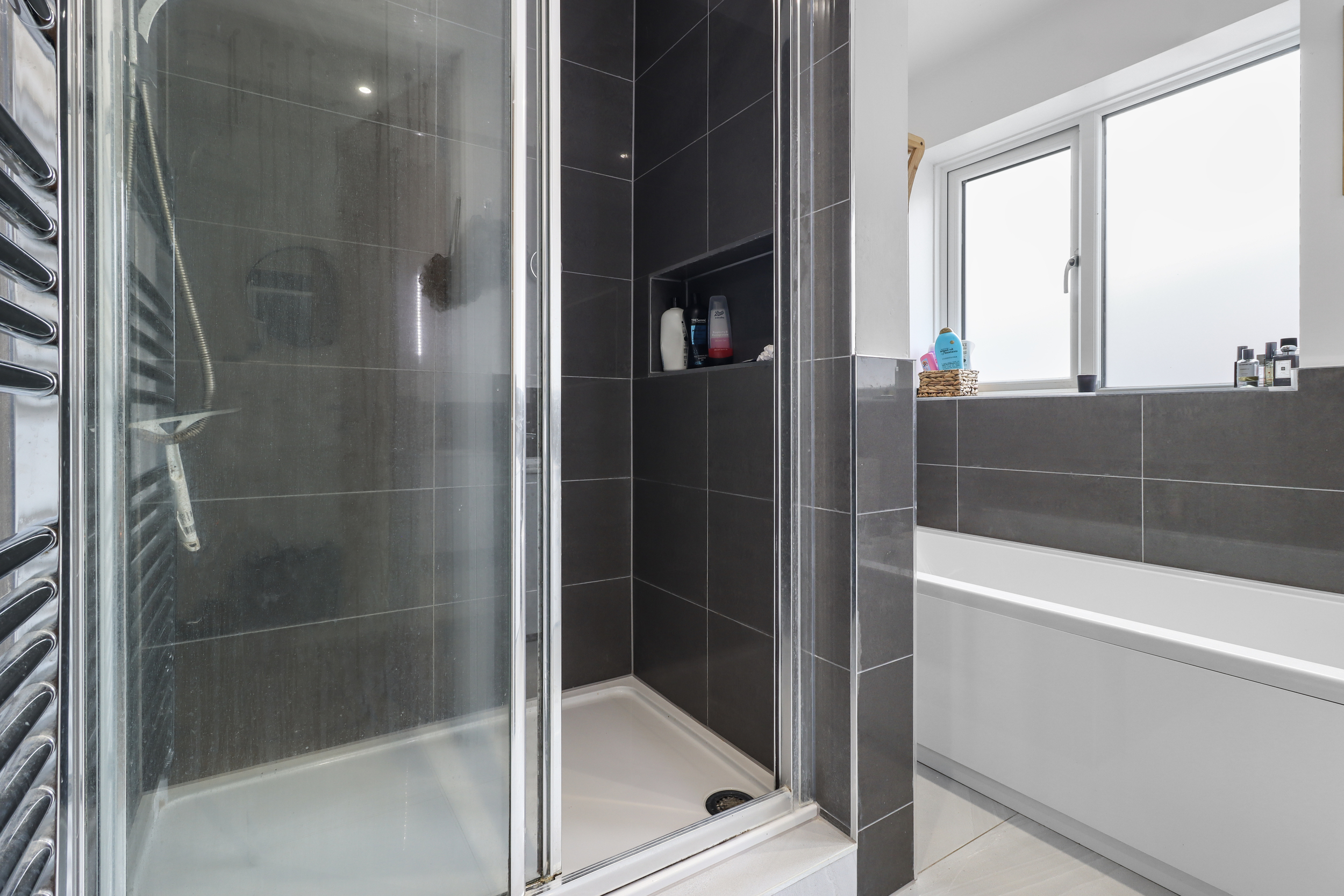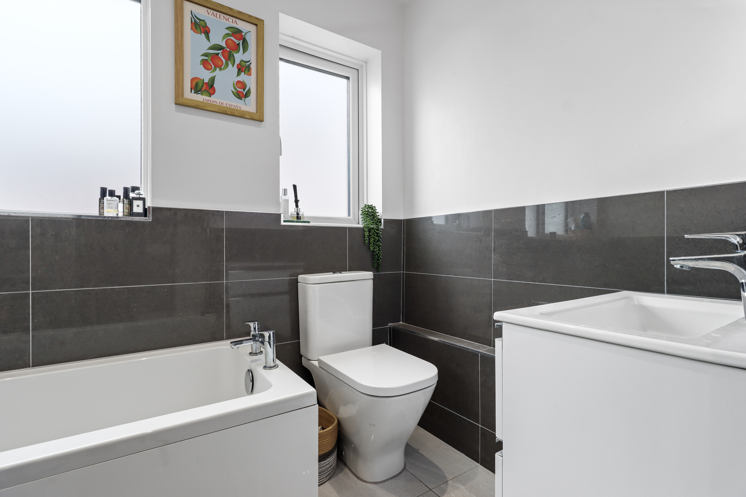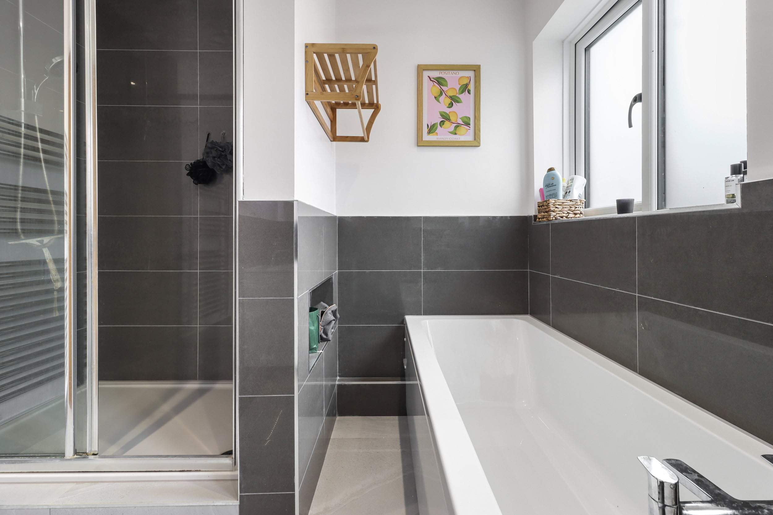 The modern bathroom is a showcase of contemporary design, equipped with a bath, a separate shower cubicle, a close-coupled WC, and a wash hand basin. High-quality fixtures and fittings provide a luxurious touch, ensuring a relaxing and refreshing experience.