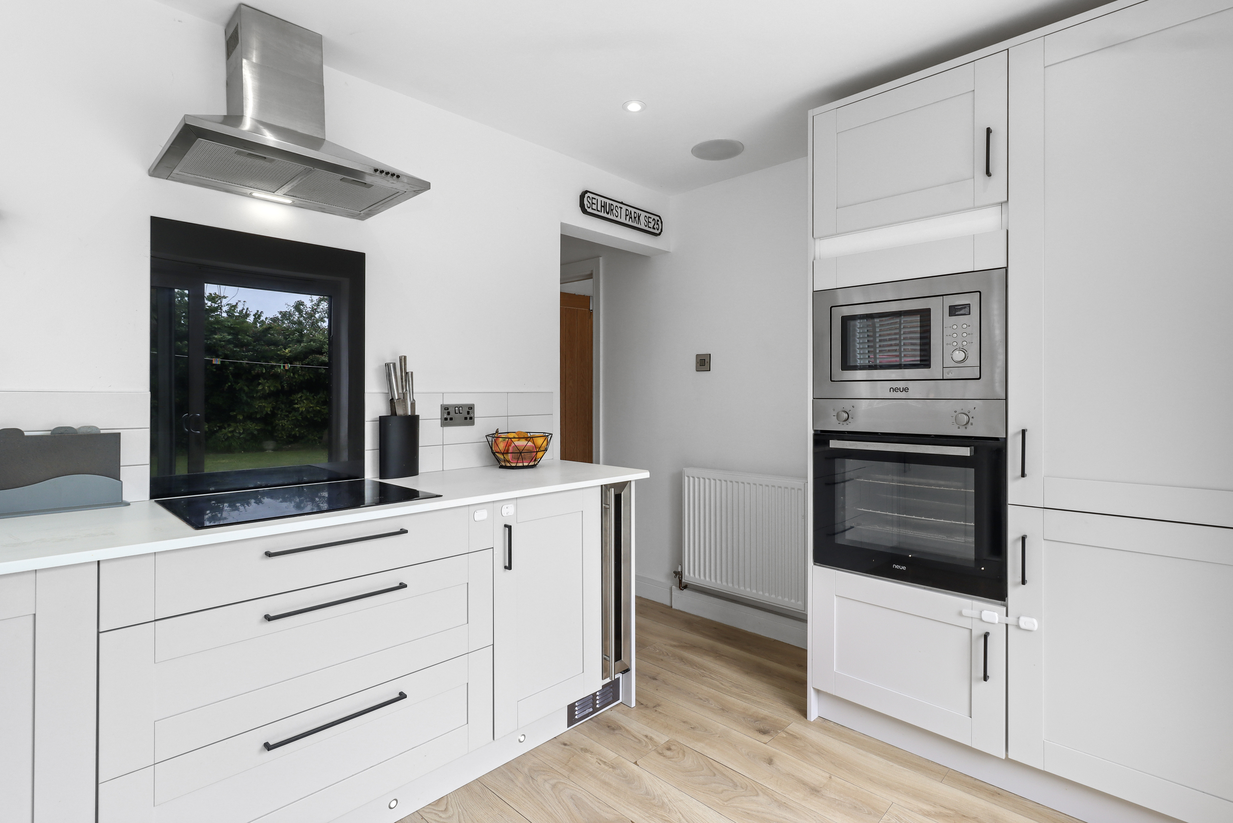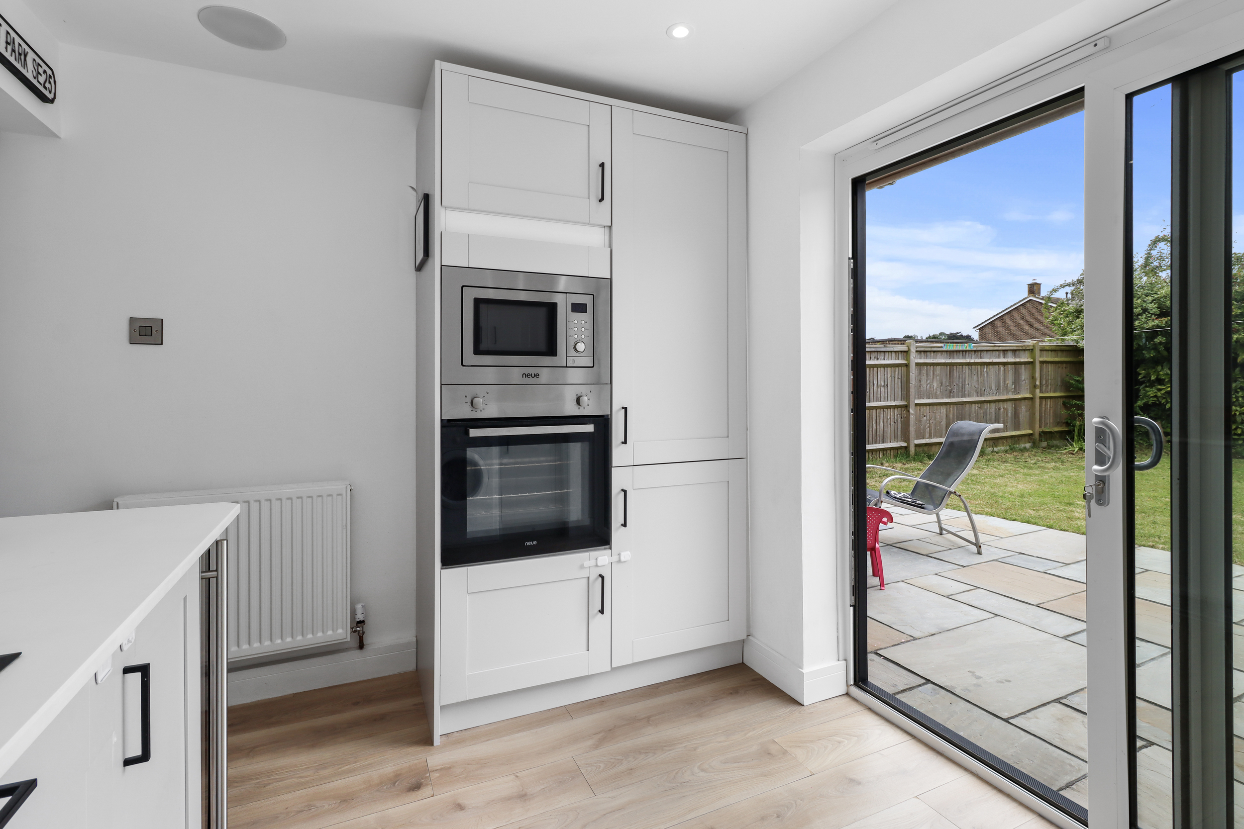 The modern kitchen is a chef’s delight, featuring high-end appliances including a built-in oven, microwave, AEG induction hob with an extractor hood, fridge, freezer, and a slimline dishwasher. Double glazed sliding patio doors open to the rear garden, seamlessly blending indoor and outdoor living.