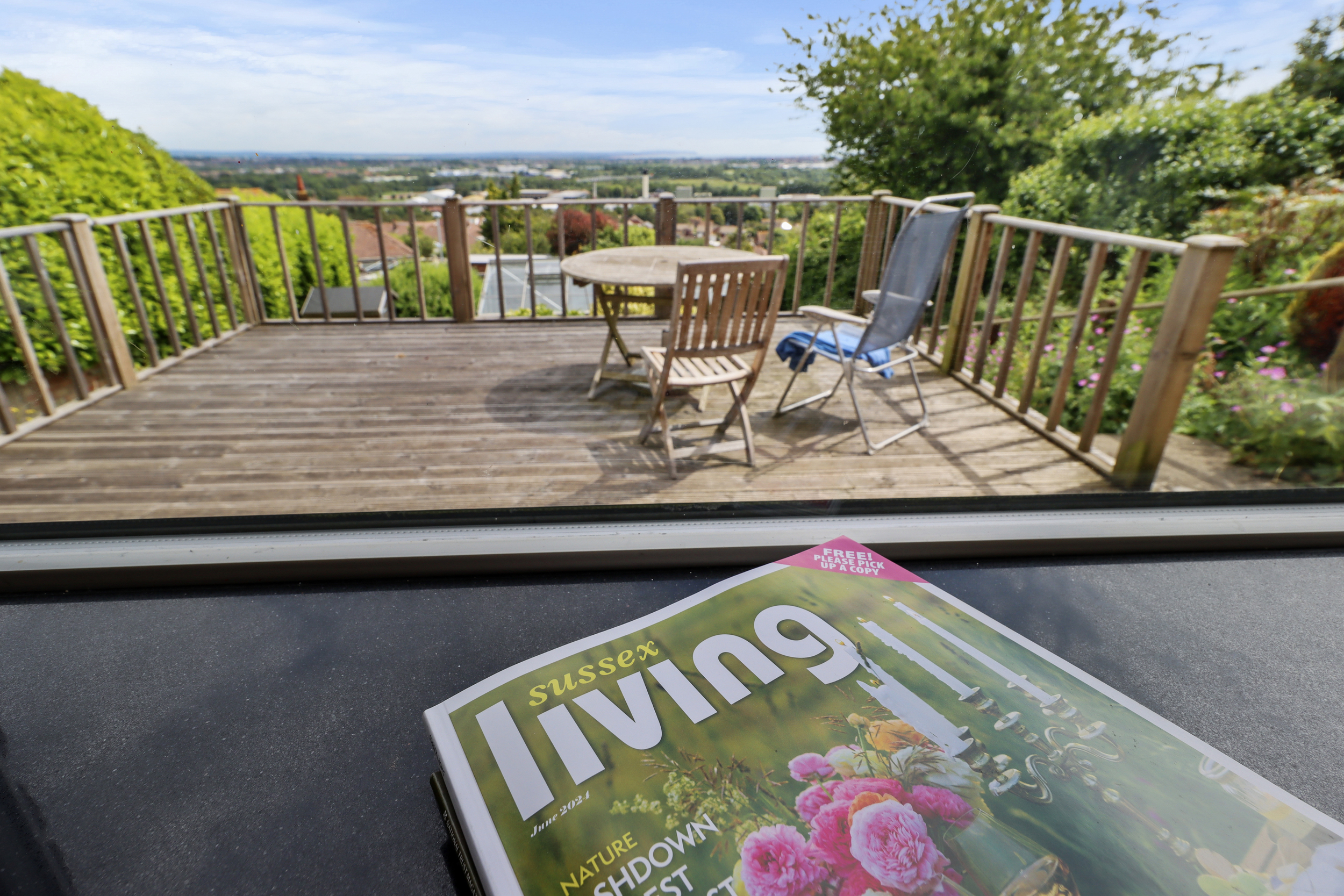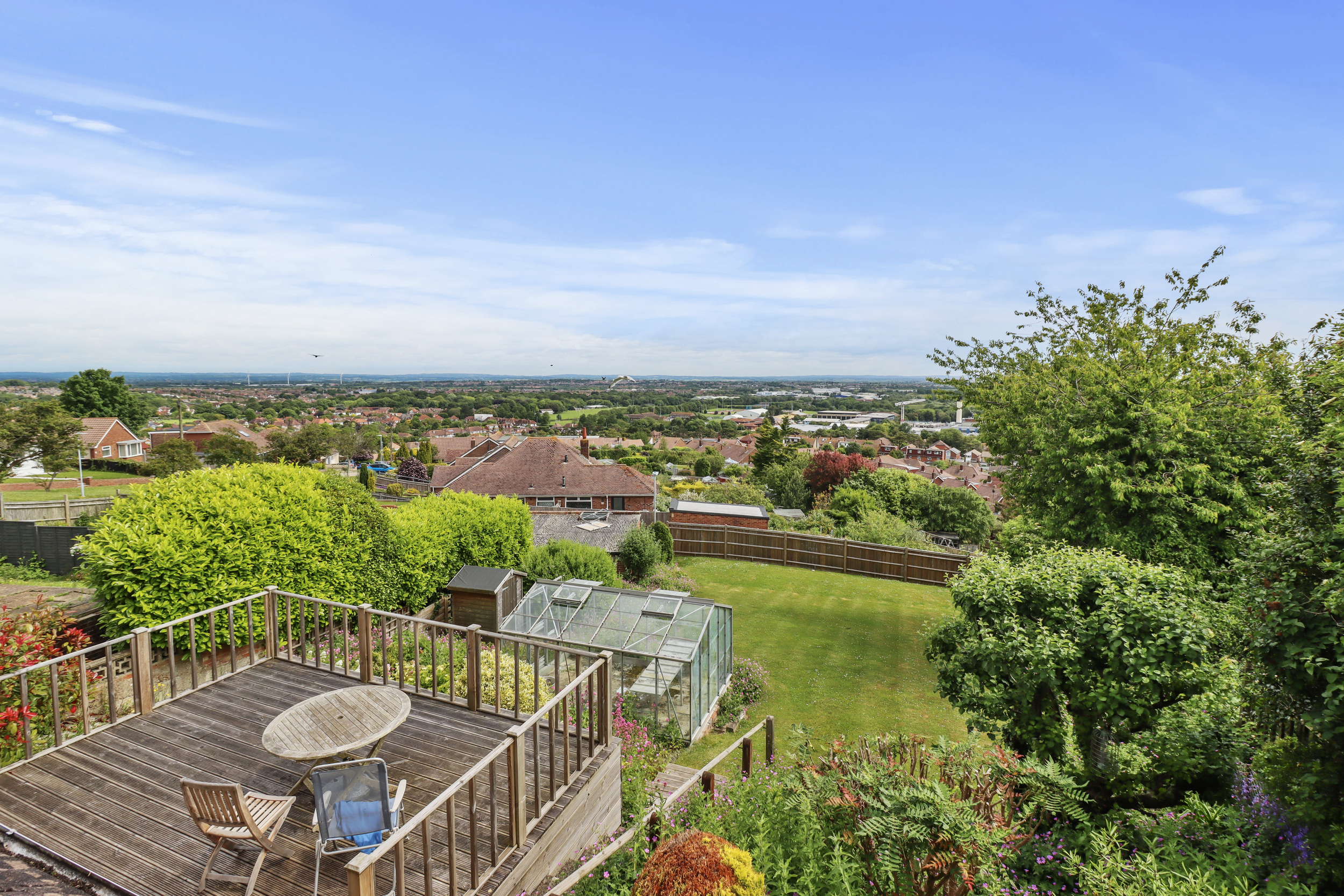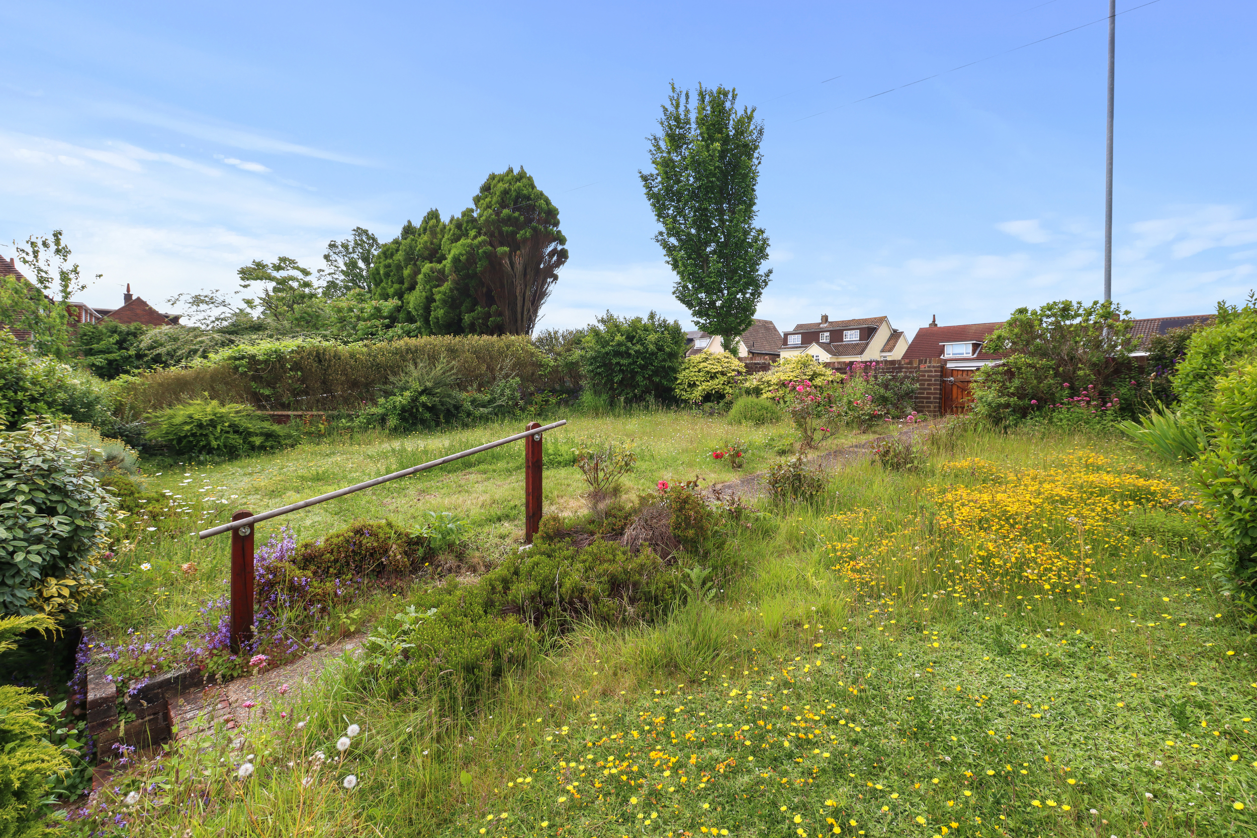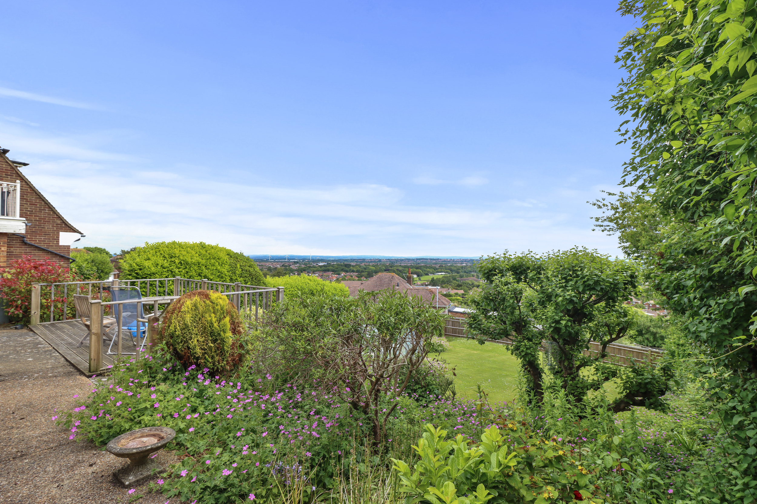 The rear garden is a private and stunning sanctuary. It features a lovely decking area adjoining the property, perfect for alfresco dining and enjoying the outdoors. Beyond the decking, a spacious lawn is surrounded by beautiful flower borders, lush shrubbery, and mature trees, creating a serene and picturesque setting.