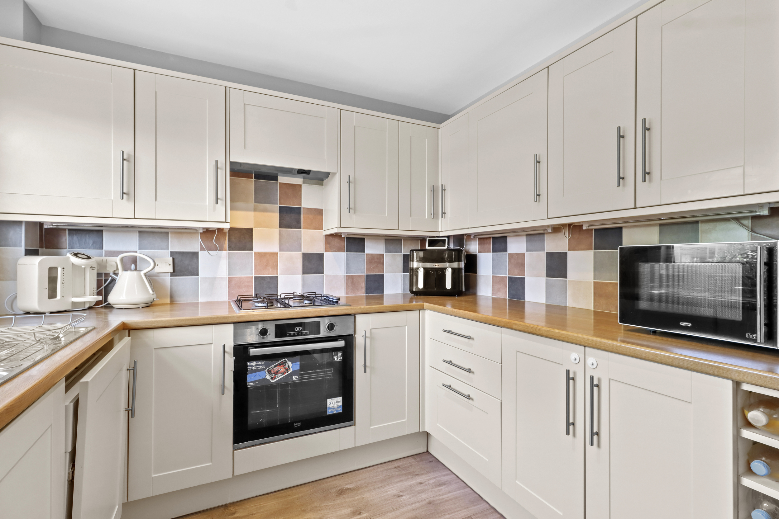 Adjacent to the living room is the separate kitchen, a well-appointed space designed for functionality and style. The kitchen features ample counter space and an array of cupboards and drawers, ensuring you have plenty of storage for all your culinary needs. Modern appliances, including an oven, hob, and extractor fan, make cooking a pleasure. The kitchen's layout maximizes efficiency and convenience, whether you're preparing a quick breakfast or a gourmet dinner.