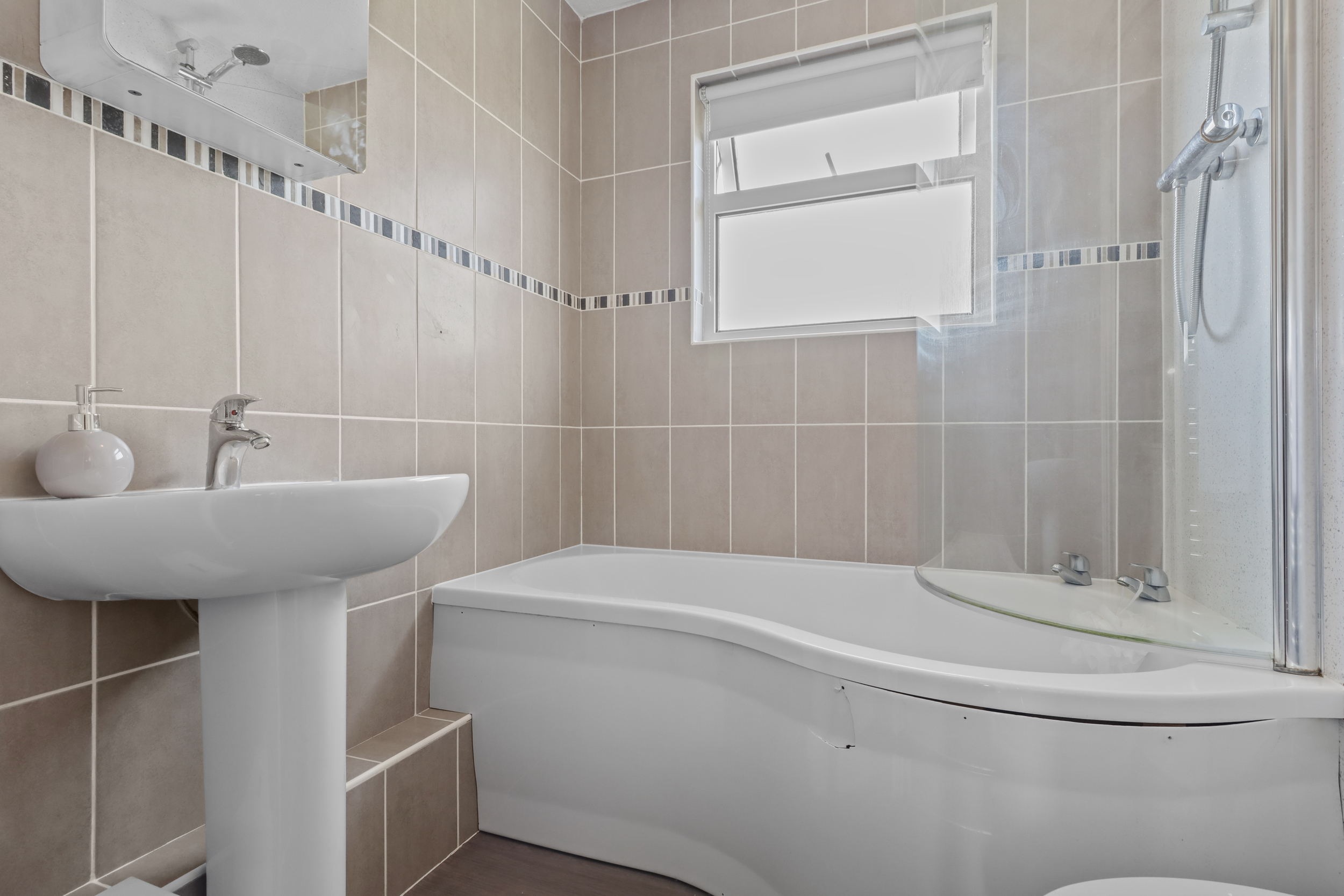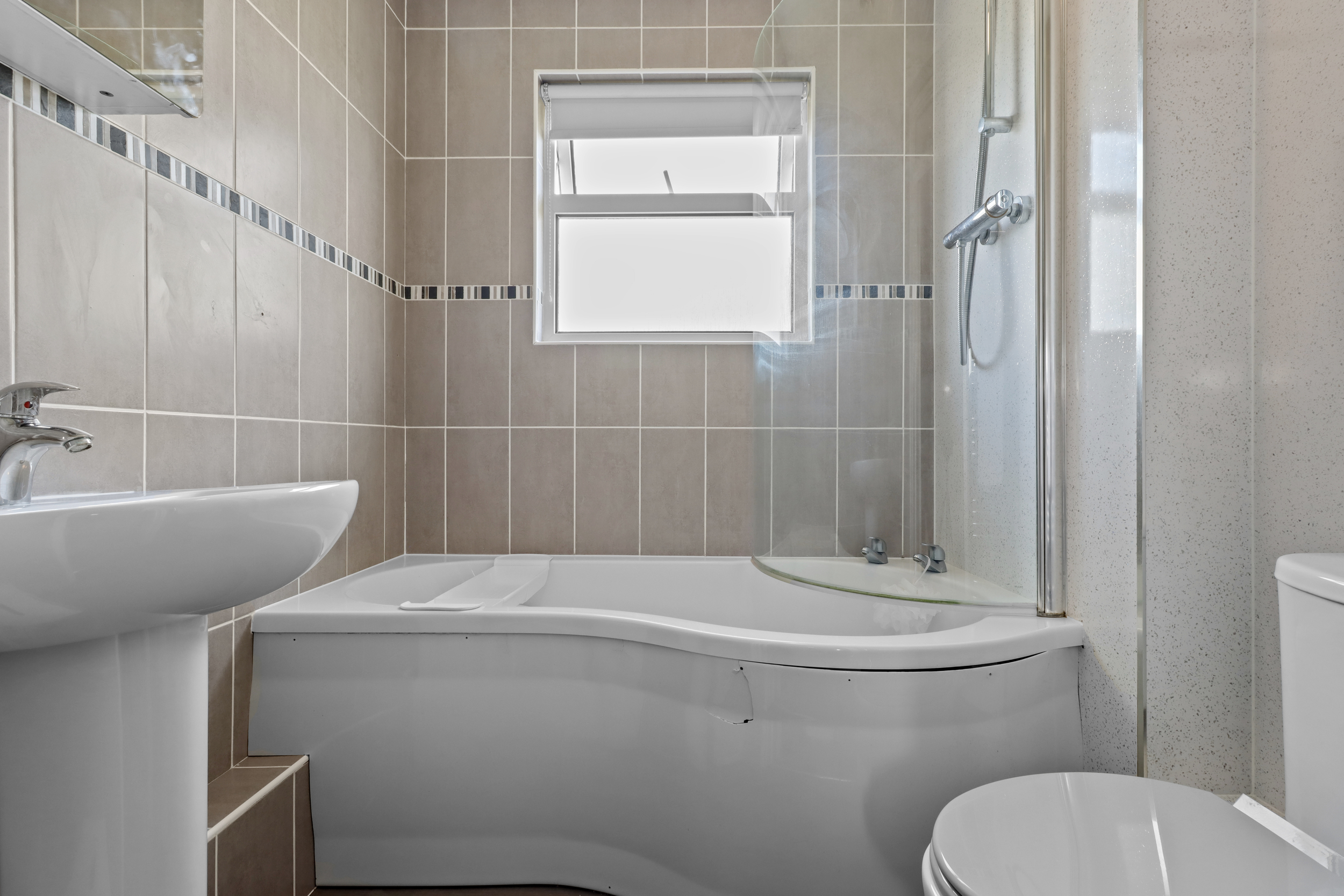 The modern bathroom is fitted with a panelled enclosed bath, a close-coupled WC, and a wash hand basin. The contemporary fittings and fixtures provide a fresh and clean environment.