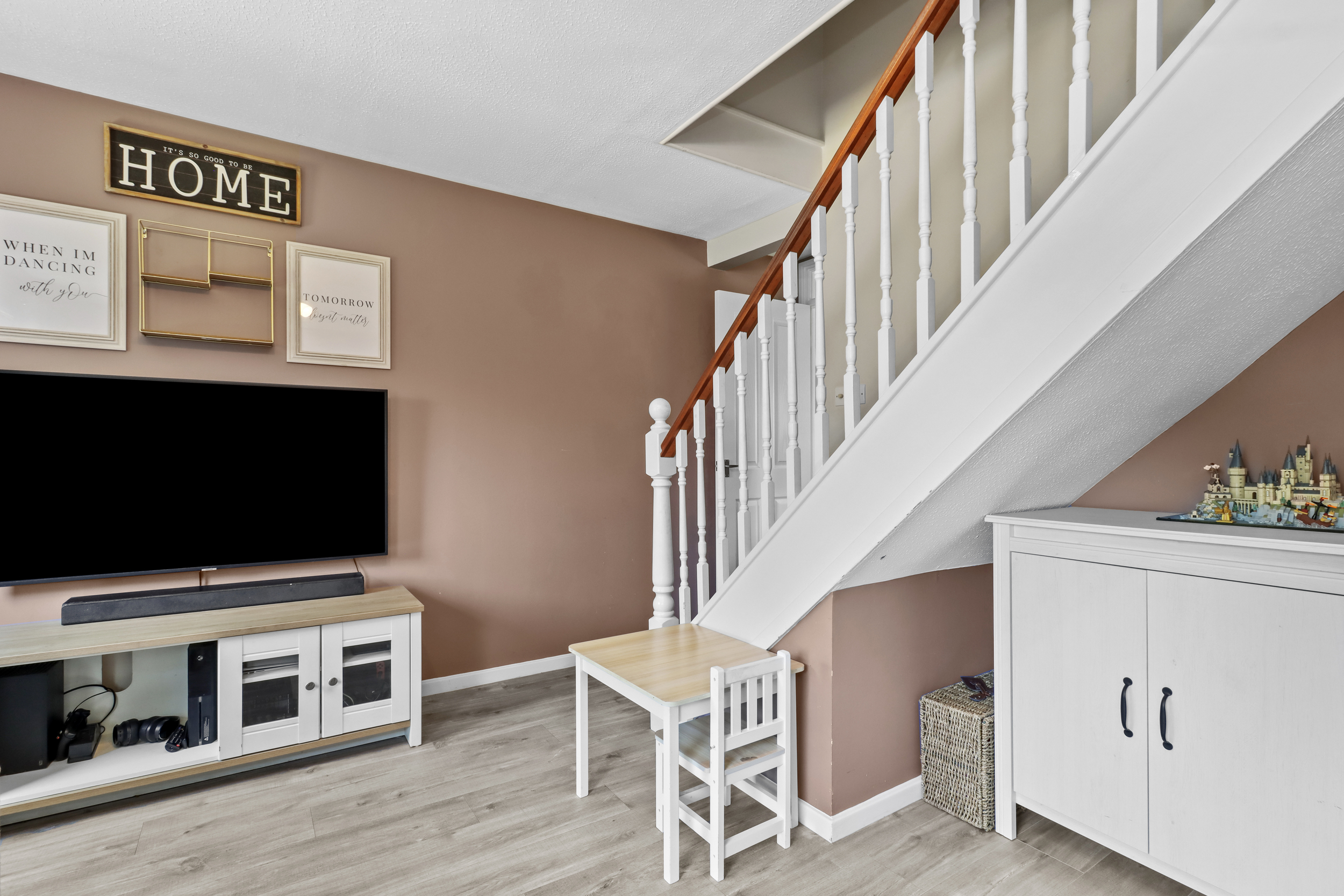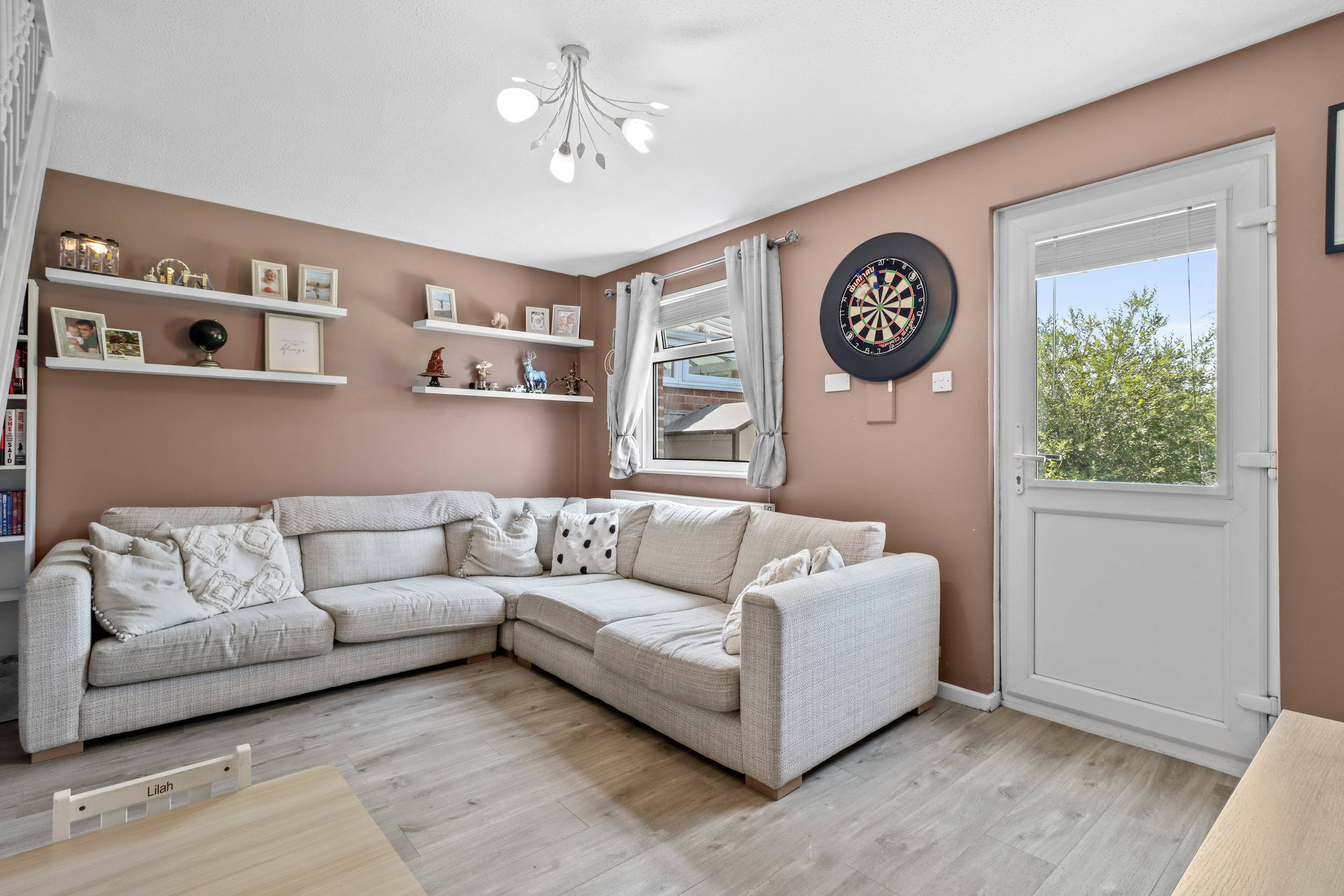 The heart of the home is the expansive living room/dining room, offering a versatile space that caters to both relaxation and entertainment. The living area is bathed in natural light, creating a bright and airy ambiance. Large windows and a door leading to the rear garden enhance the connection to the outdoor space. This room is perfect for family gatherings, dinner parties, or simply unwinding after a long day. The neutral decor and quality flooring provide a blank canvas for personal touches and furnishings.