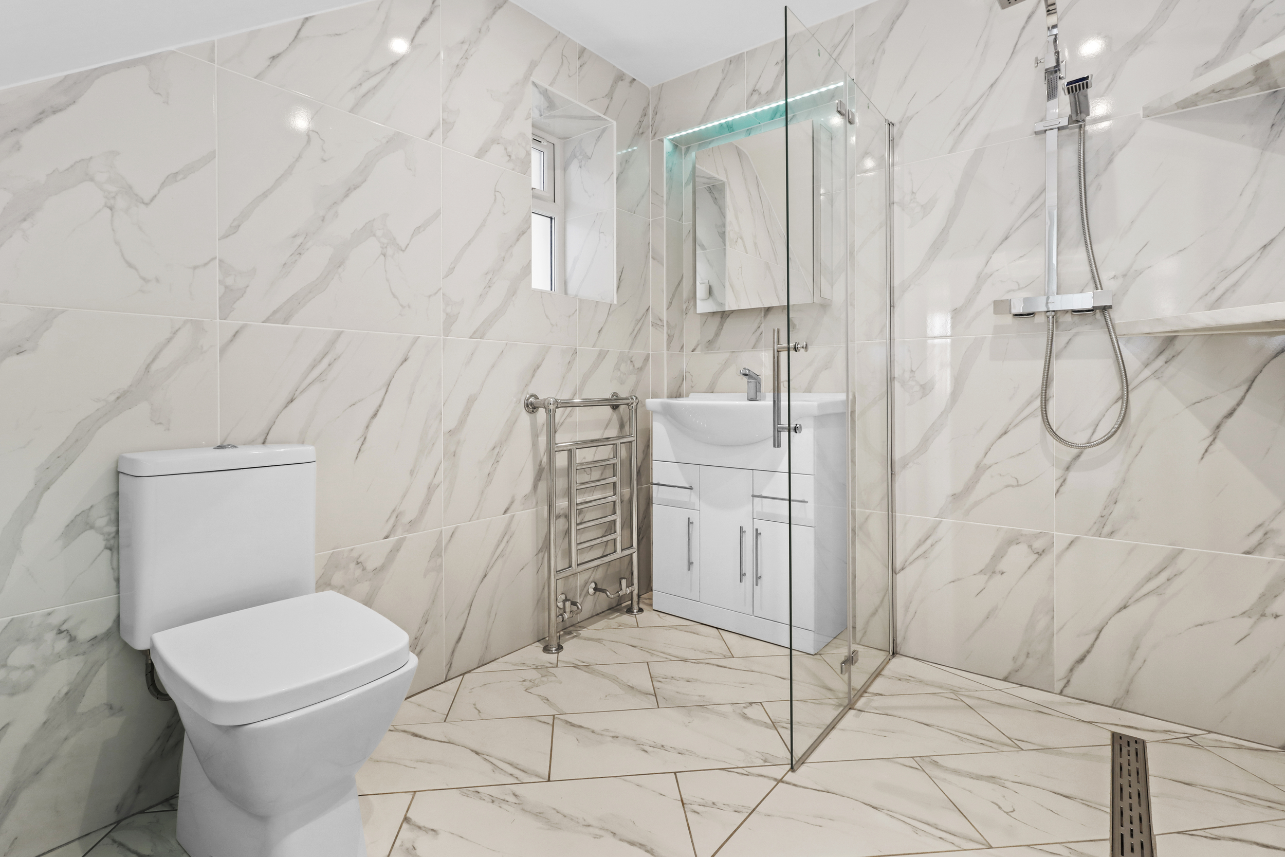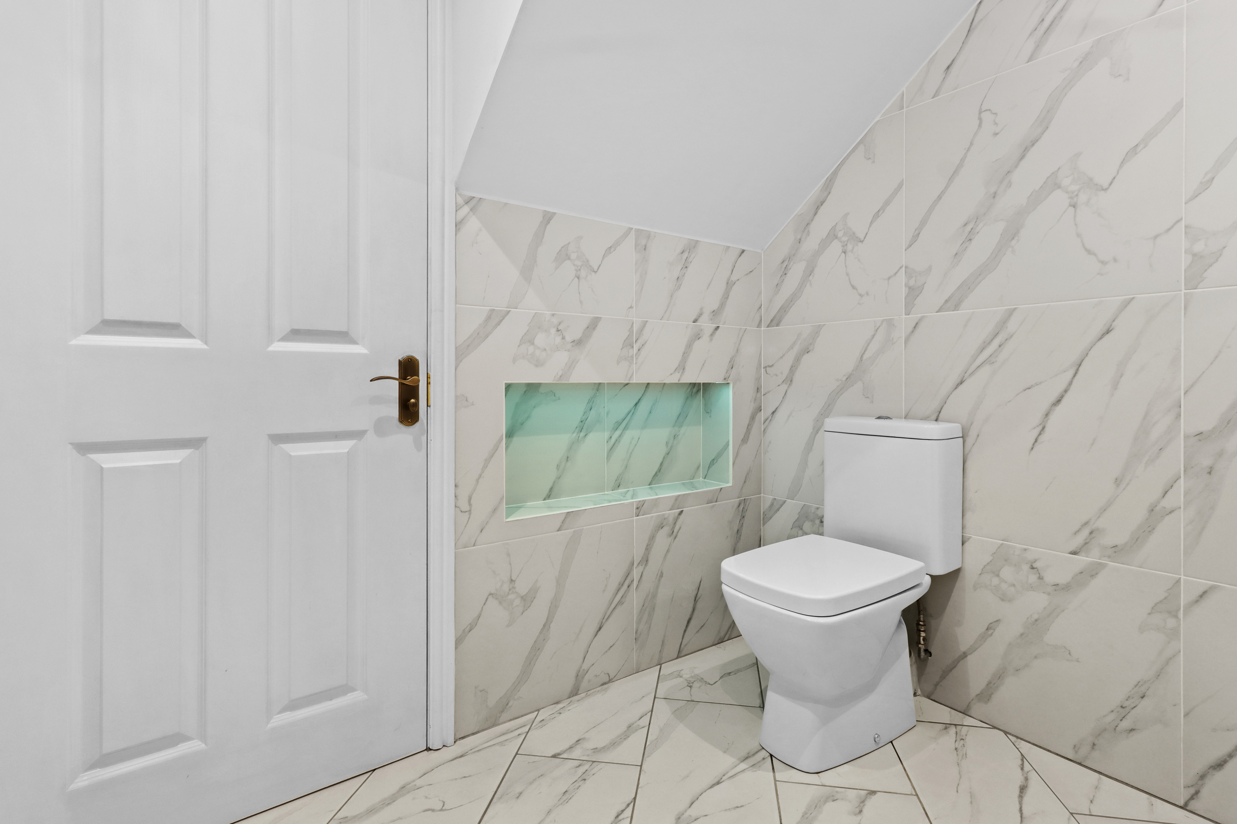 The newly fitted shower room exudes modern elegance. It is equipped with a walk-in shower cubicle, a close-coupled WC, and a wash hand basin. The high-quality finishes and contemporary design elements ensure a luxurious and relaxing feel.