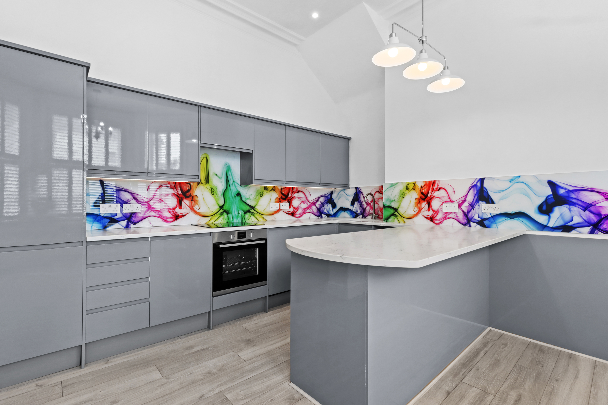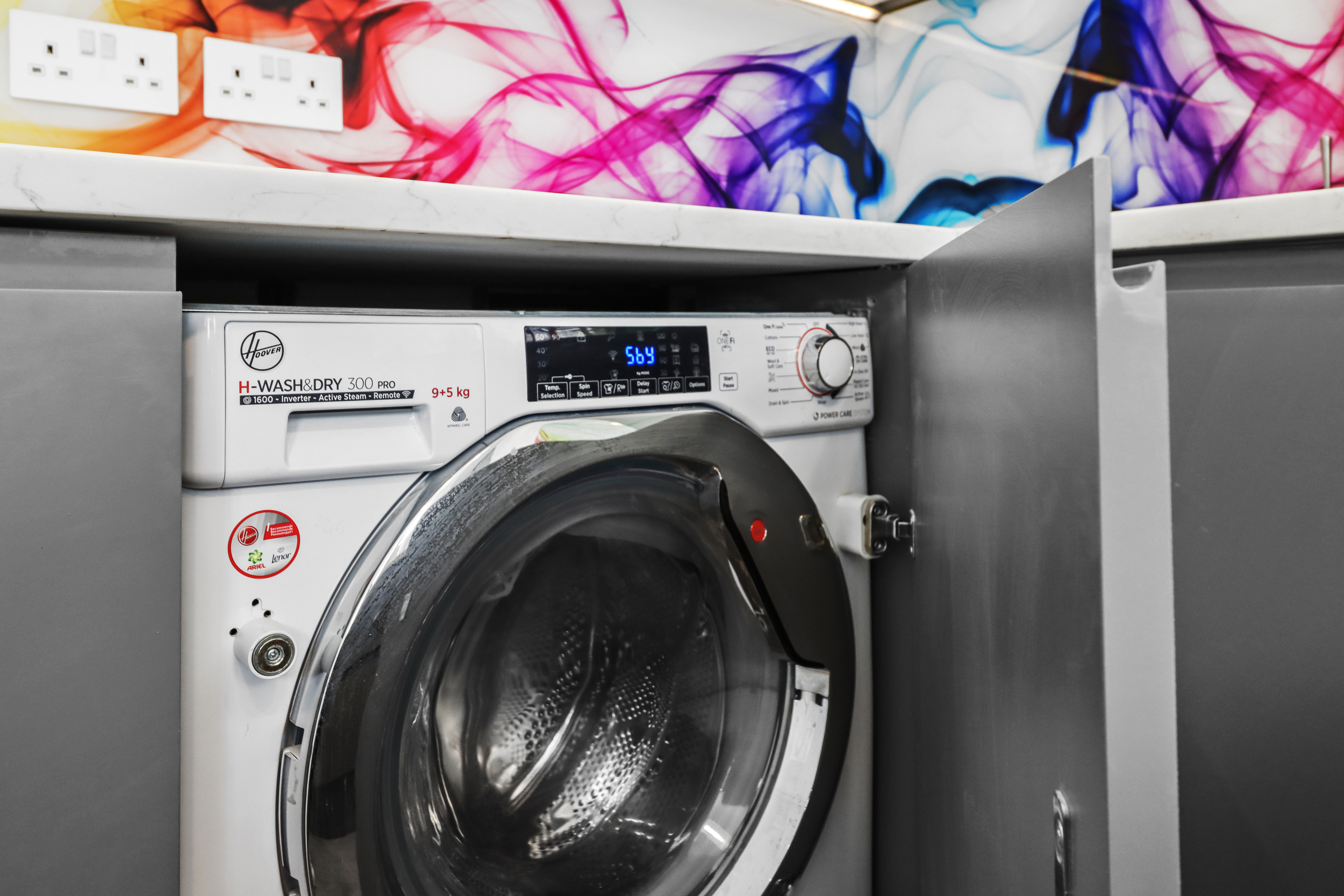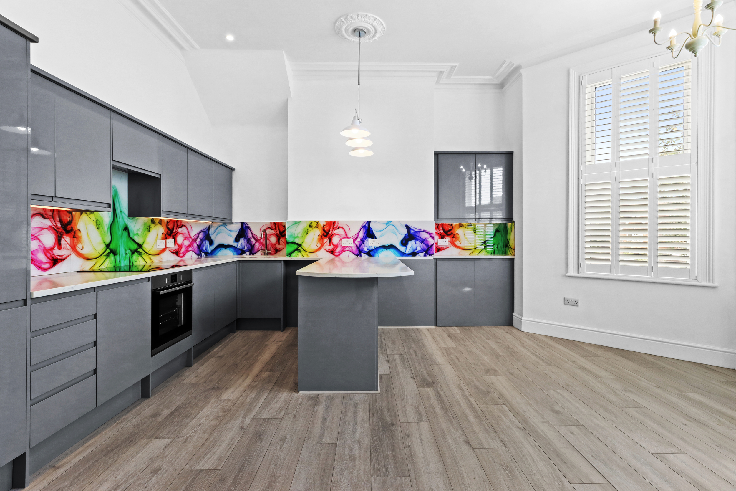The heart of this home is the open-plan living room and kitchen. A large bay window with shutters bathes the room in natural light, creating a warm and inviting atmosphere. The newly fitted kitchen is a chef’s delight, equipped with high-quality Neff appliances, including an oven and an induction hob with an extractor hood. An integrated slimline dishwasher, washing machine, and under-counter fridge ensure convenience, while a breakfast bar area provides a perfect spot for casual dining.