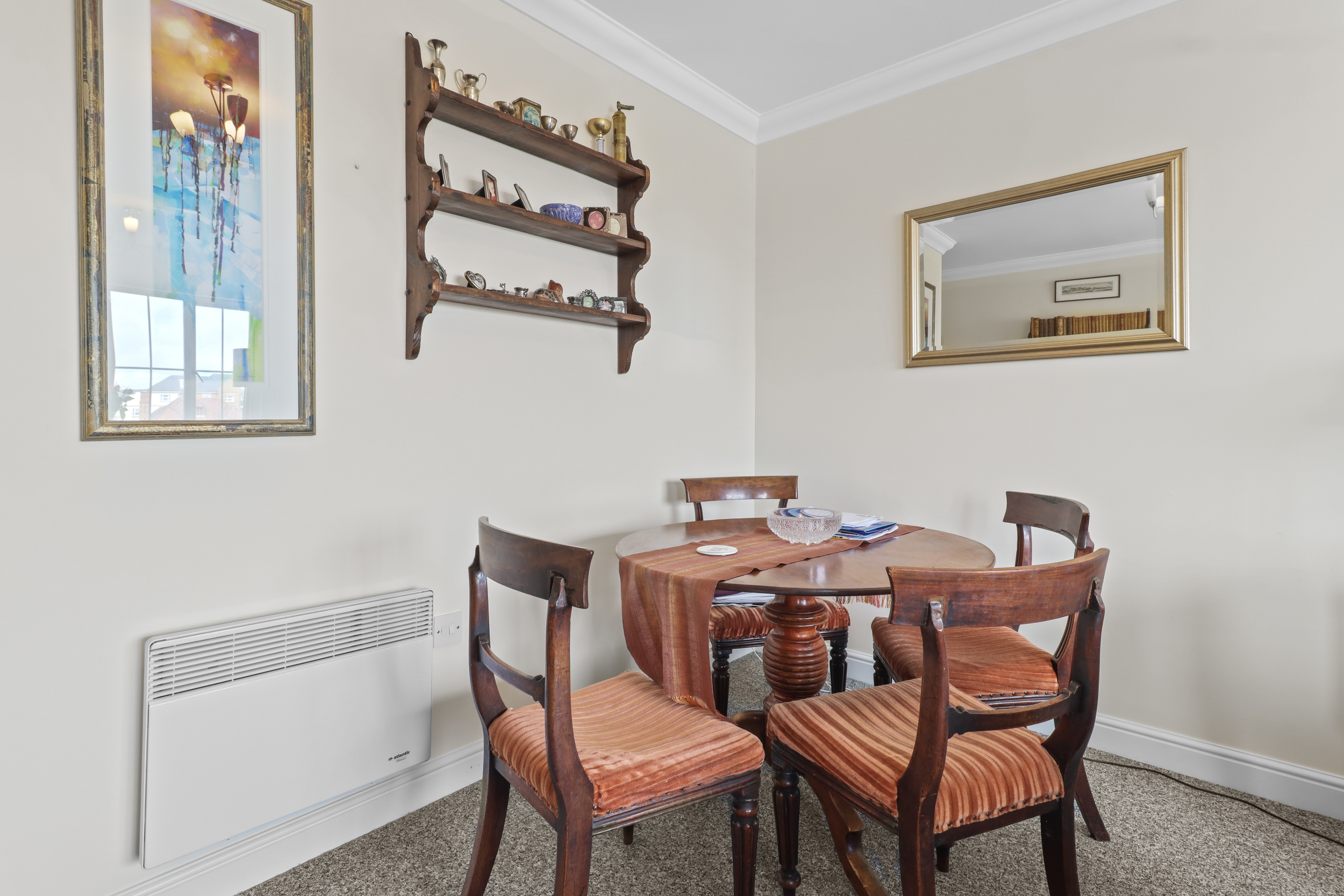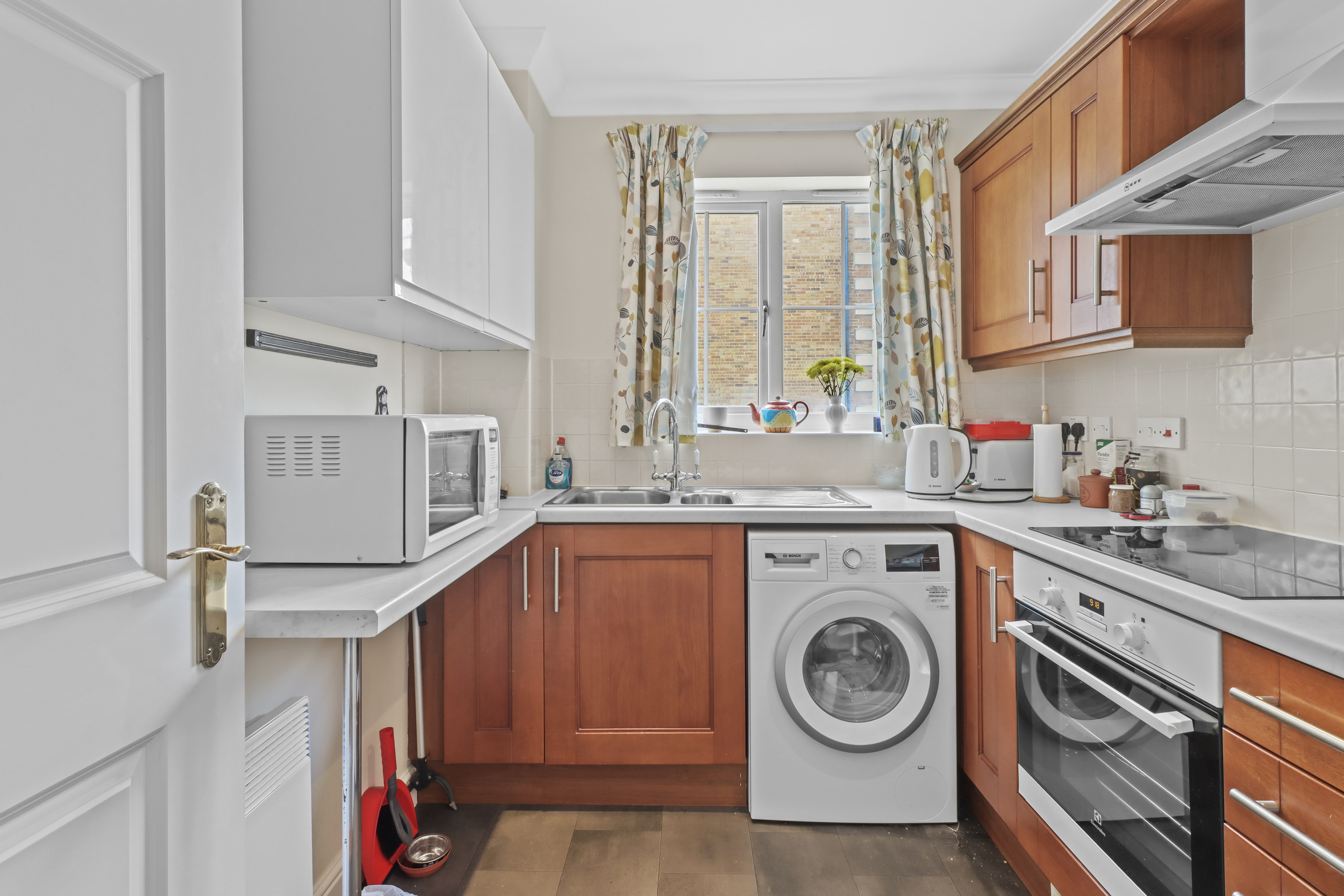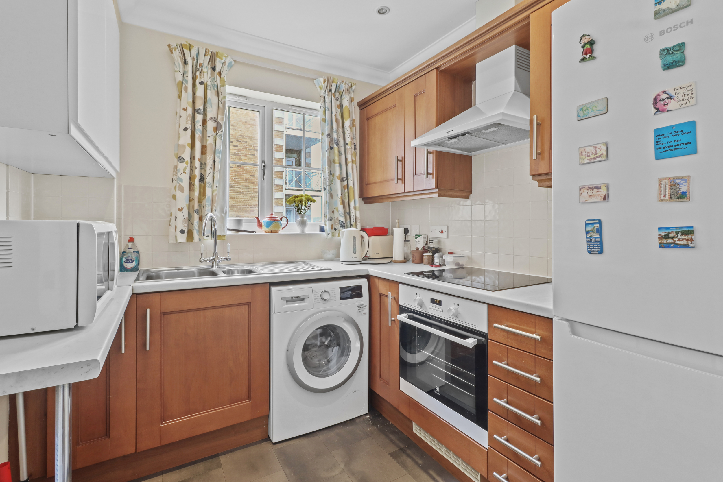 Adjacent to the living room, the separate kitchen is both practical and stylish. It is well-equipped with an array of wall-mounted and base units, offering plenty of storage for kitchen essentials. The kitchen features a built-in oven, hob, and extractor hood, complemented by space for a washing machine and fridge freezer. The thoughtful layout ensures a seamless cooking experience while maintaining an elegant aesthetic.