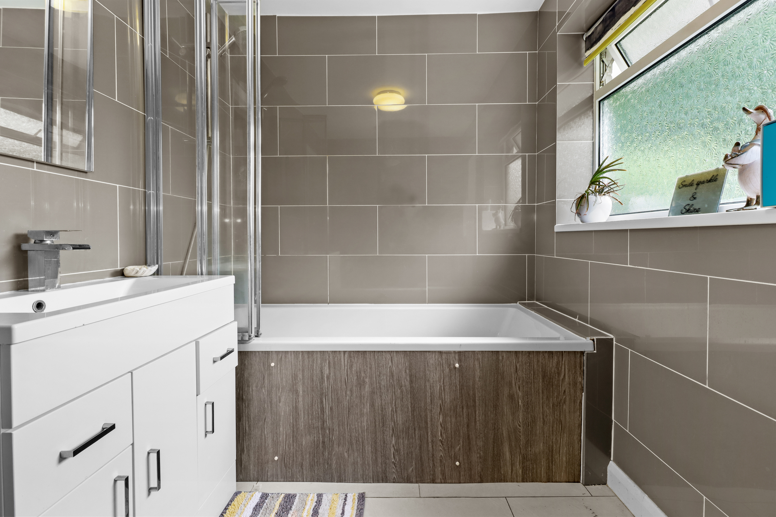 The contemporary bathroom is well-appointed with a panel-enclosed bath, a close-coupled WC, and a wash hand basin, designed for both practicality and style.