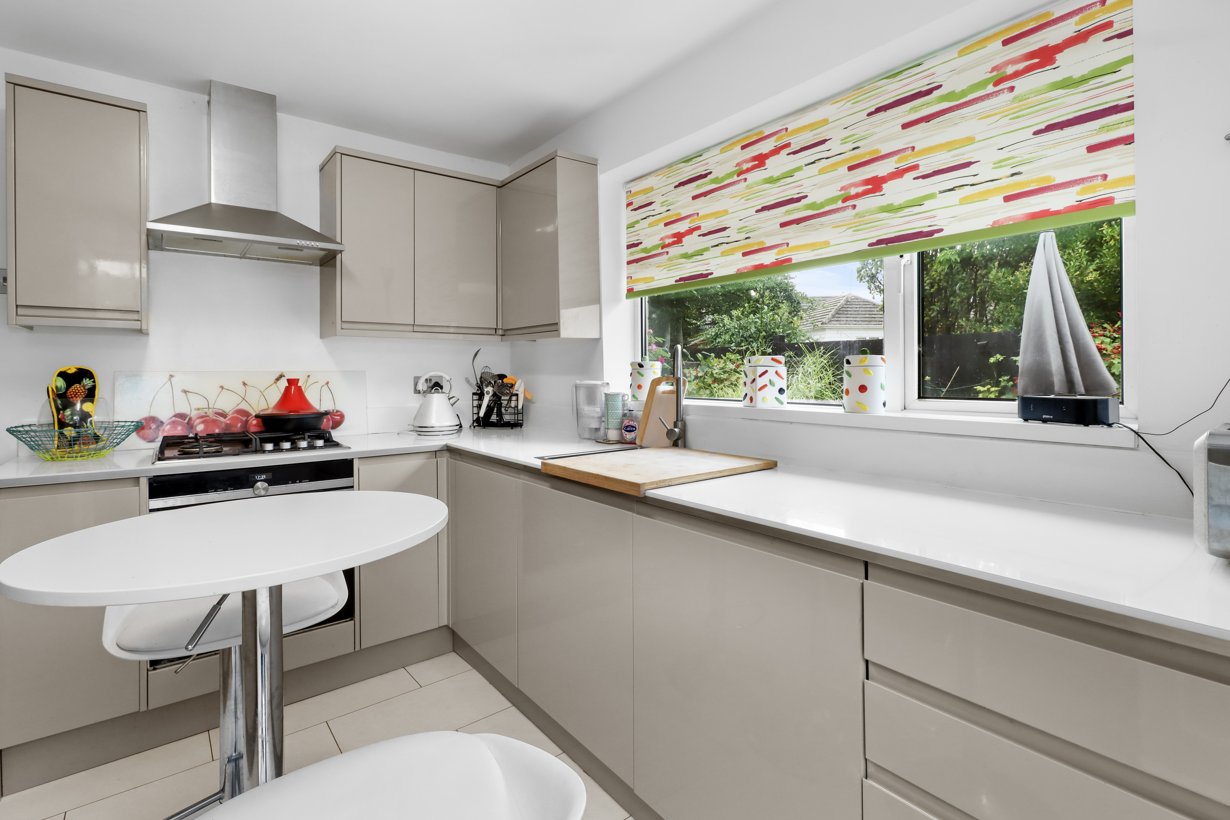 Continuing through the home, you’ll discover the separate kitchen, which has been thoughtfully designed to combine modern convenience with timeless style. The kitchen is equipped with an array of sleek, contemporary units that provide ample storage and workspace. The integrated appliances include a four-ring gas hob with an extractor hood, an electric oven, a dishwasher, and a fridge/freezer—all seamlessly integrated to maintain the clean, uncluttered aesthetic.