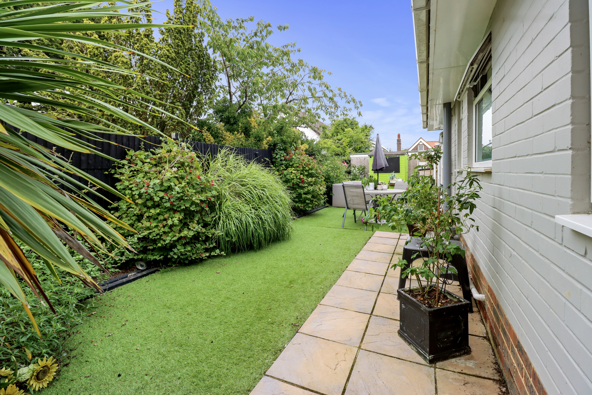 The garden is bordered by well-tended shrubs, adding a touch of nature to the space and creating a peaceful, verdant backdrop. Whether you’re entertaining guests, enjoying a quiet morning coffee, or simply soaking up the sun, this garden provides the perfect setting. The lean-to dining room enhances the connection to the outdoors, making alfresco dining a regular pleasure.