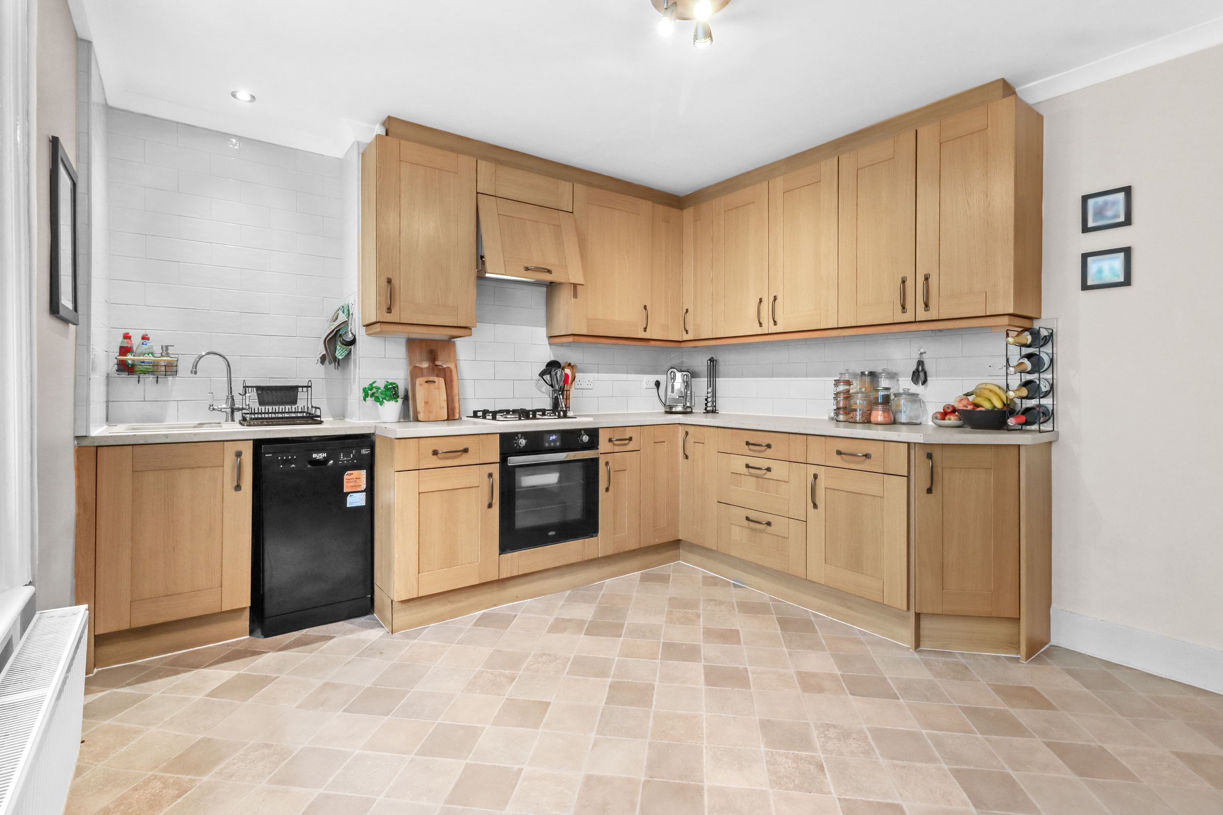 The separate kitchen is well-appointed with a range of matching wall-mounted and base units, offering ample storage and workspace. It comes equipped with a built-in electric oven, a four-ring gas hob, and an extractor hood. There's also space for a freestanding dishwasher and a built-in understairs cupboard that conveniently houses a freestanding fridge freezer. The kitchen is spacious enough to accommodate a dining table, making it an ideal space for family meals. A double-glazed door from the kitchen leads to the utility room, which provides additional space and plumbing for a washing machine. The utility room also grants access to the rear garden and includes a ground floor cloakroom fitted with a close-coupled WC and a wall-mounted wash hand basin.