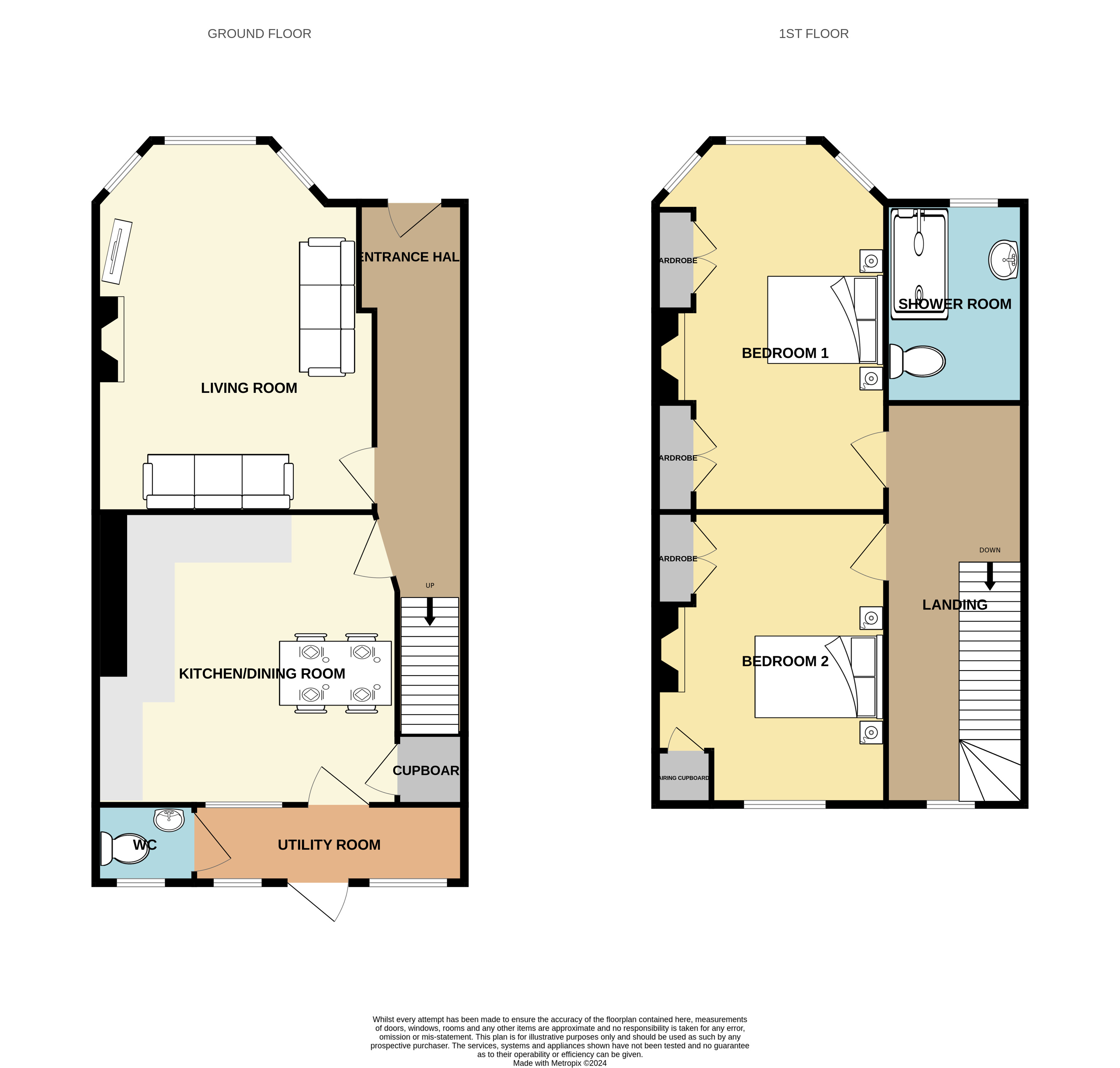 Ascending the stairs to the first floor, you'll find two well-proportioned bedrooms and a modern shower room. The front-facing master bedroom boasts a double-glazed bay window and two fitted wardrobes, offering plenty of storage, whilst the second bedroom overlooks the rear garden. The contemporary shower room is stylishly finished with a a walk-in shower cubicle, WC, and wash hand basin.