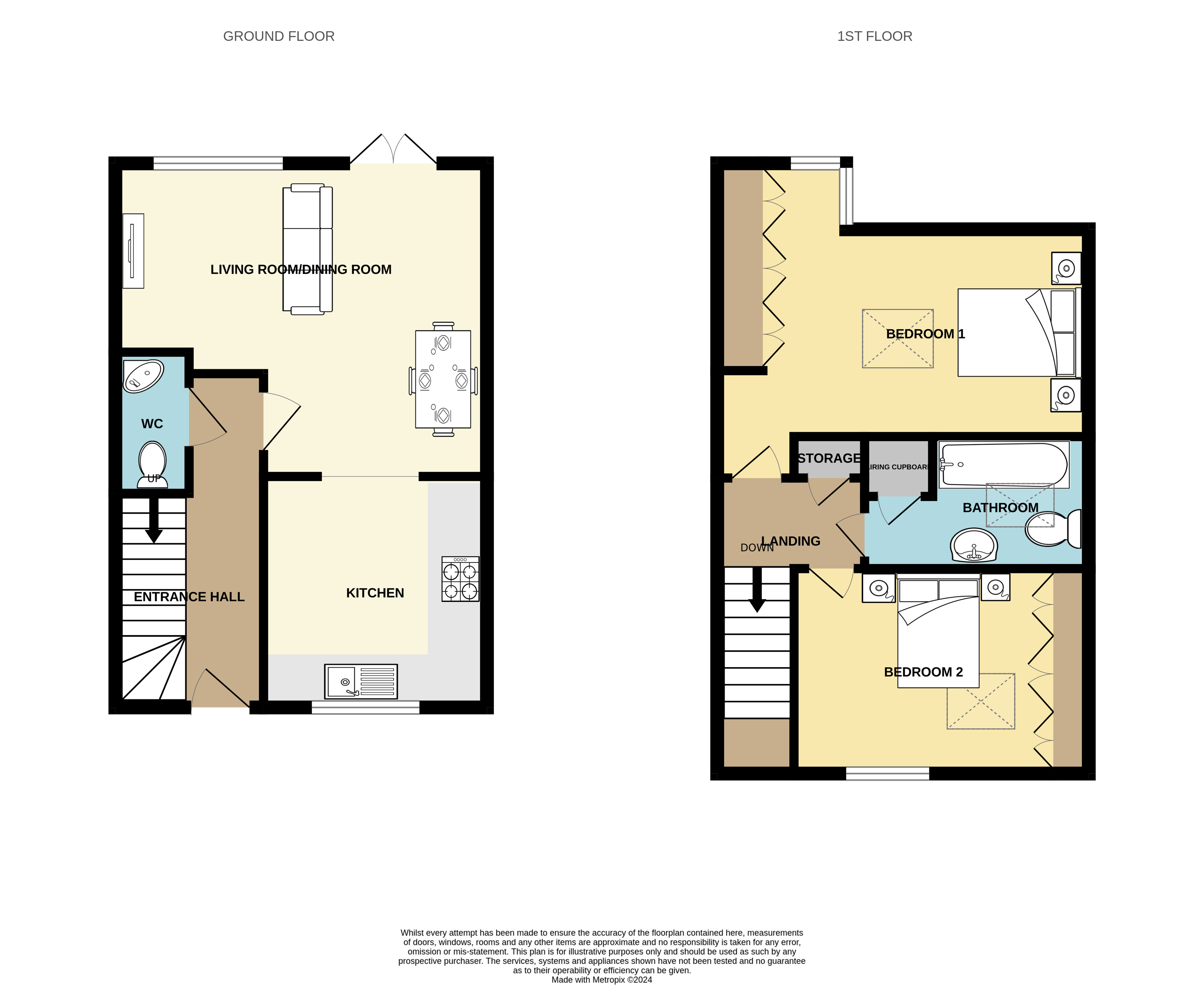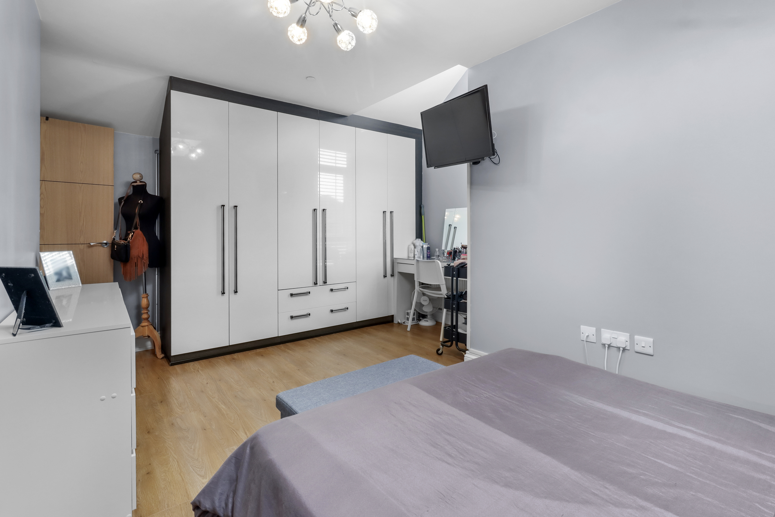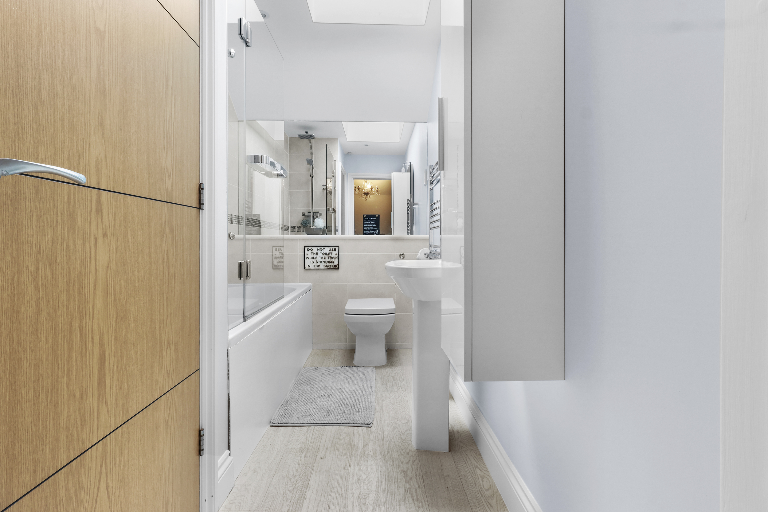 Ascending the stairs to the first floor, you will find two generously sized bedrooms and a modern bathroom. Bedroom one, positioned at the rear, features built-in wardrobes, whilst bedroom two, located at the front, includes a vast selection of wardrobes and a cleverly integrated pull-down bed that folds away into the wardrobe, offering flexibility and space-saving solutions. The bathroom is fitted with a modern three-piece suite, including a bath, close-coupled WC, and wash hand basin.