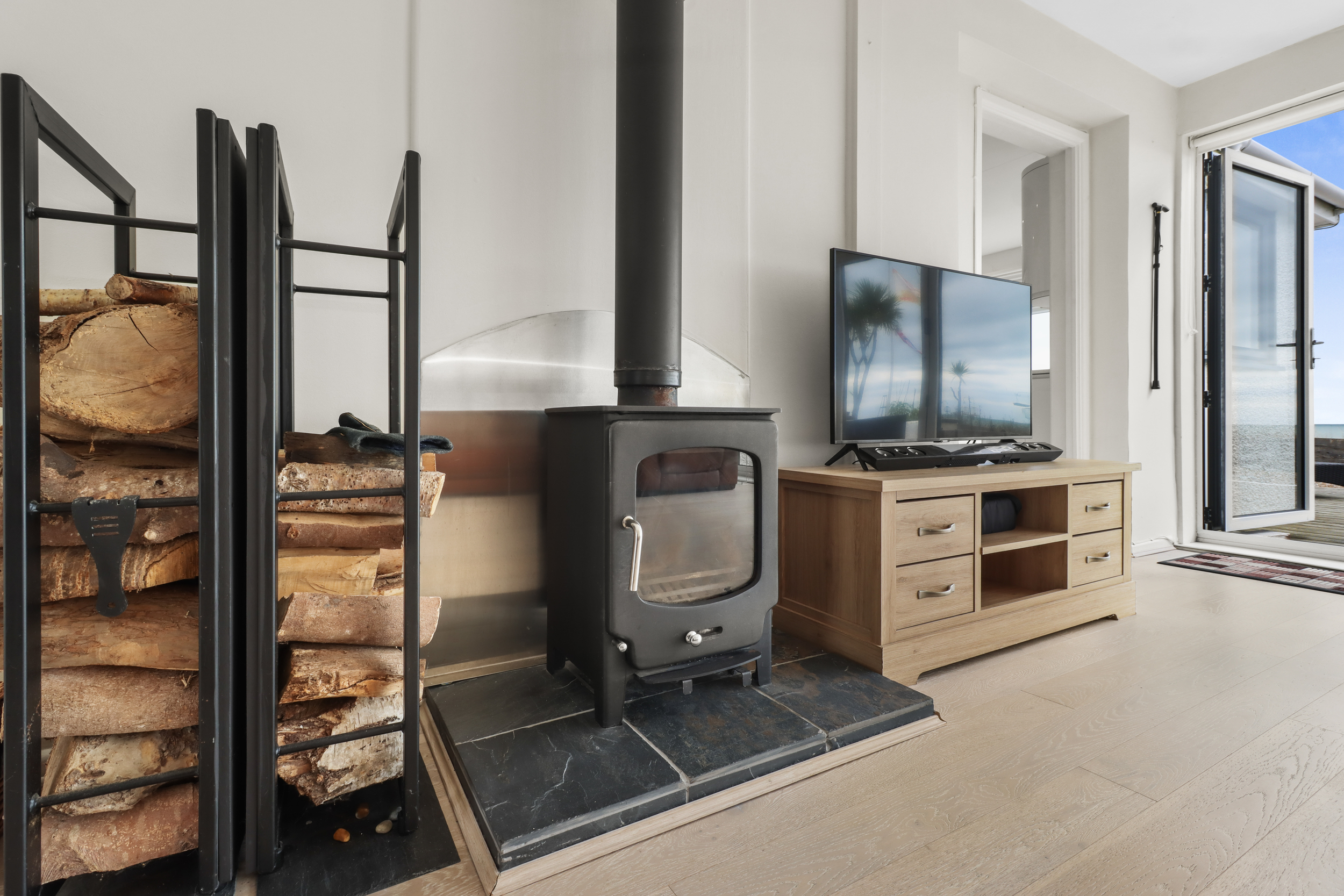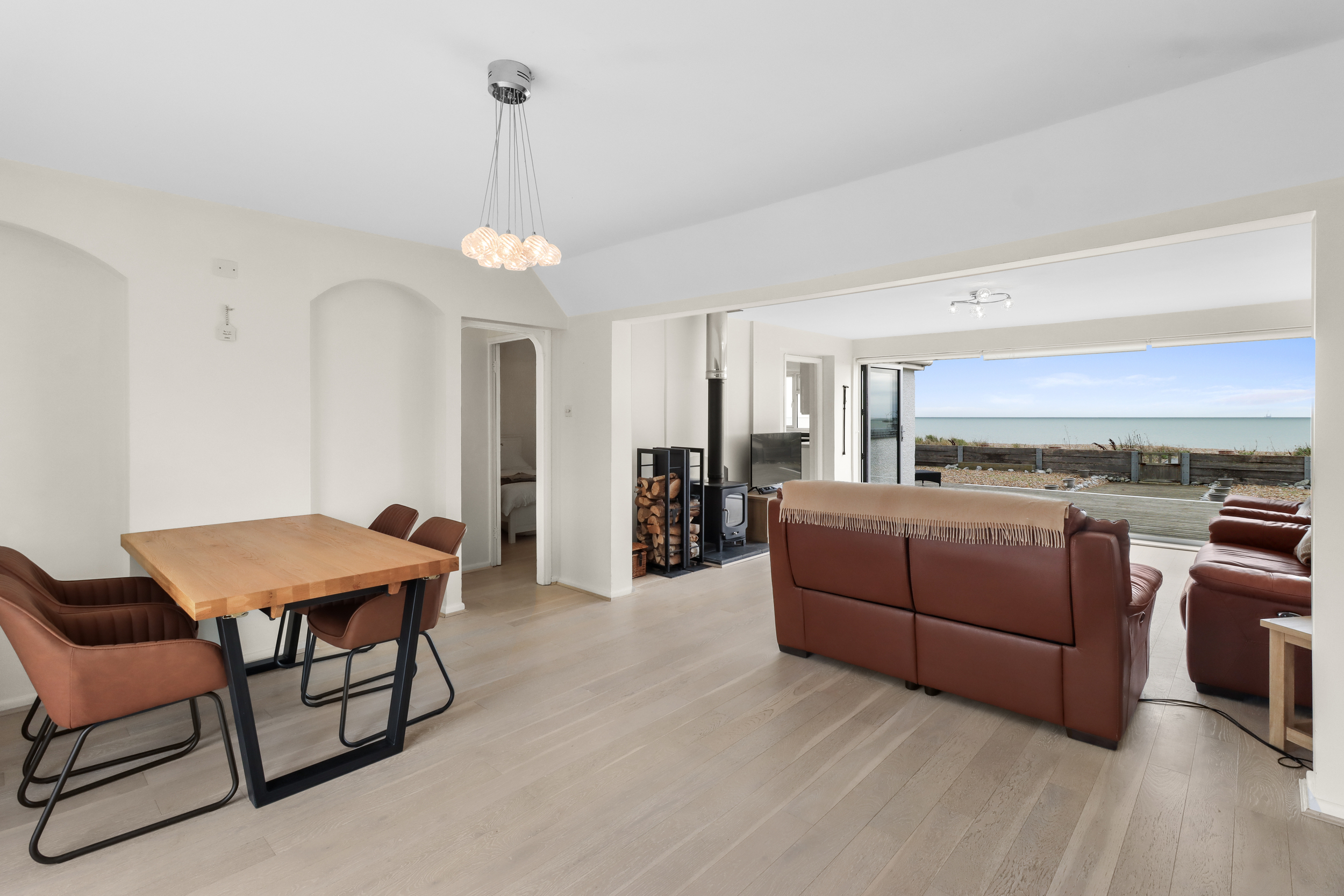 As you enter the property, you are greeted by a spacious and light-filled dining area that flows seamlessly into the impressive living room. The living space is enhanced by a feature wood burner and large bi-folding doors, providing uninterrupted views of the garden and beach beyond. These doors lead onto a generous decked area in the private garden, offering direct access to the stony shores.
