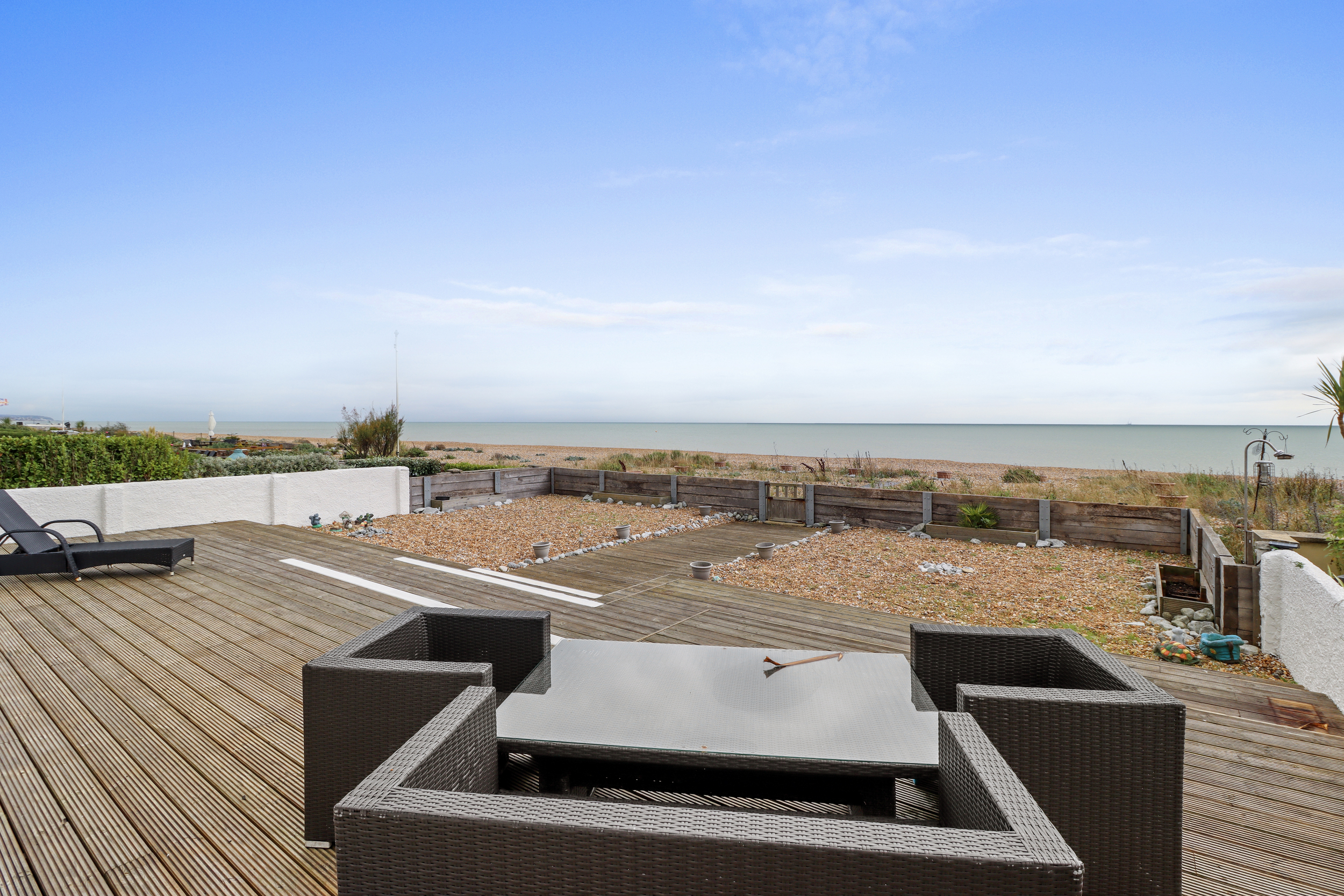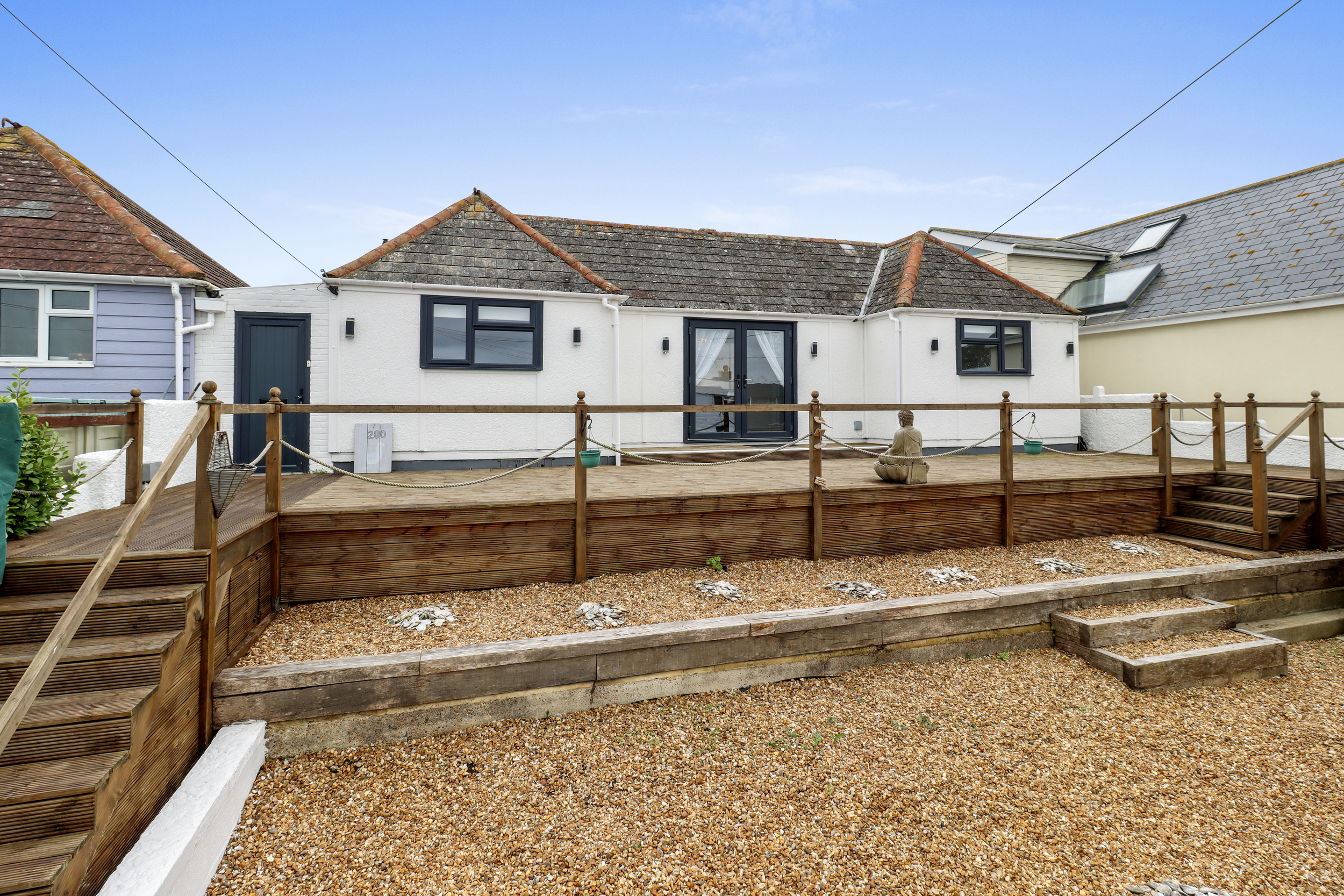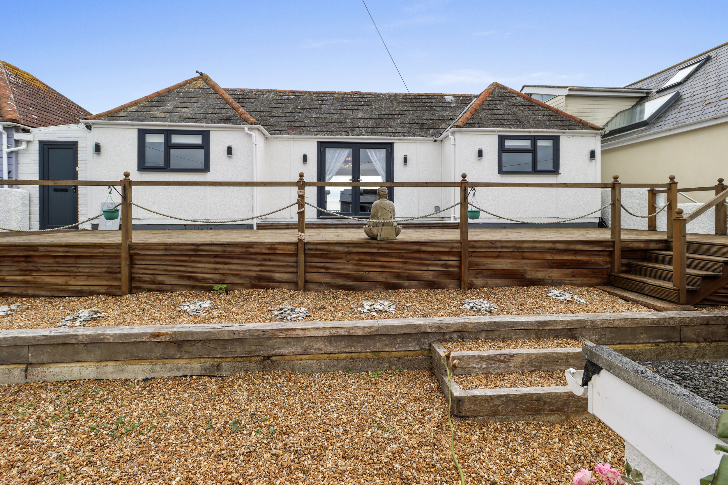 The rear of the property is where the magic of coastal living truly comes to life. Stepping out through the bi-folding doors, you are greeted by an expansive wooden deck that extends the full width of the home. This outdoor space is perfect for enjoying warm summer evenings, dining alfresco, or simply soaking in the views of the beach.