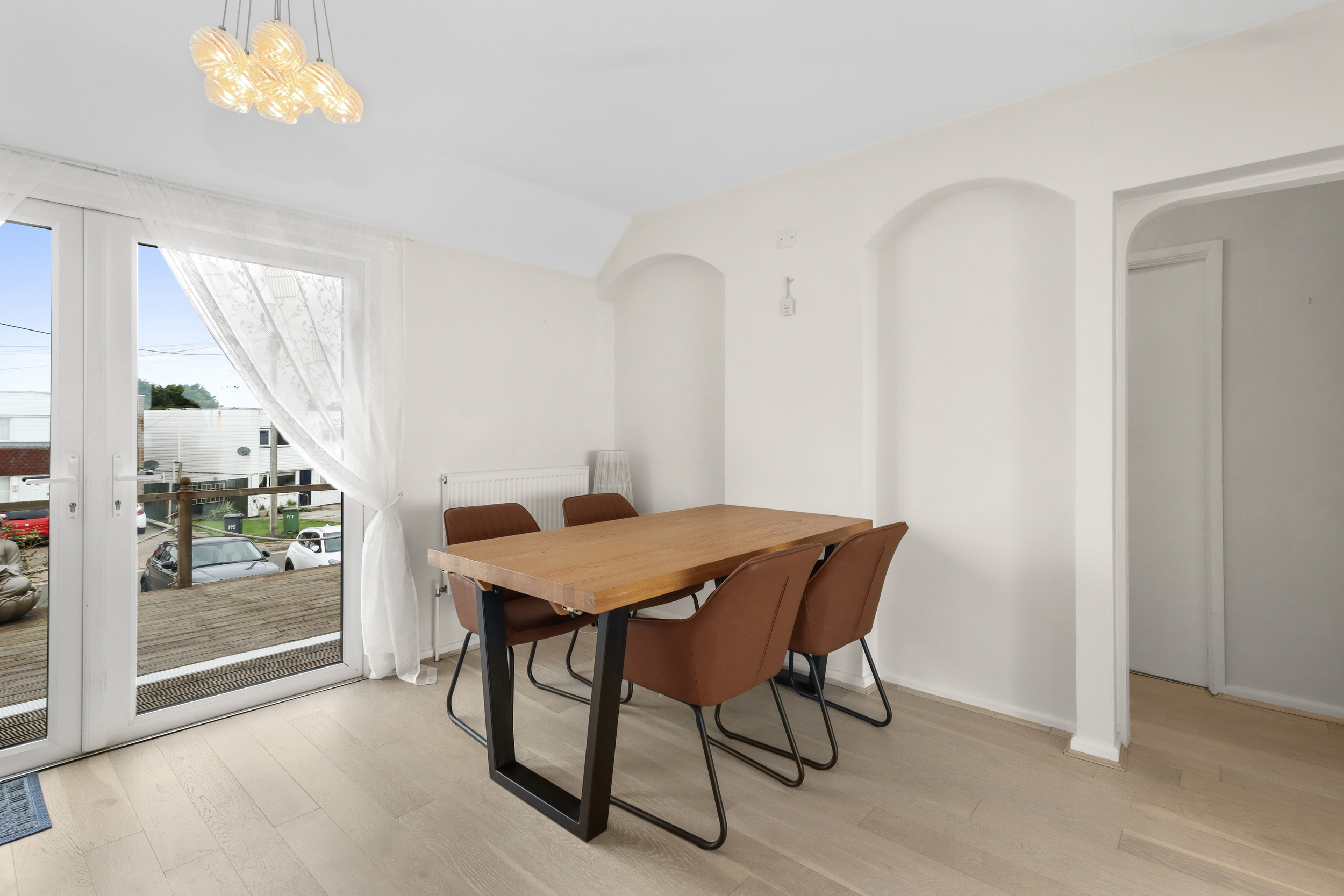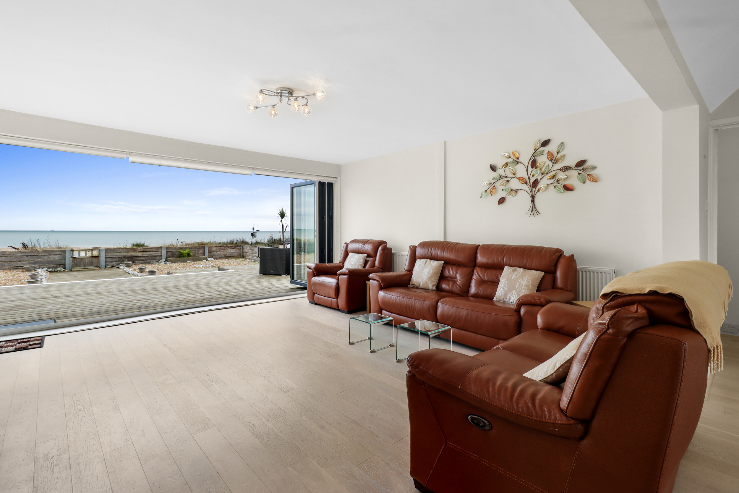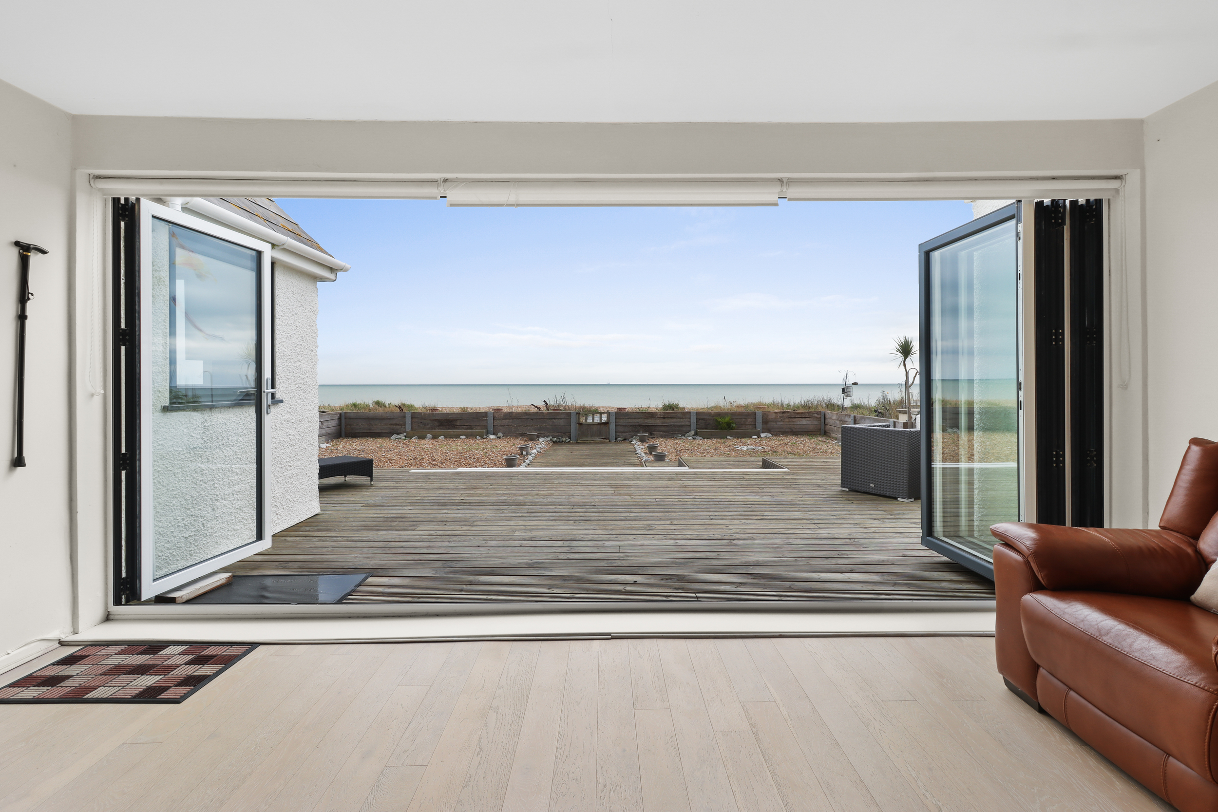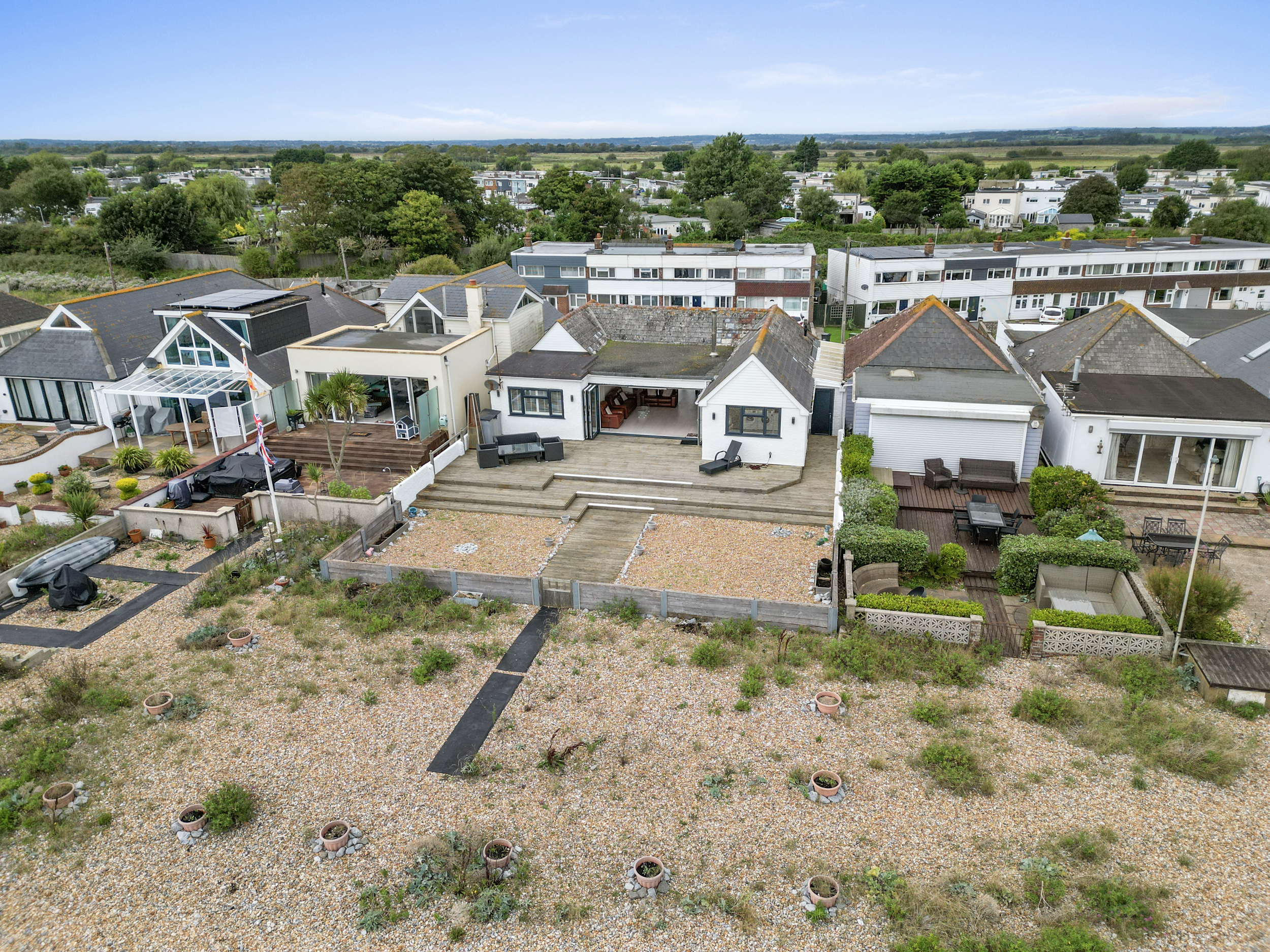 The rear of the property is where the magic of coastal living truly comes to life. Stepping out through the bi-folding doors, you are greeted by an expansive wooden deck that extends the full width of the home. This outdoor space is perfect for enjoying warm summer evenings, dining alfresco, or simply soaking in the views of the beach.