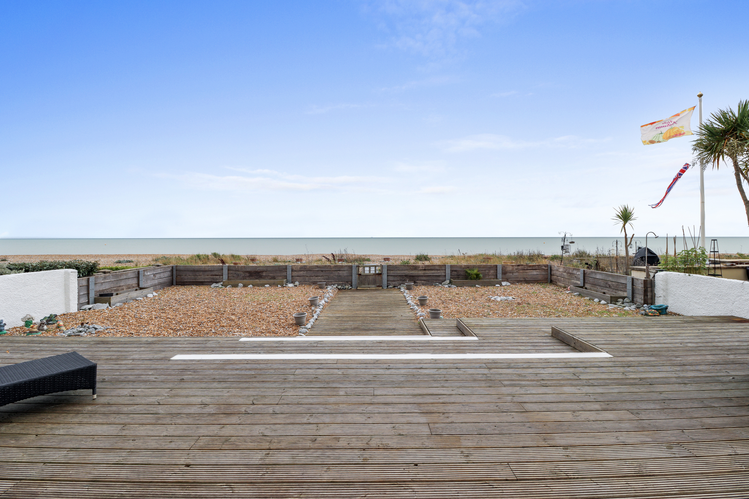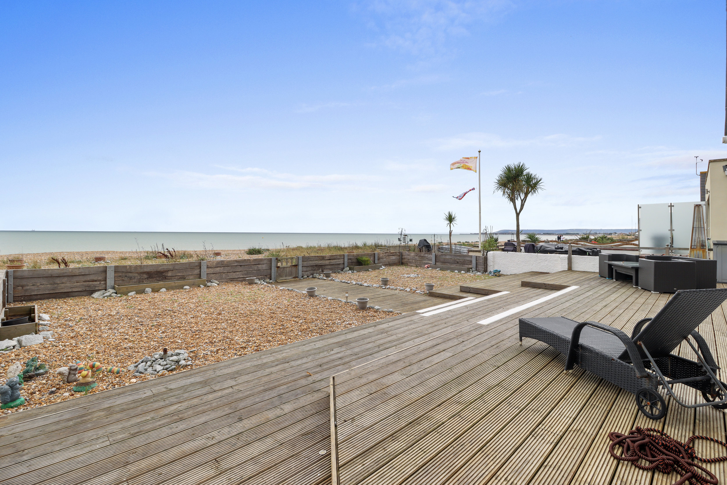 Beyond the deck, the garden features a low-maintenance stone area that leads directly to the private beach access. This unique feature allows you to step straight from your garden onto the sandy shore—a privilege reserved for a select few. Whether you’re a lover of morning swims, sunset walks, or just relaxing by the sea, the convenience of this private access is unparalleled.