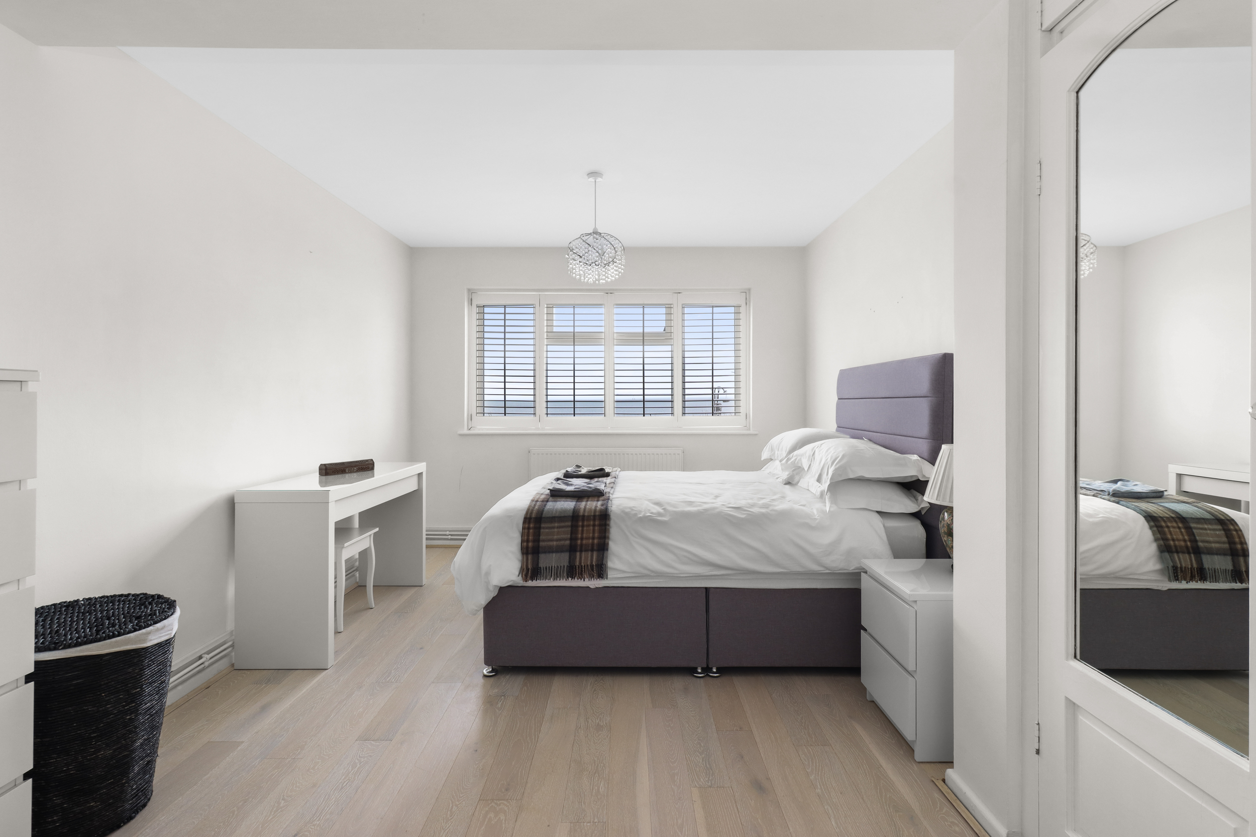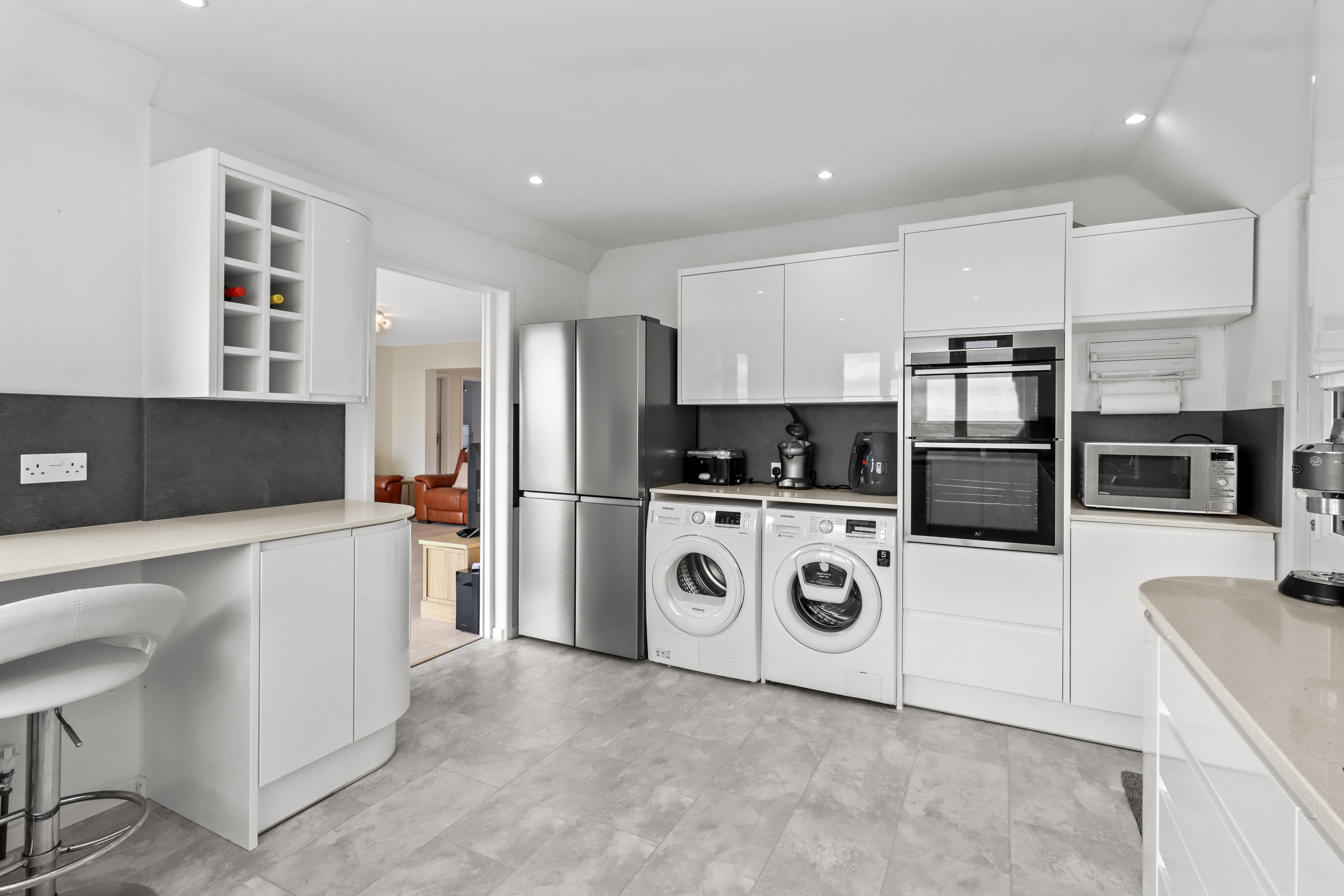 The kitchen, located just off the living room, has been thoughtfully designed to combine modern convenience with a touch of coastal charm. Sleek, high-end cabinetry and countertops are complemented by integrated appliances, creating a functional yet stylish cooking space. The real highlight of the kitchen is its stunning views: large windows provide sweeping vistas of both the side and rear gardens, as well as the beach and sea, allowing you to enjoy the natural beauty while you prepare meals.