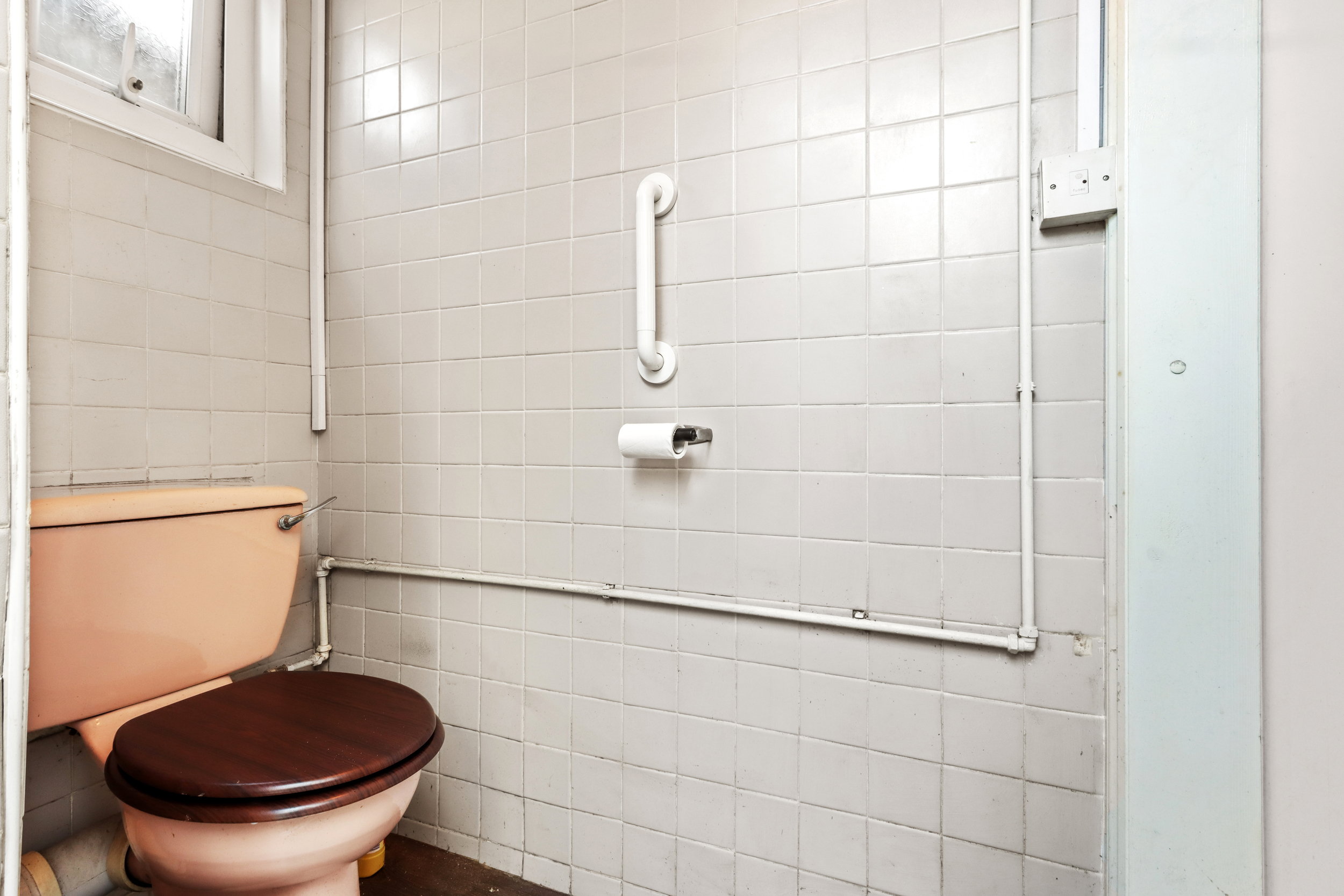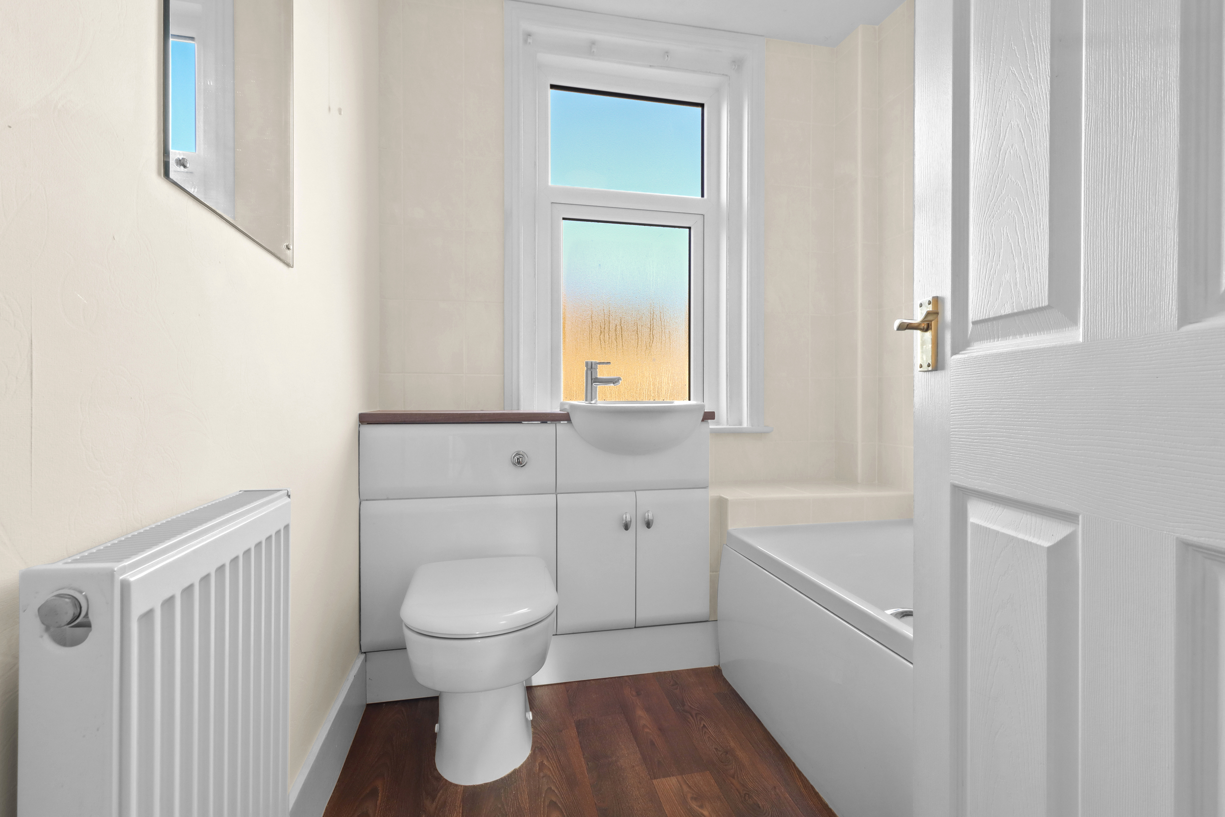 The family bathroom has been tastefully updated with a modern white three-piece suite. It features a panel-enclosed bath with a shower over, a wash hand basin, and a WC. The neutral colour palette and sleek fixtures offer a fresh and relaxing space to unwind.