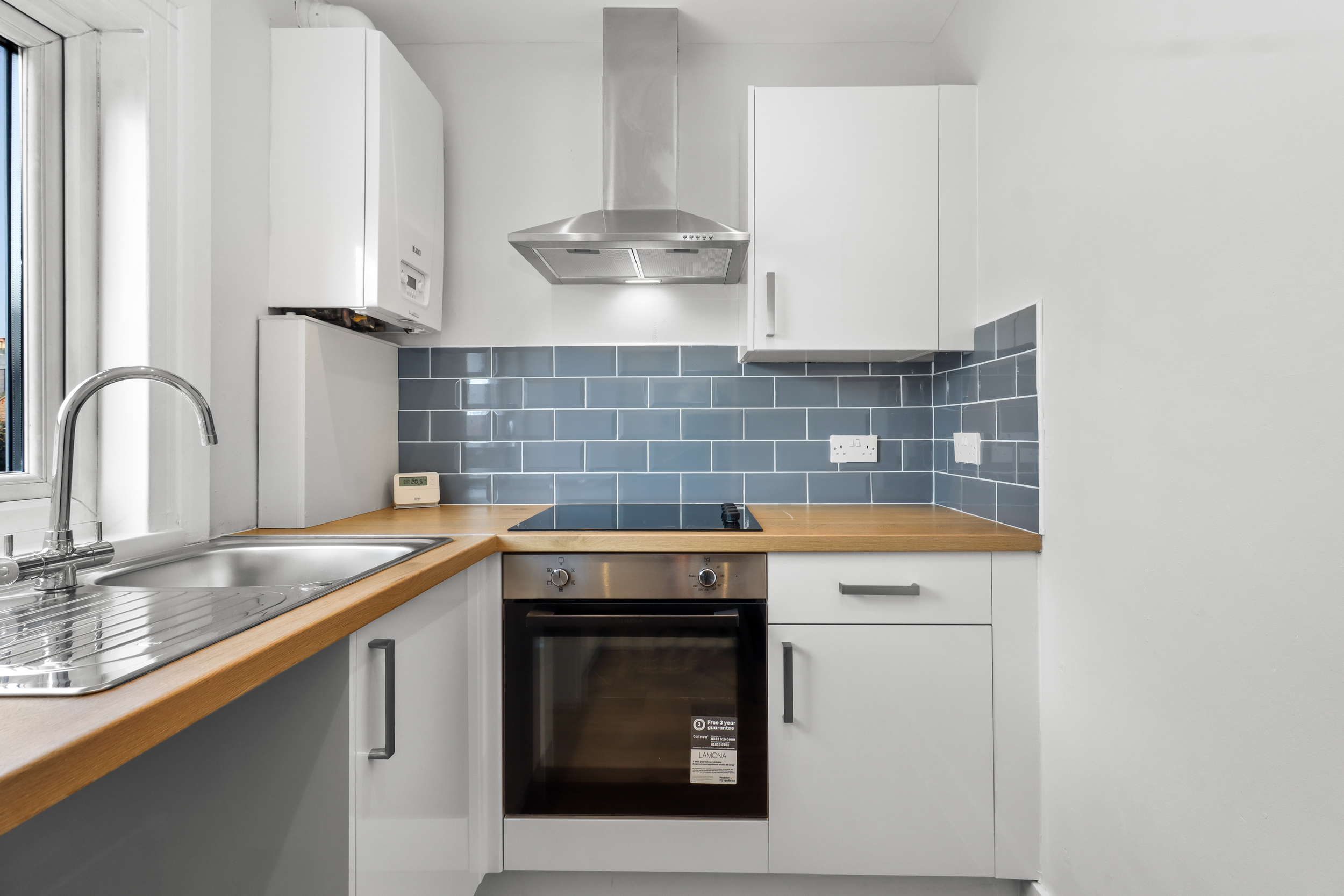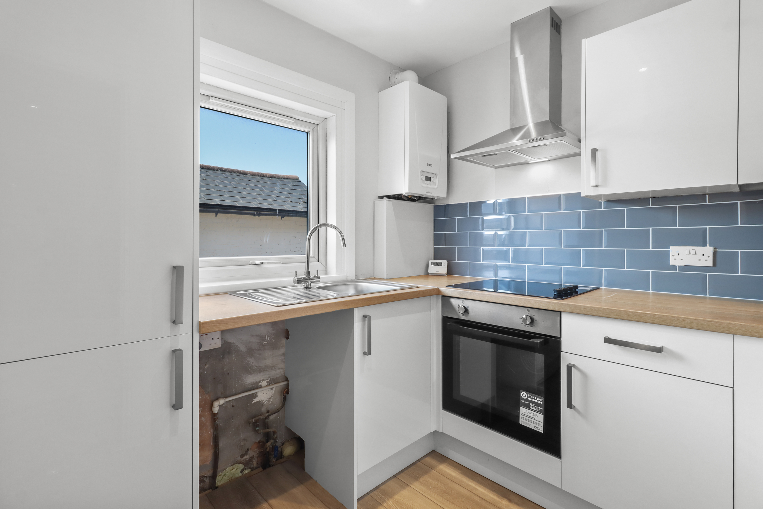 To the rear of the apartment, you’ll find a stylishly refurbished kitchen, designed with both aesthetics and practicality in mind. The kitchen is equipped with a range of contemporary fittings, including a built-in oven, hob, fridge, and freezer, catering to all your culinary needs. The clever layout also includes space for a washing machine, ensuring the apartment is as functional as it is attractive. A large, double-glazed window allows plenty of light into the space and provides a pleasant view to the rear, adding to the kitchen's overall appeal.