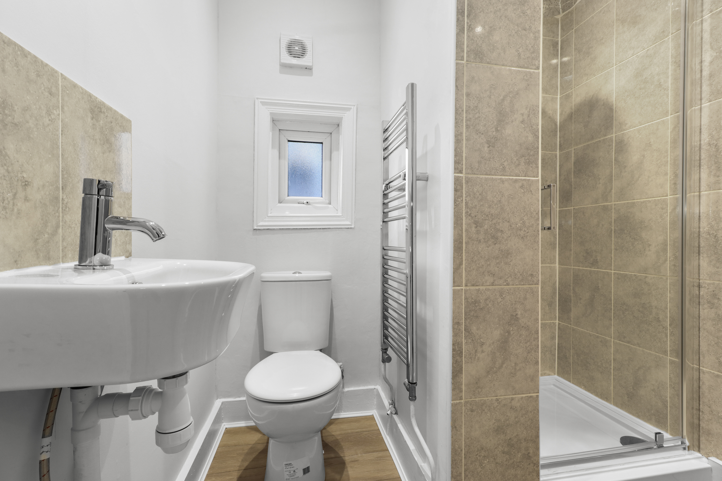 Completing the apartment is the brand-new shower room, which has been finished to a high standard. It features a walk-in shower cubicle, close-coupled WC, and a wall-mounted wash hand basin, all complemented by contemporary tiling and fittings.
