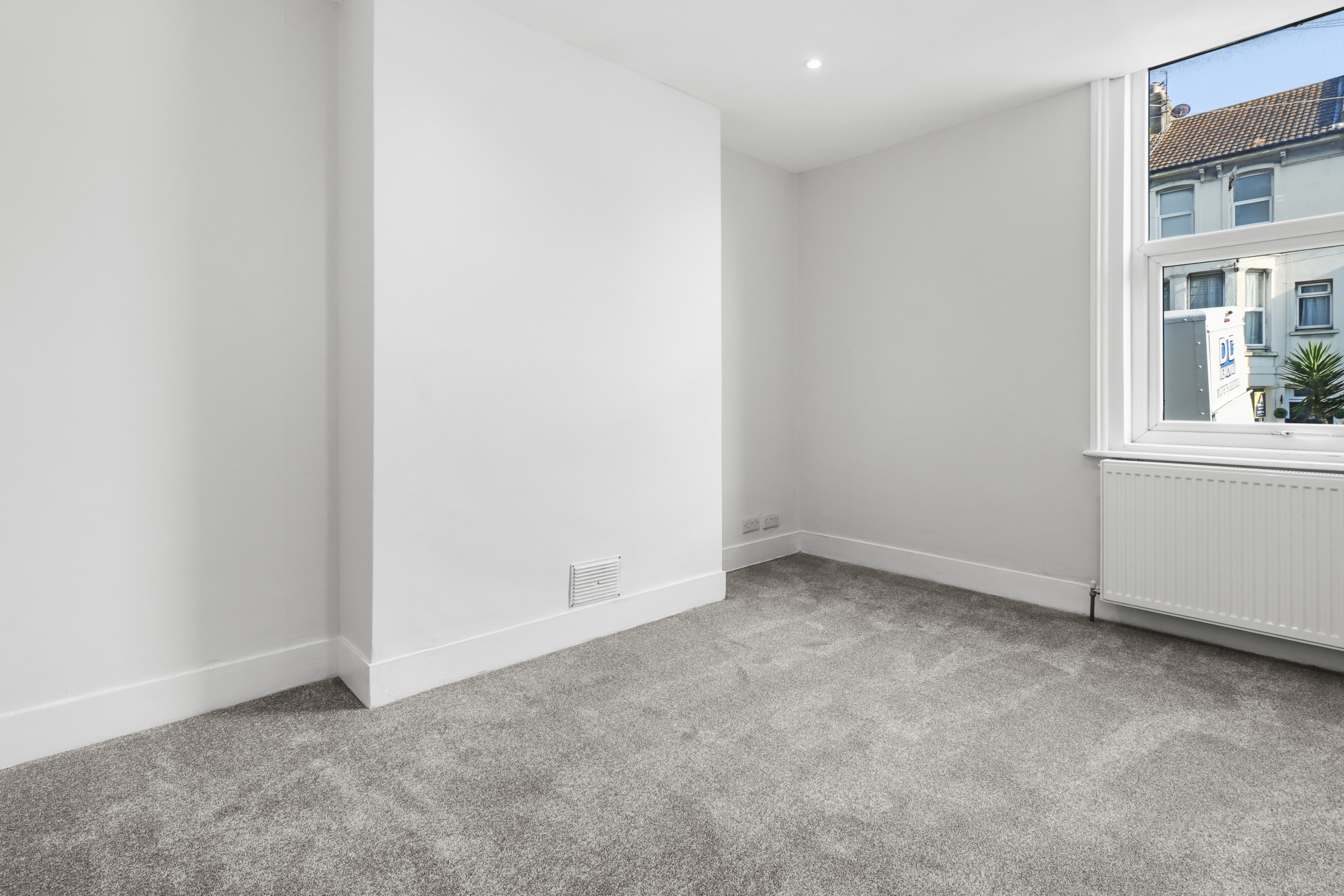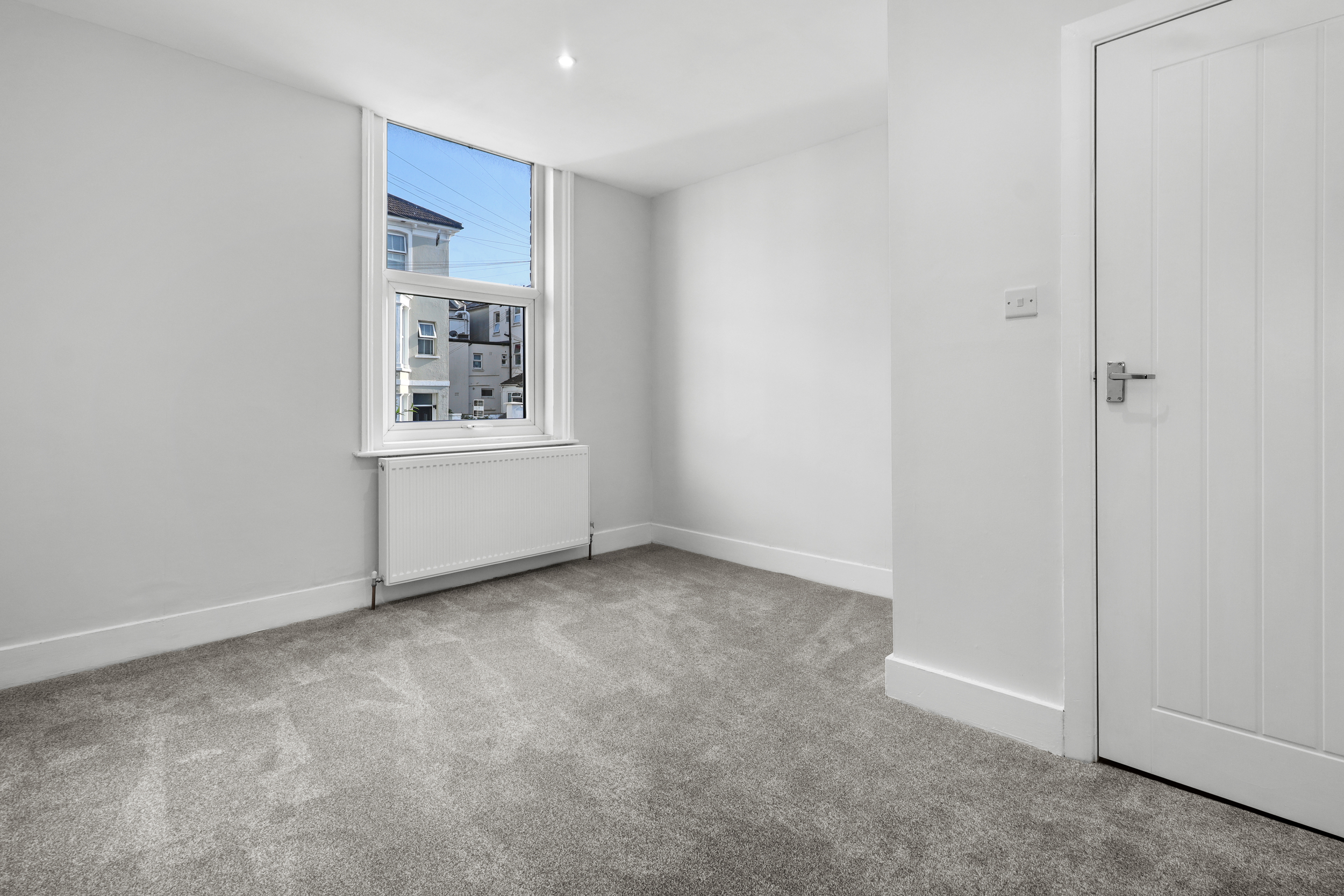 The front-facing living room is a key highlight of the property, offering a bright and welcoming space to relax and entertain. A large double-glazed window provides ample natural light, filling the room with warmth and a sense of openness. The fresh paintwork and new carpet continue the modern aesthetic, providing a neutral backdrop for your personal touches.