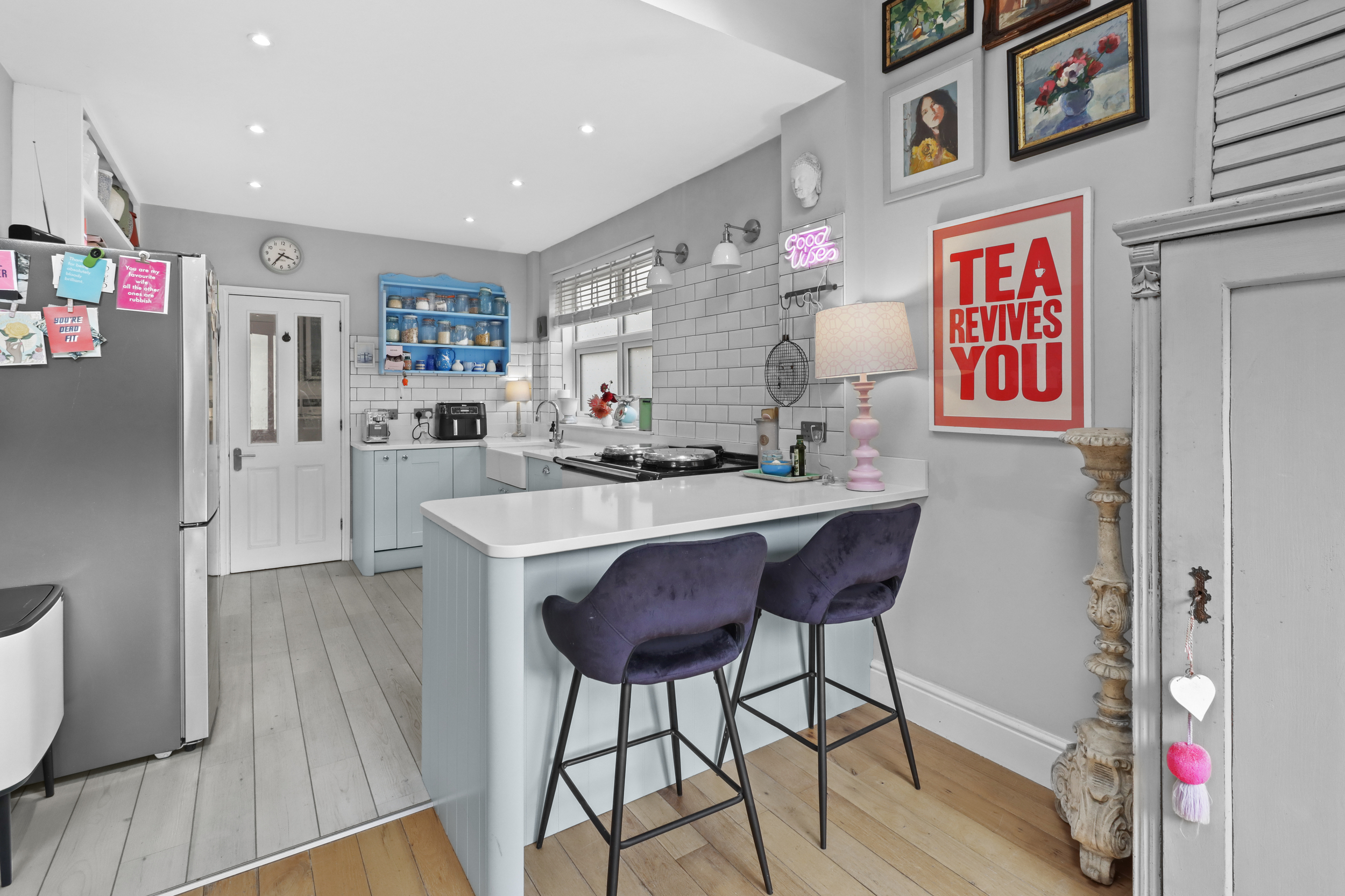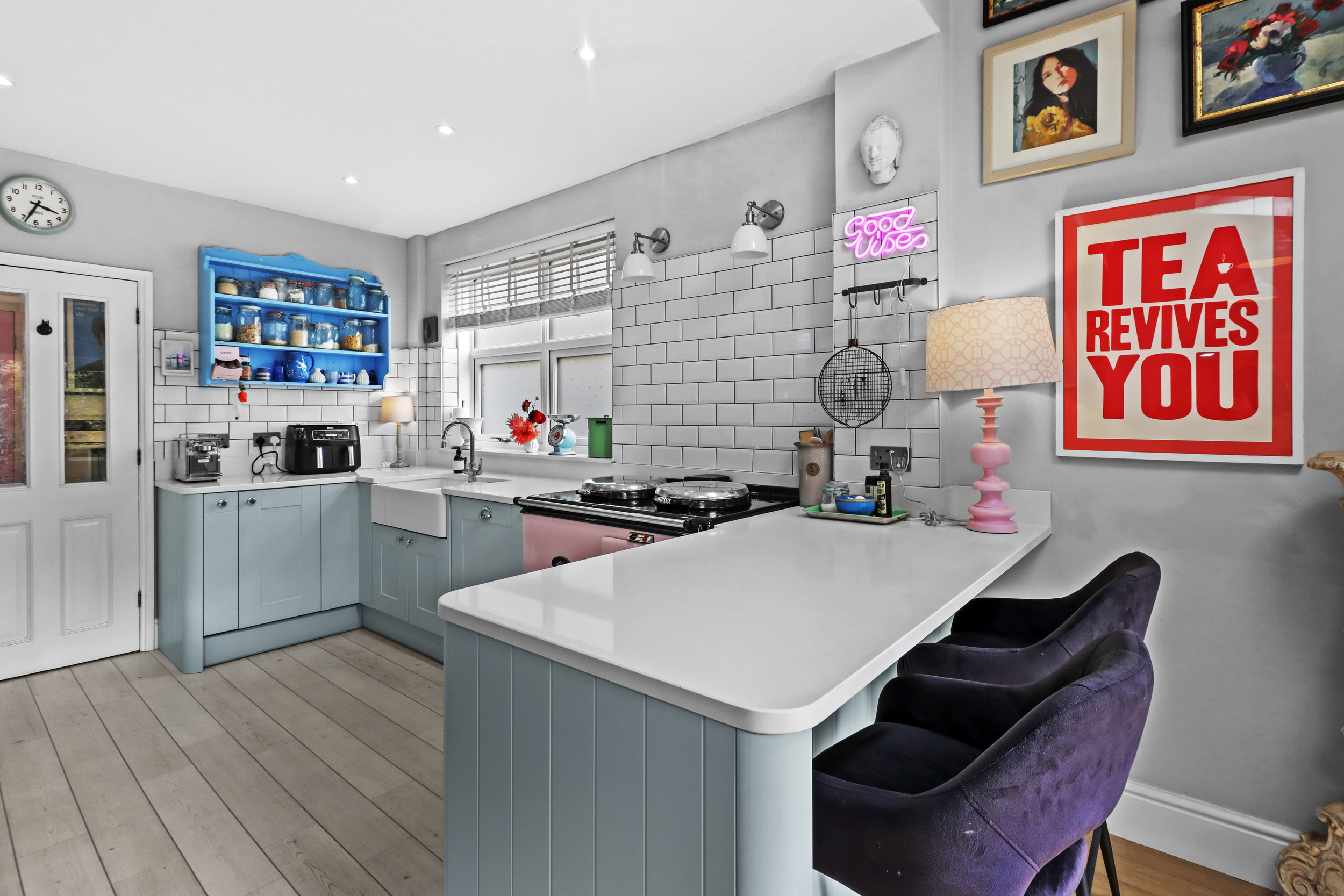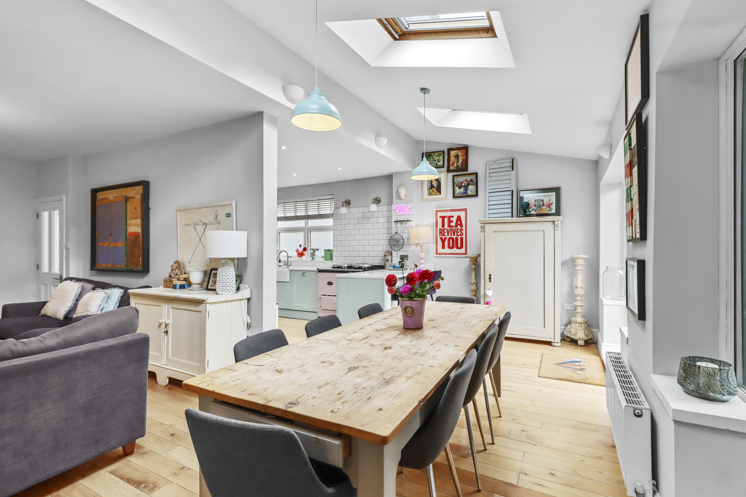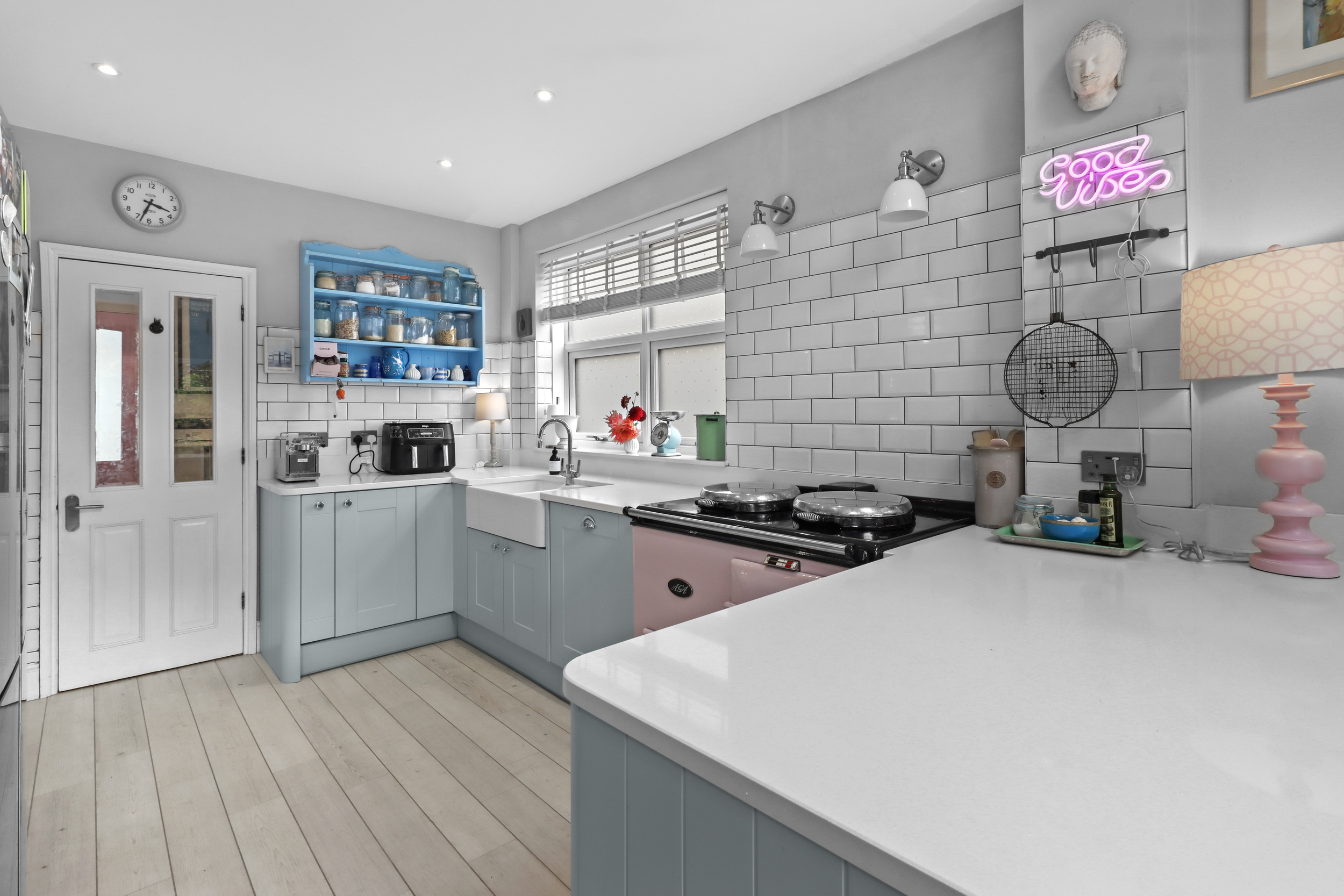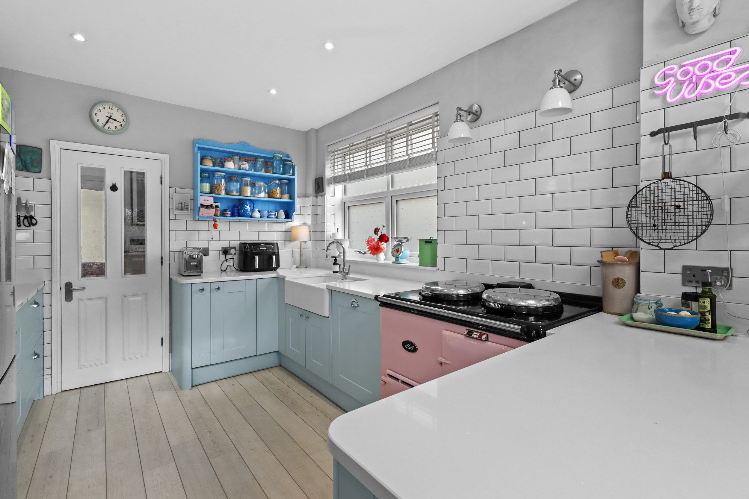 The modern kitchen is conveniently located just off the dining room and features sleek cabinetry with ample storage. The kitchen is fitted with a range of high-quality appliances, including an integrated dishwasher and a coveted Aga oven, which could be replaced to a range cooker, depending on your preference, and making it a dream space for any cooking enthusiast. The clean, modern design of the kitchen is both functional and stylish, with sufficient counter space to make meal preparation a breeze.