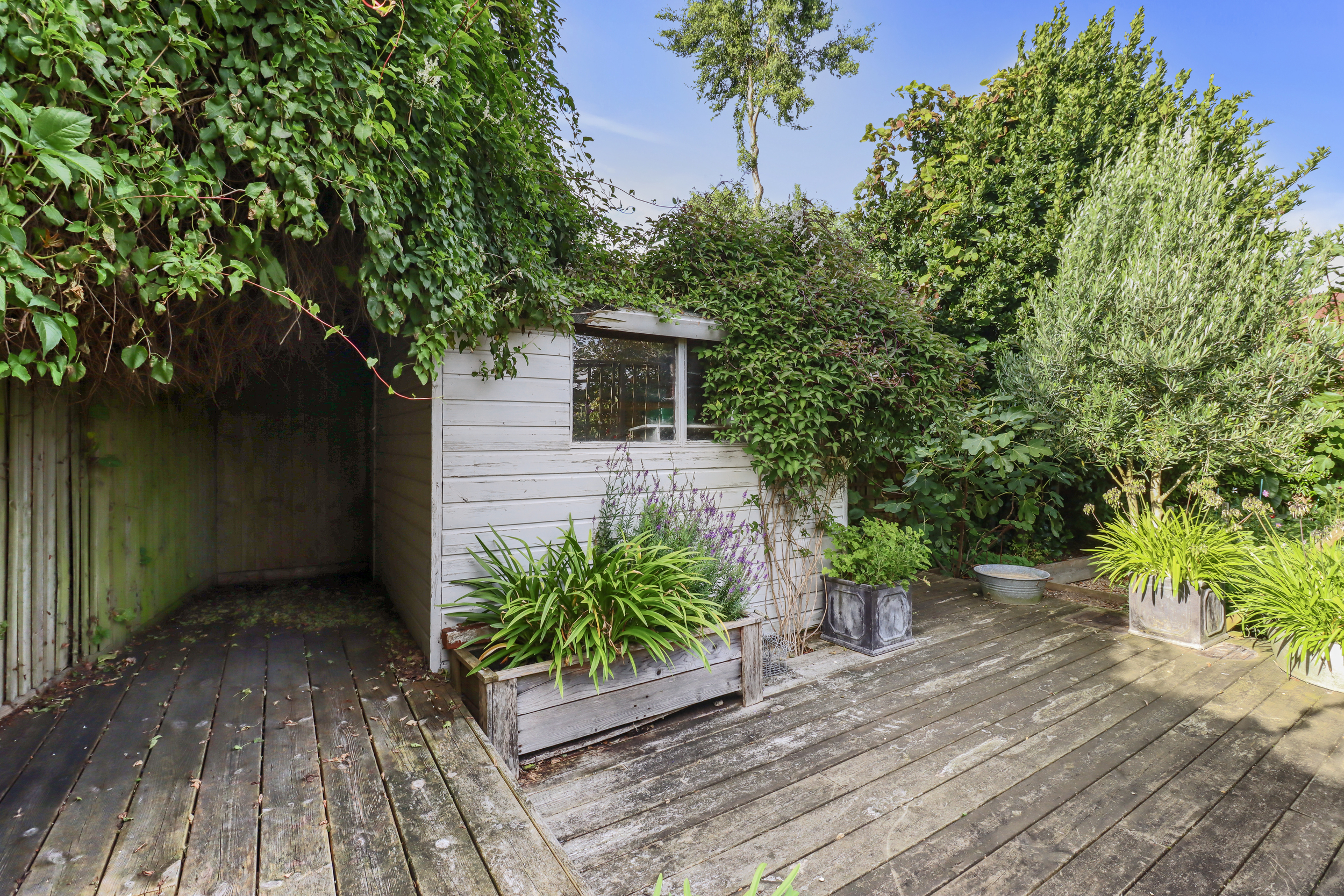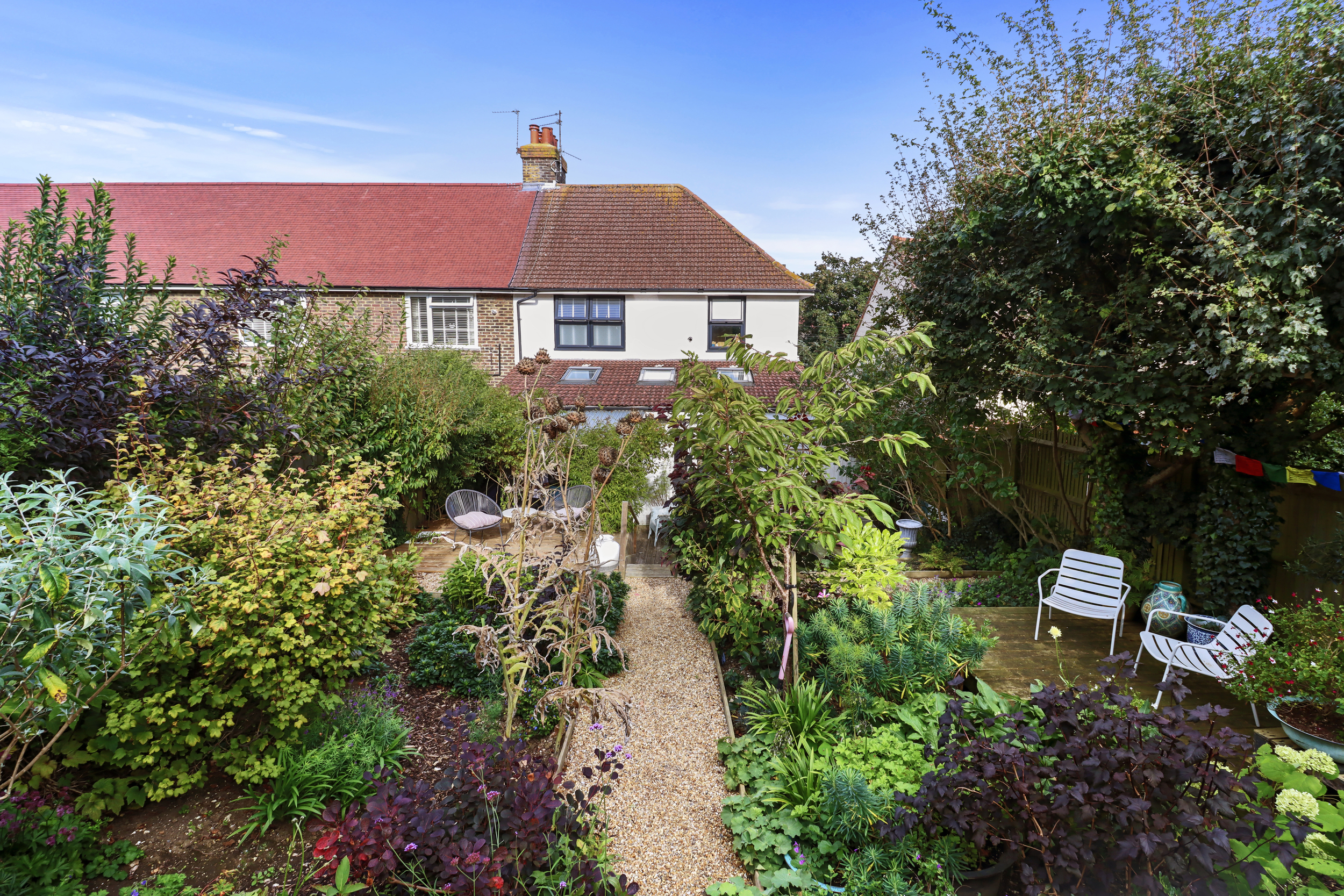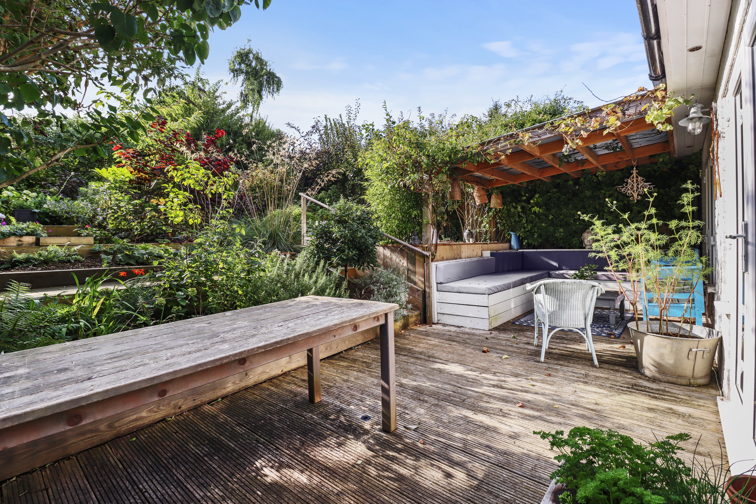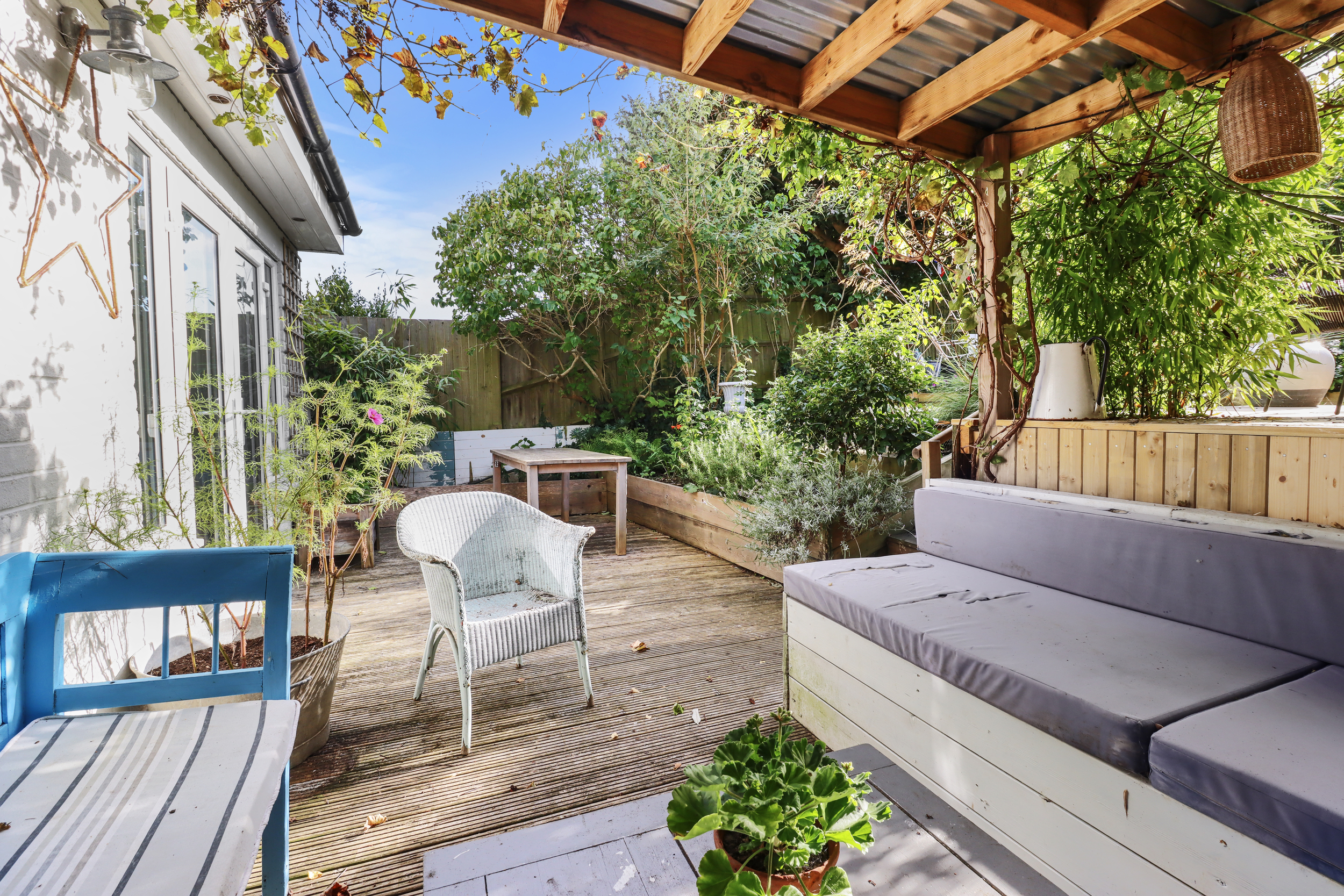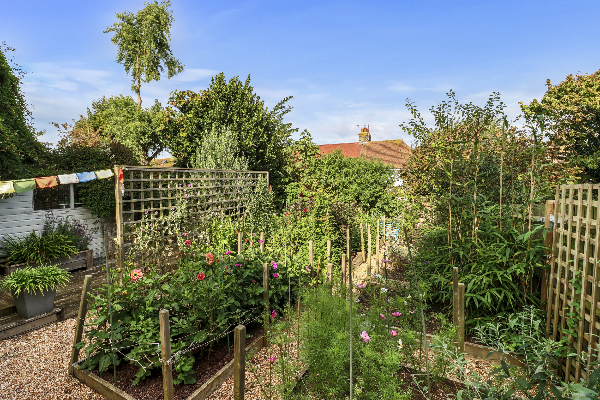 Beyond the decking, the garden opens up into two additional seating areas, each surrounded by a selection of beautiful flower and shrub borders. This section is perfect for enjoying a sunny retreat to read or relax. Beautiful flower beds and well-kept greenery enhance the sense of tranquillity and connection with nature.
