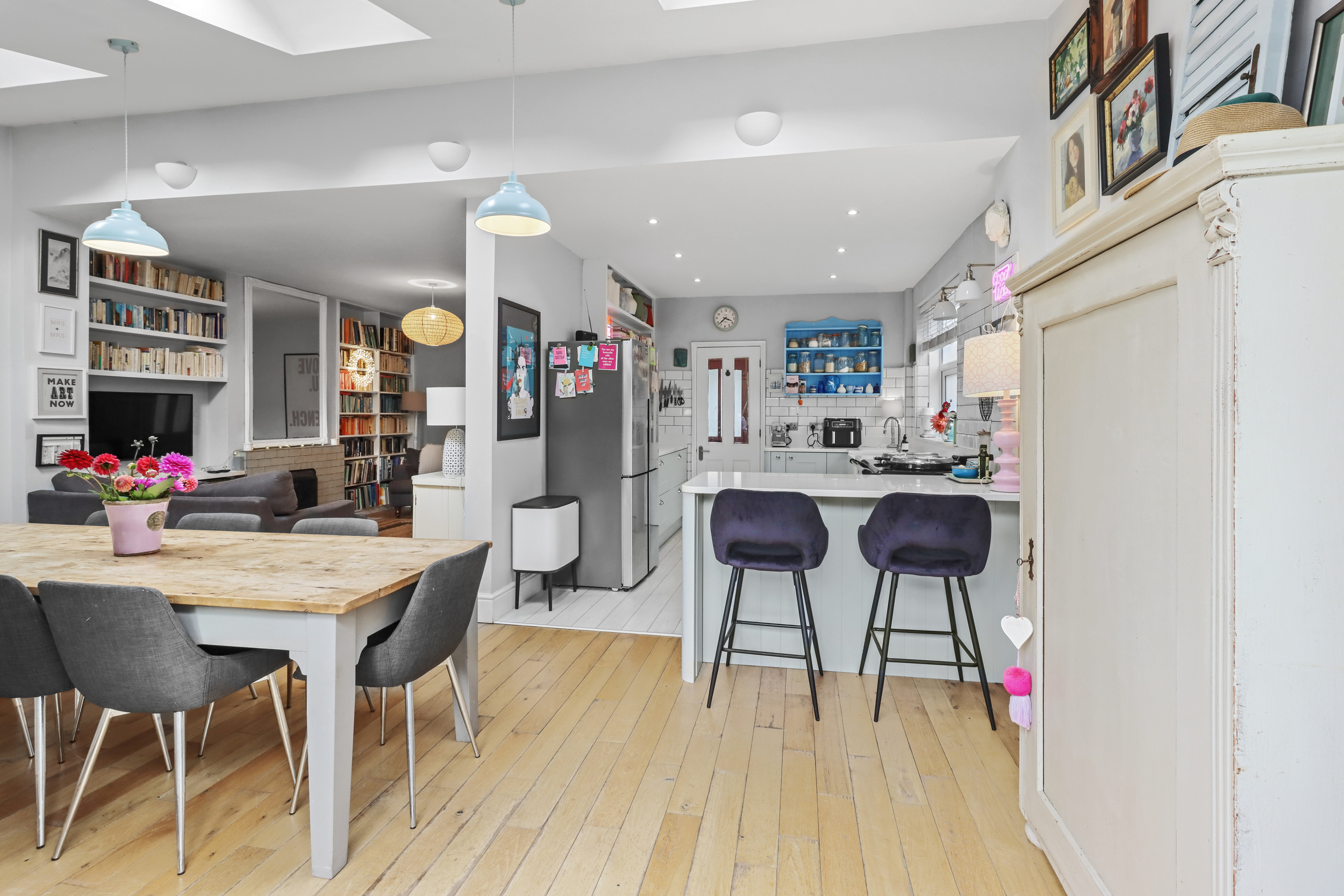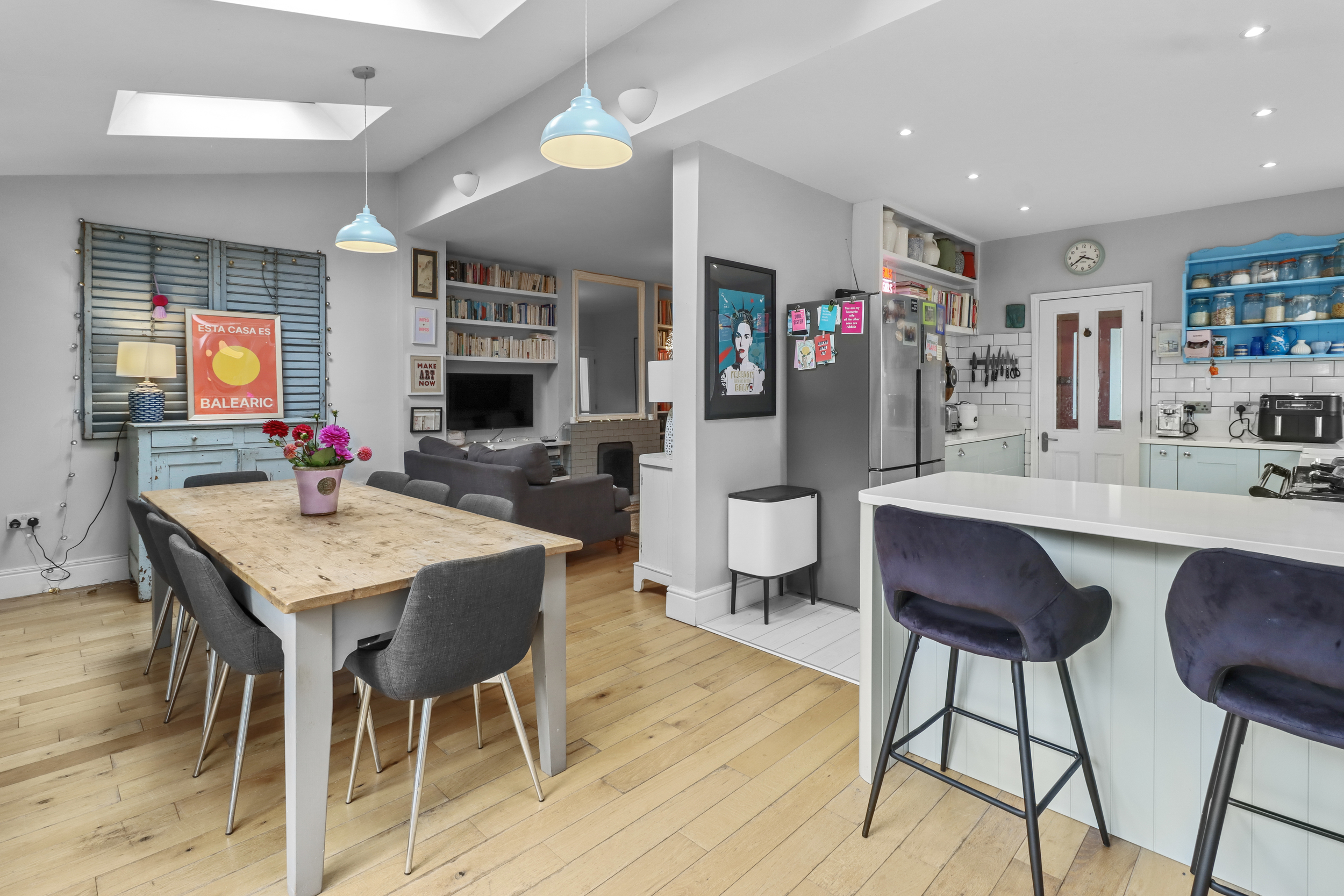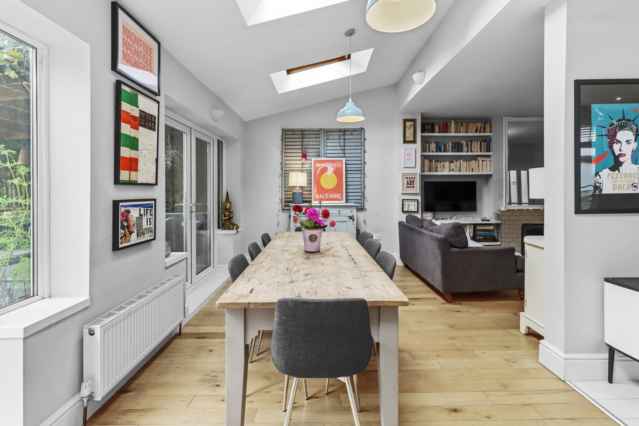 Upon entering the property, you are welcomed by a bright entrance hall, leading to all ground floor rooms and stairs to the first floor. To the right, there is a flexible room that can serve as a fourth bedroom or a cosy separate living space. The hallway also grants access to a spacious living room, complete with a stunning feature open fireplace. The living room flows seamlessly into the expansive rear ground floor extension, which functions as a dining room. Flooded with natural light from two sets of double-glazed patio doors and three Velux windows, it offers a perfect setting for family gatherings and entertaining.