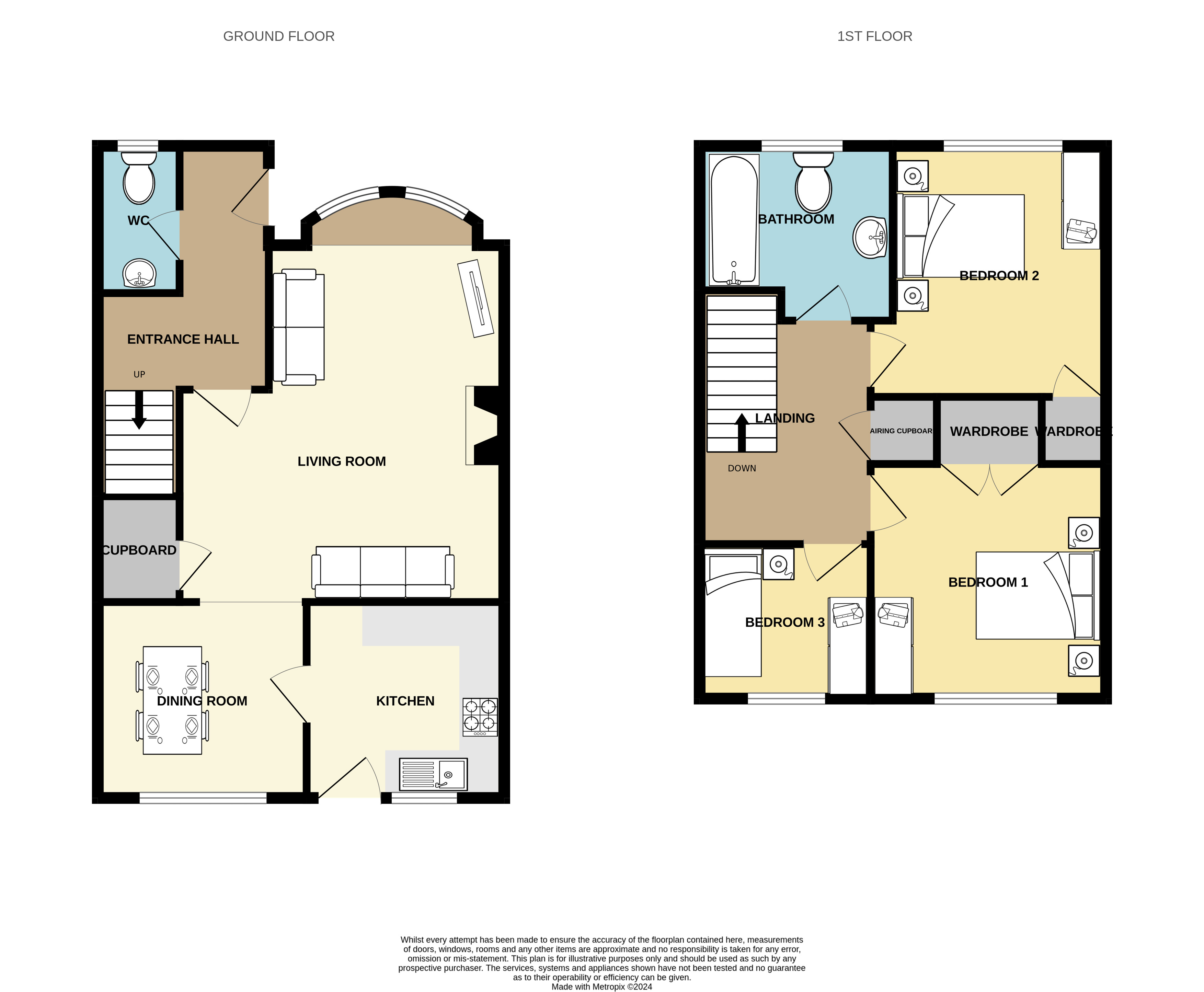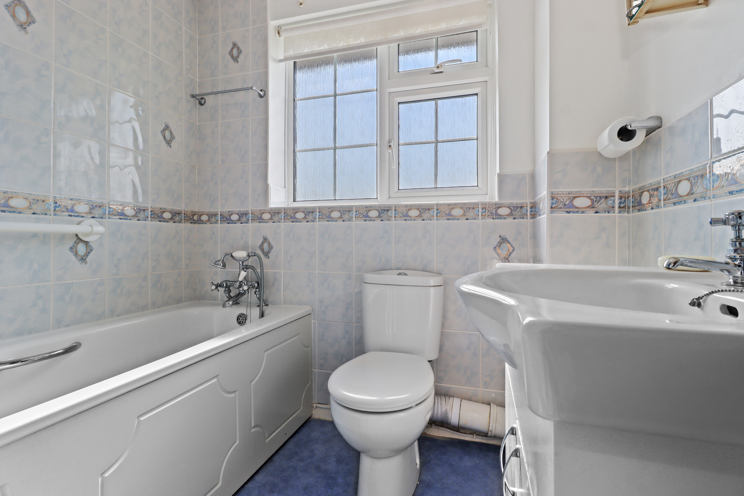 The first-floor landing gives access to three bedrooms and the family bathroom. Bedrooms one and two benefit from built-in wardrobes, while the family bathroom features a three-piece suite, including a panel-enclosed bath with shower, a close-coupled WC, and a wash hand basin.