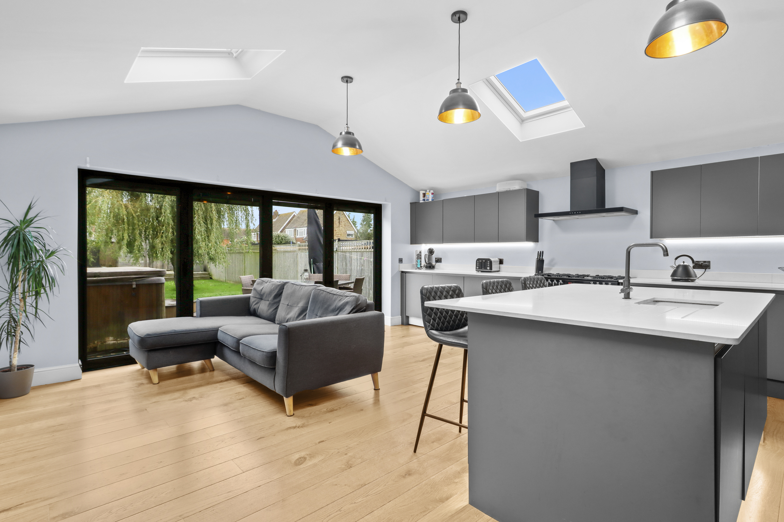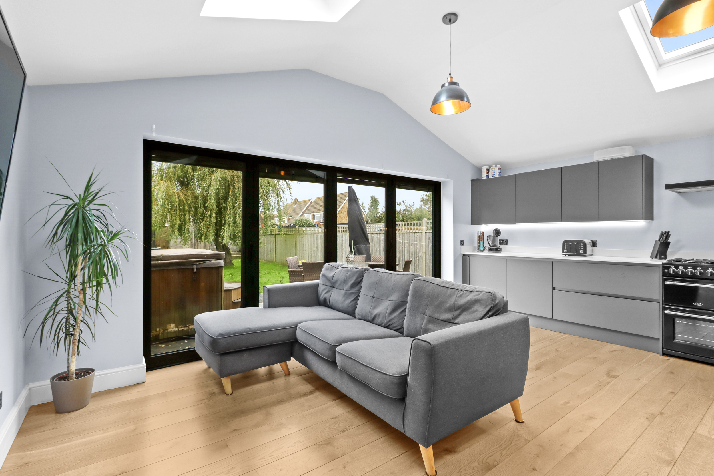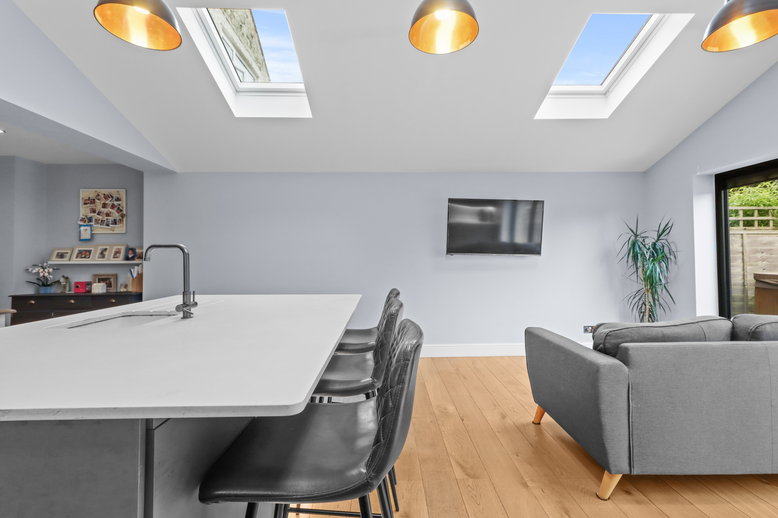 The showpiece of this home is the spectacular open-plan kitchen/family room—a dream come true for those who love to cook, entertain, and gather in a single multifunctional space. Equipped with a modern range of wall-mounted and matching base units, this kitchen offers style and functionality. The sleek work surfaces and integrated appliances, including a built-in dishwasher, washing machine, and tumble dryer, ensure that every convenience is at your fingertips. The kitchen flows seamlessly into a family and dining area, with ample space for a dining table set, making it the perfect place for family meals or hosting friends. Expansive bi-folding doors open up to the garden, allowing for an effortless connection between indoor and outdoor spaces.