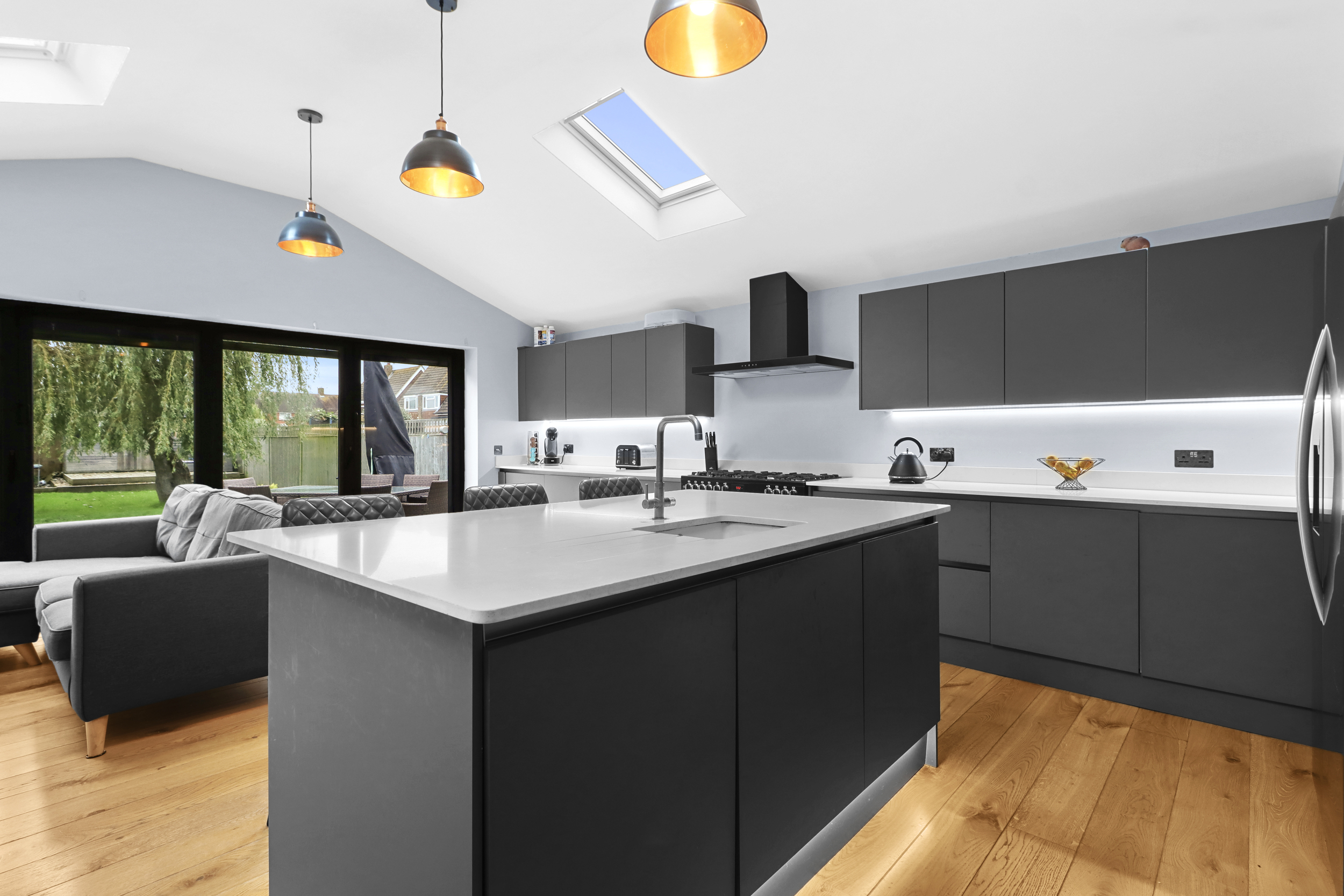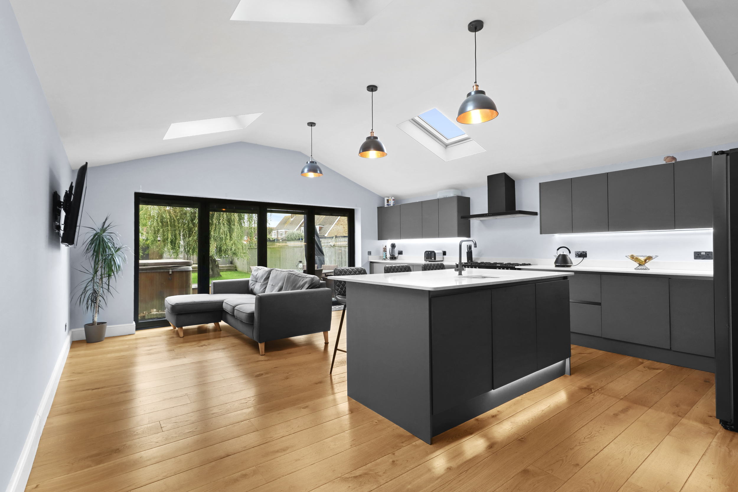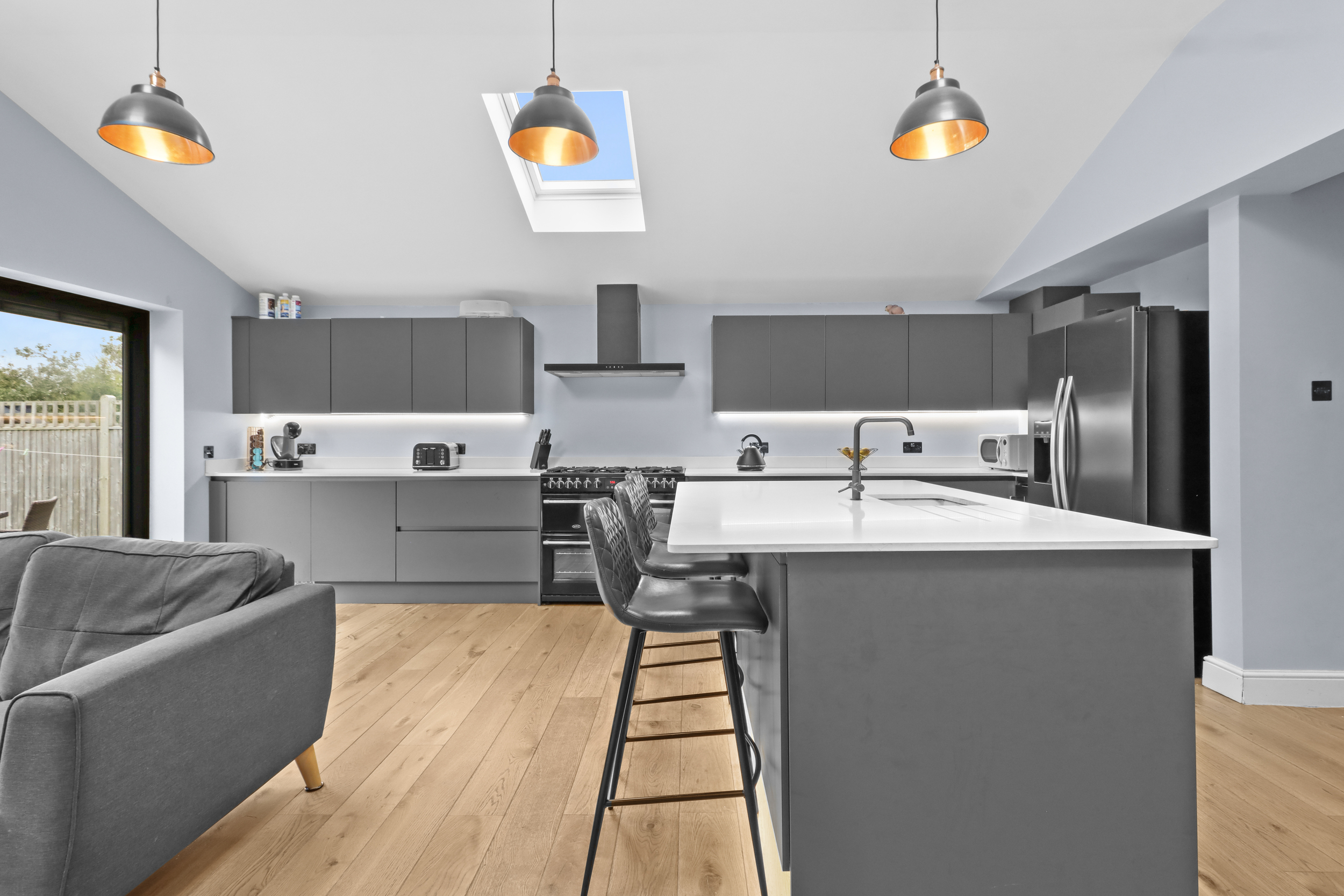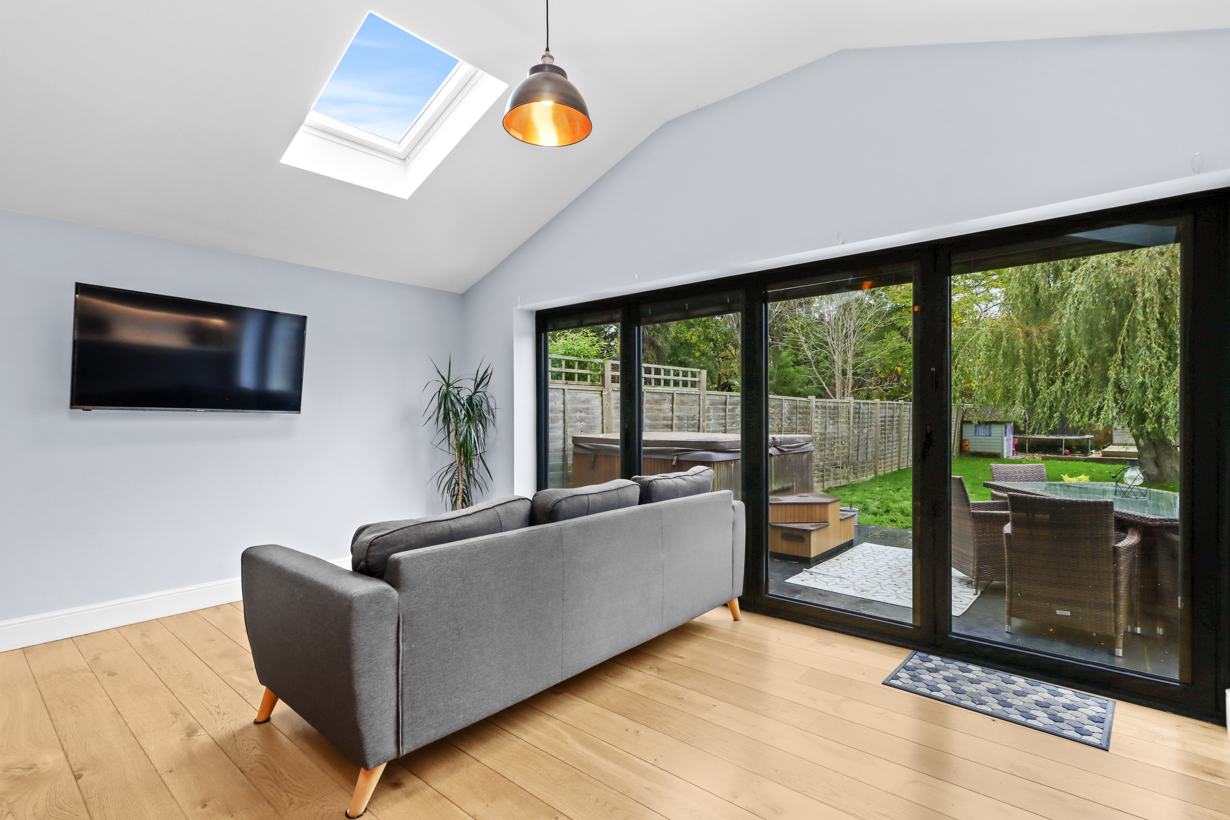The showpiece of this home is the spectacular open-plan kitchen/family room—a dream come true for those who love to cook, entertain, and gather in a single multifunctional space. Equipped with a modern range of wall-mounted and matching base units, this kitchen offers style and functionality. The sleek work surfaces and integrated appliances, including a built-in dishwasher, washing machine, and tumble dryer, ensure that every convenience is at your fingertips. The kitchen flows seamlessly into a family and dining area, with ample space for a dining table set, making it the perfect place for family meals or hosting friends. Expansive bi-folding doors open up to the garden, allowing for an effortless connection between indoor and outdoor spaces.