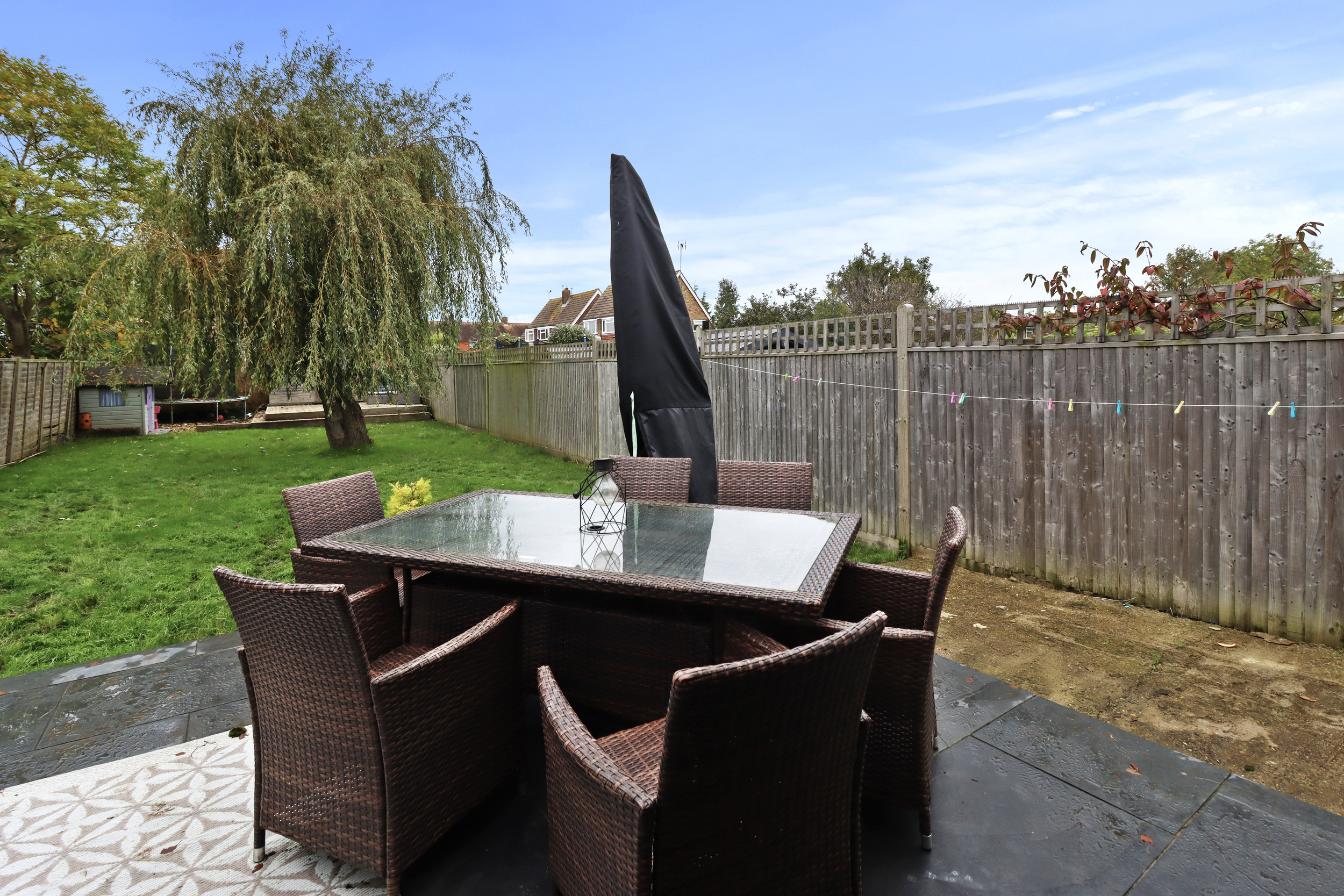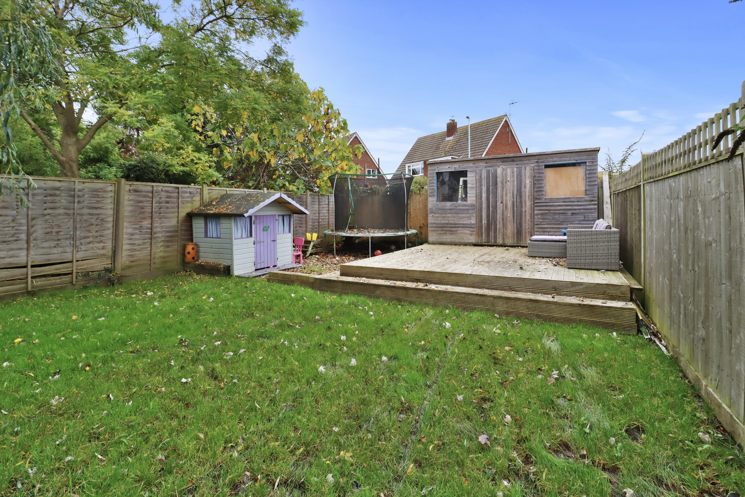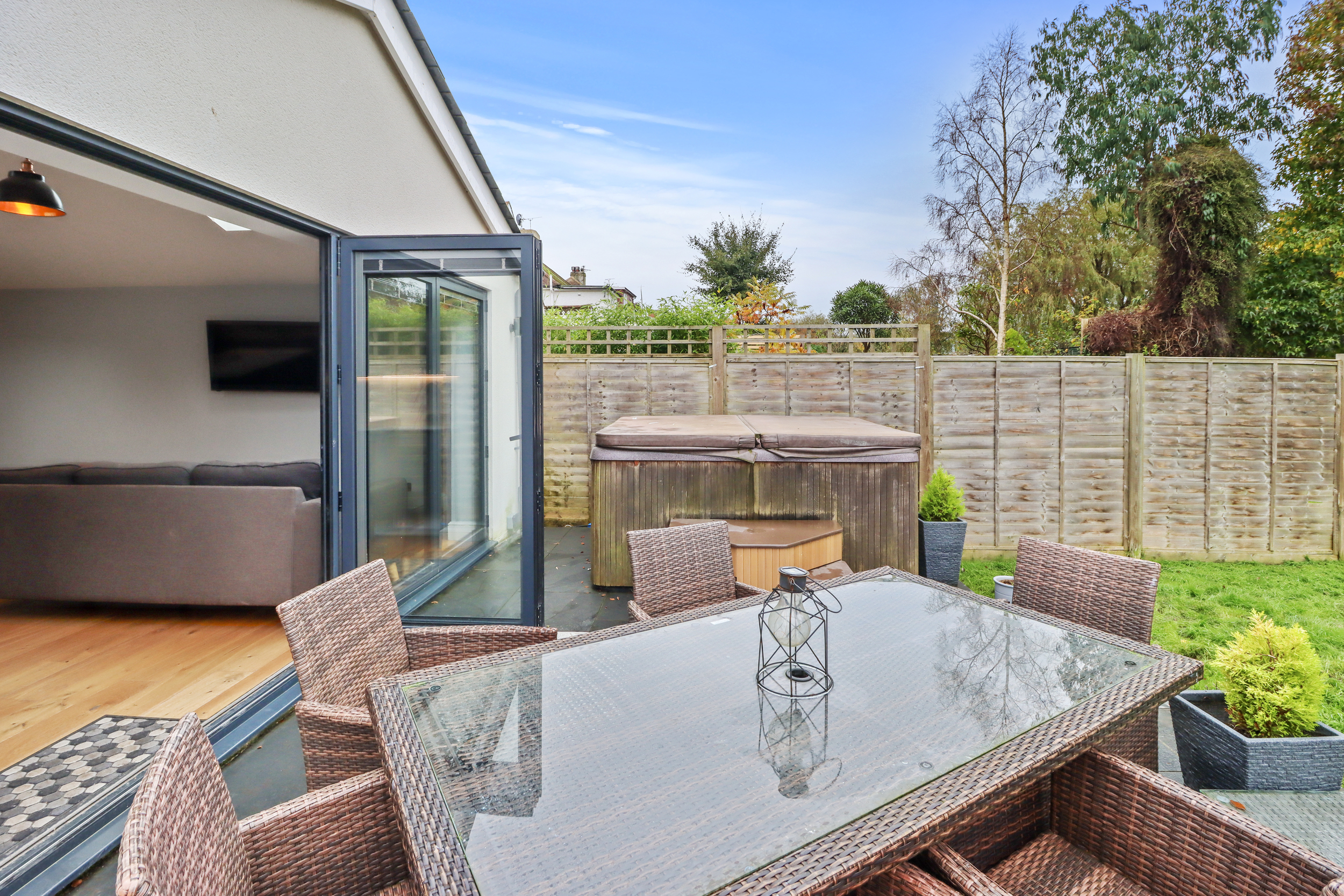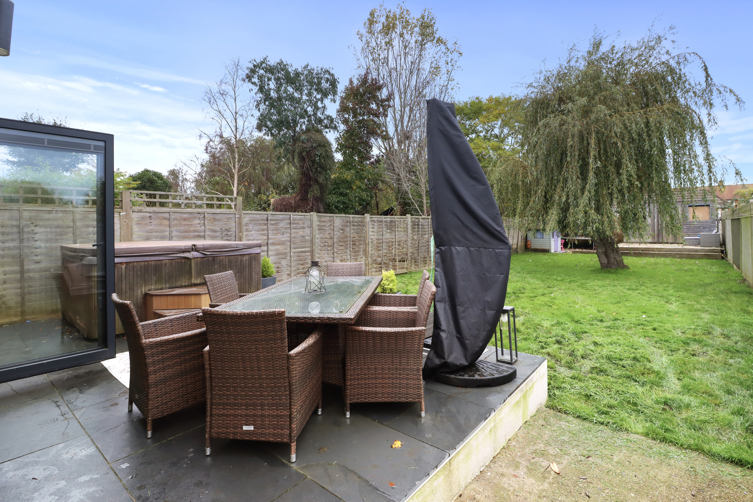 The rear garden of this home is an outdoor haven designed for relaxation, play, and entertaining. A paved patio area adjoins the house and includes a luxurious hot tub, offering a fantastic space for unwinding and socializing. Beyond the patio, an expansive lawn provides an ideal setting for children to play or for family gatherings. At the far end of the garden, a wooden deck area with a storage shed and a designated play area offers versatility, whether you’re looking for additional storage, a spot to soak up the sun, or a place for children to play.