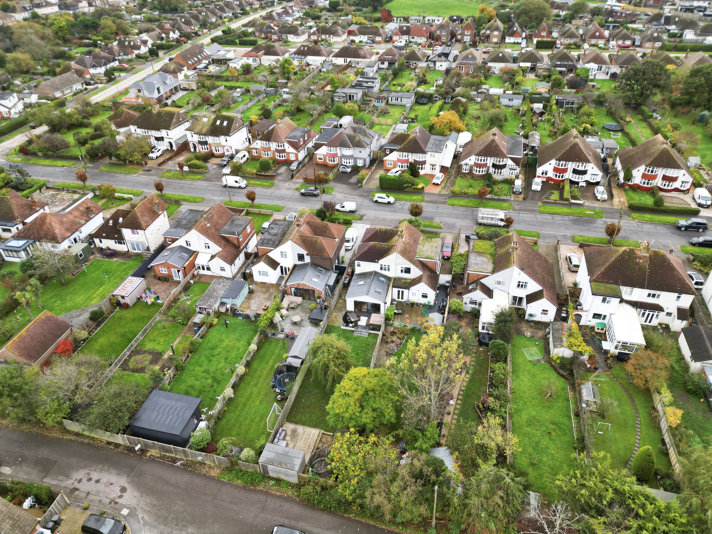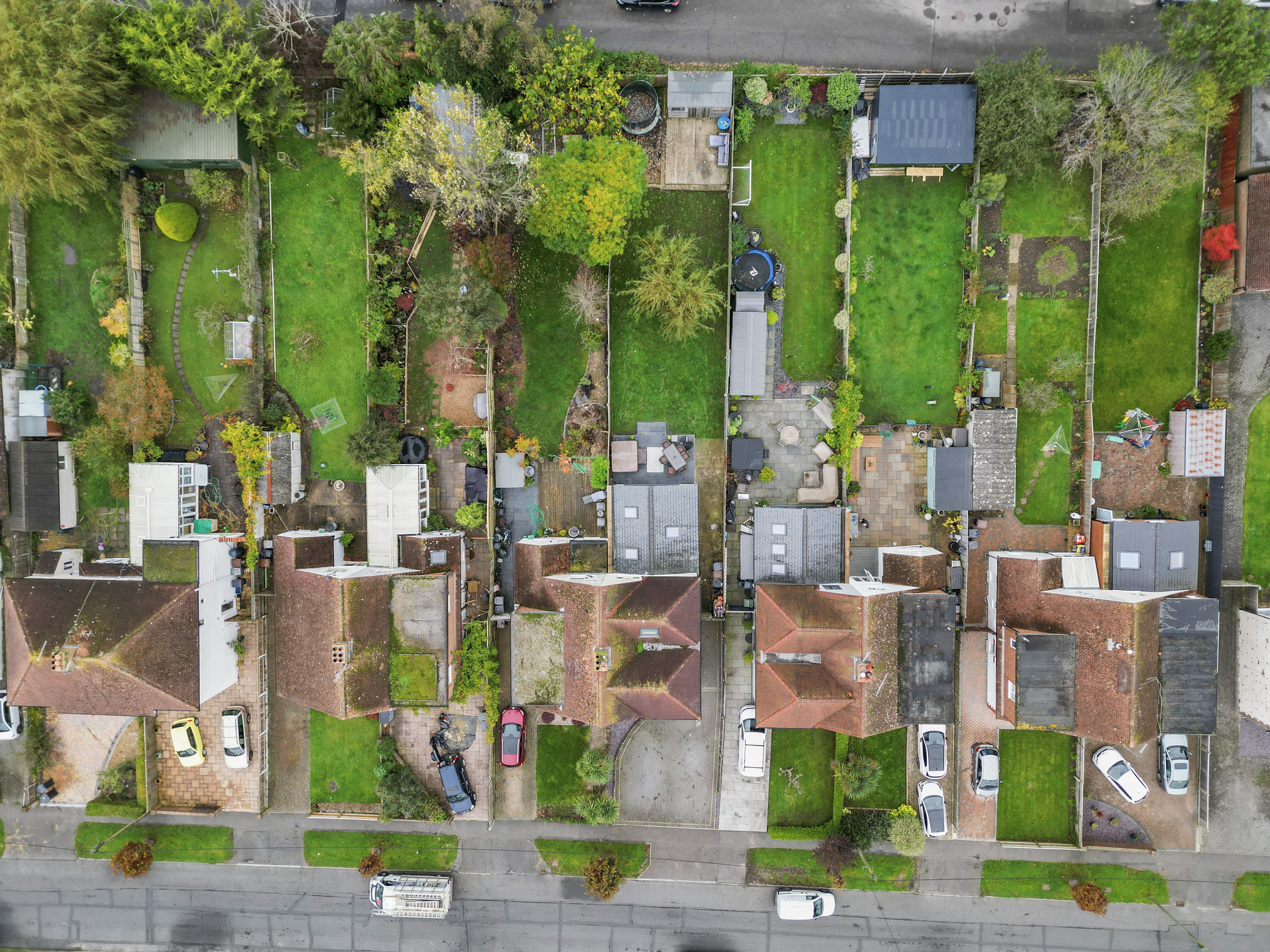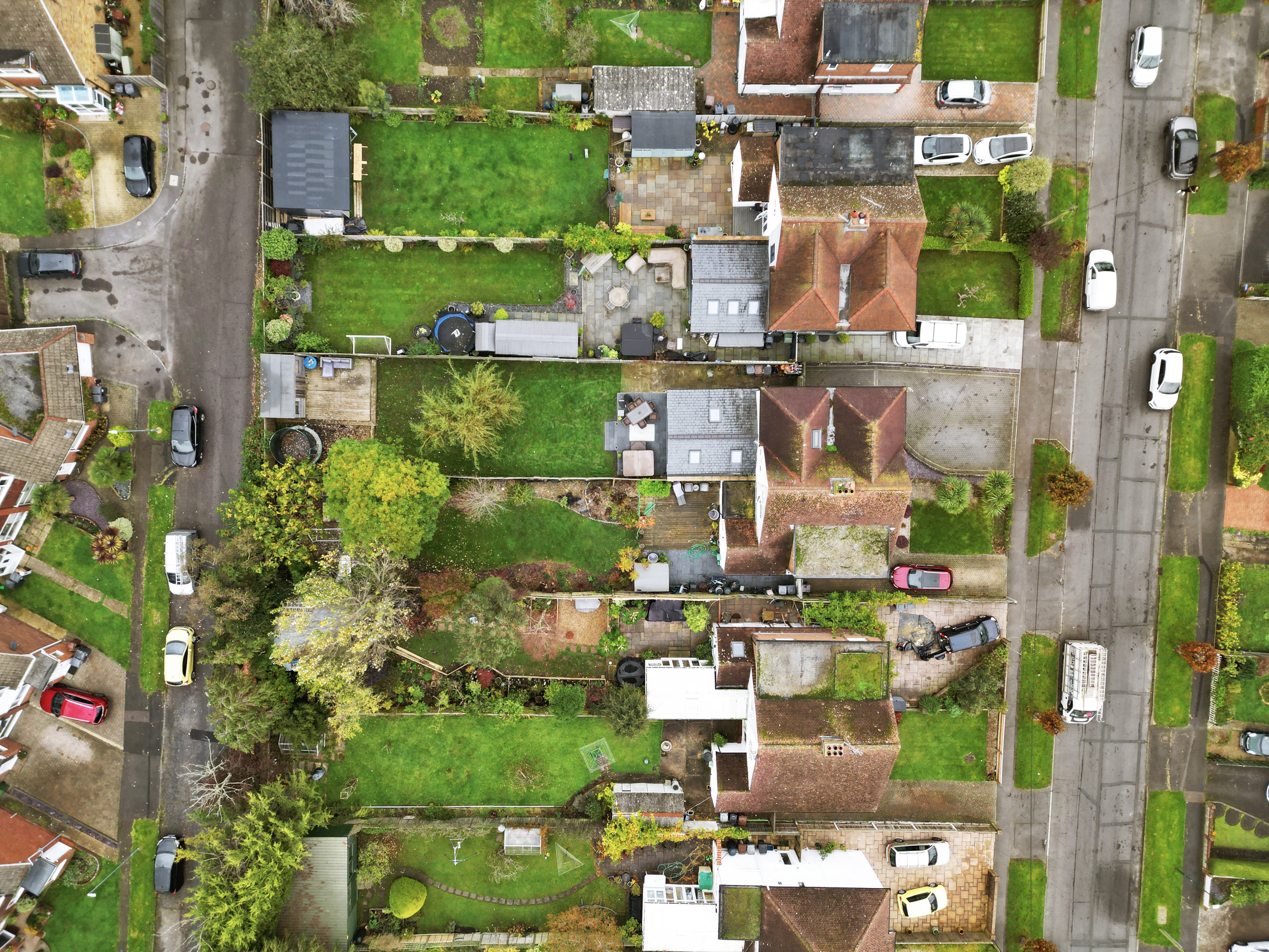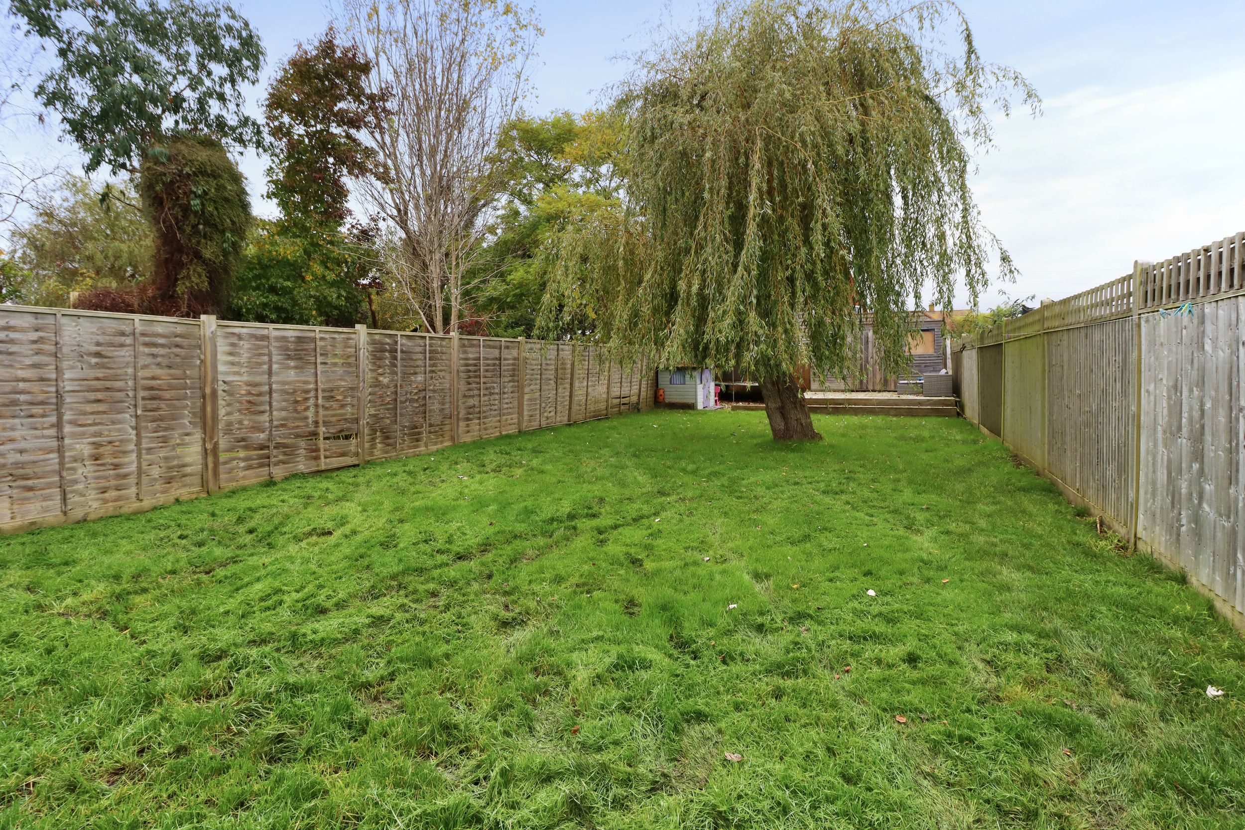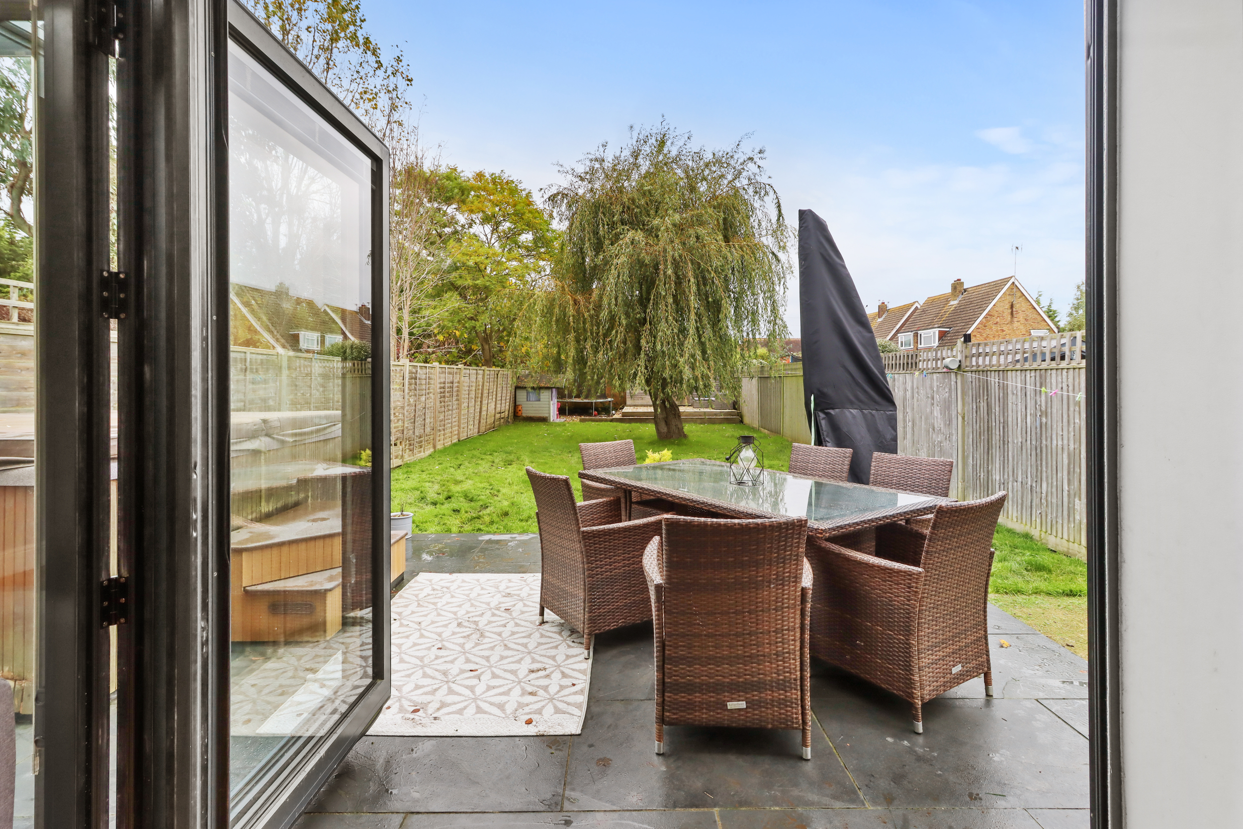 The rear garden of this home is an outdoor haven designed for relaxation, play, and entertaining. A paved patio area adjoins the house and includes a luxurious hot tub, offering a fantastic space for unwinding and socializing. Beyond the patio, an expansive lawn provides an ideal setting for children to play or for family gatherings. At the far end of the garden, a wooden deck area with a storage shed and a designated play area offers versatility, whether you’re looking for additional storage, a spot to soak up the sun, or a place for children to play.
