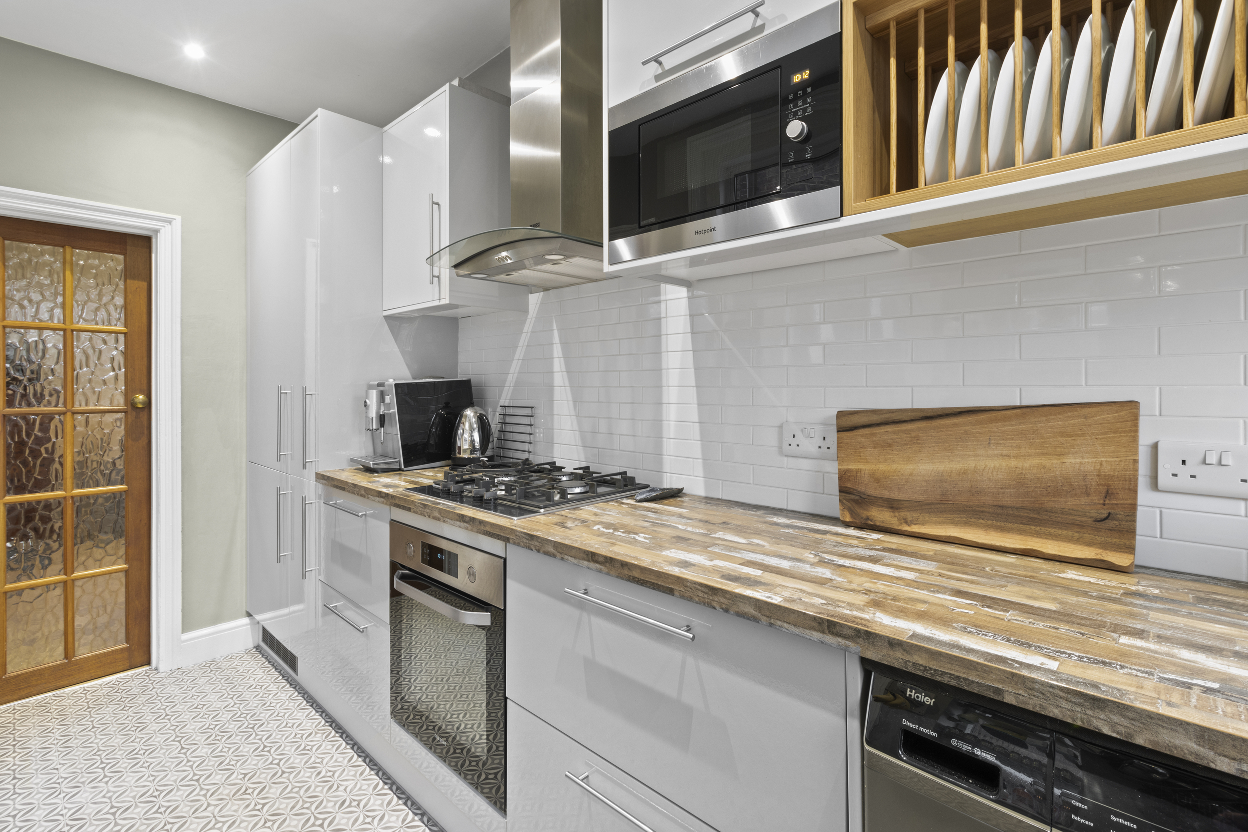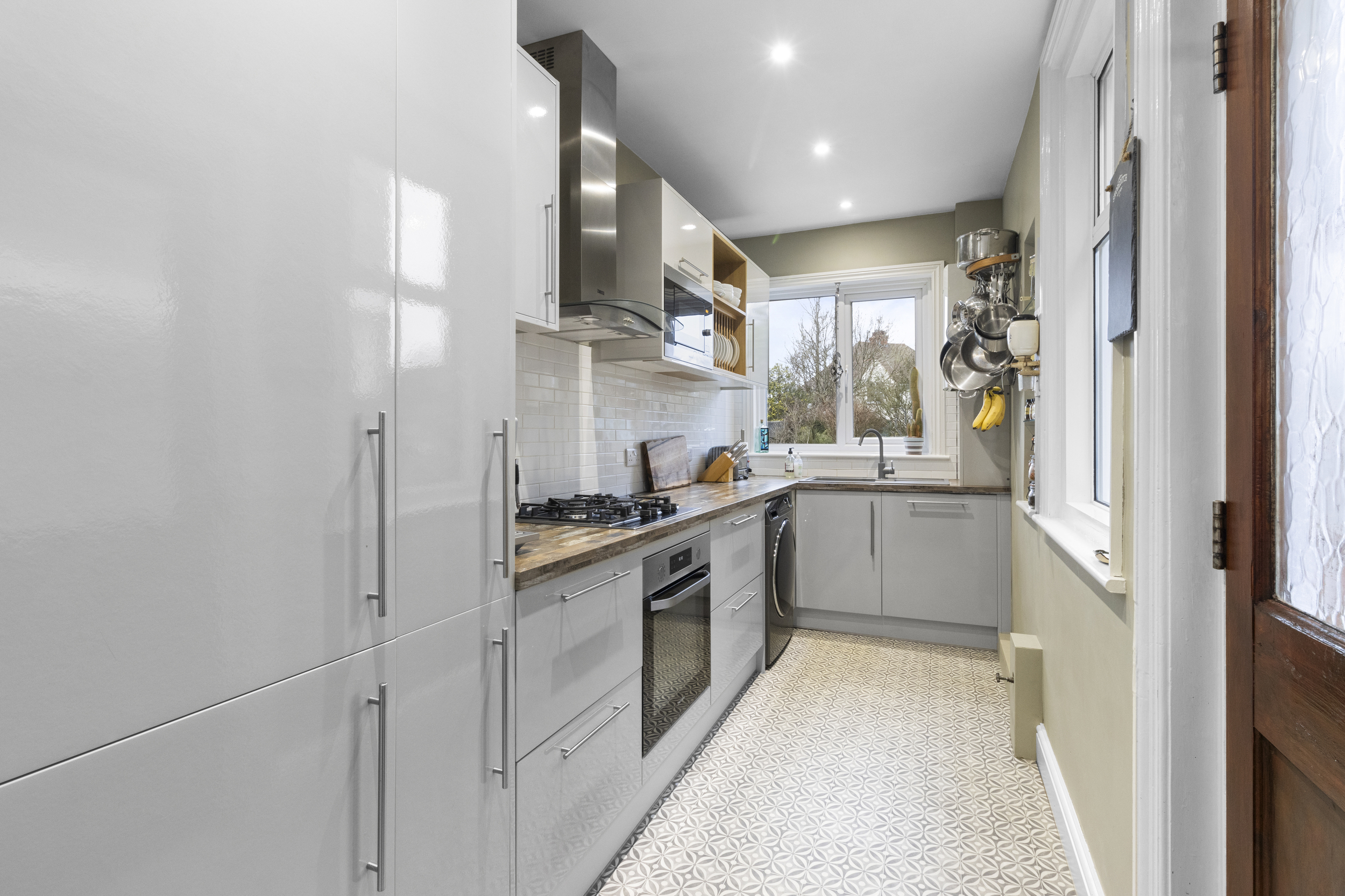Adjacent to the living room is the separate dining room, ideal for hosting family gatherings and dinner parties. This well-proportioned room leads directly into the modern fitted kitchen, which is equipped with an array of stylish wall-mounted and base units. The kitchen includes a built-in oven, hob, and extractor hood, as well as integrated appliances such as a fridge freezer and dishwasher. There is also a dedicated space for a washing machine, ensuring practicality and convenience.