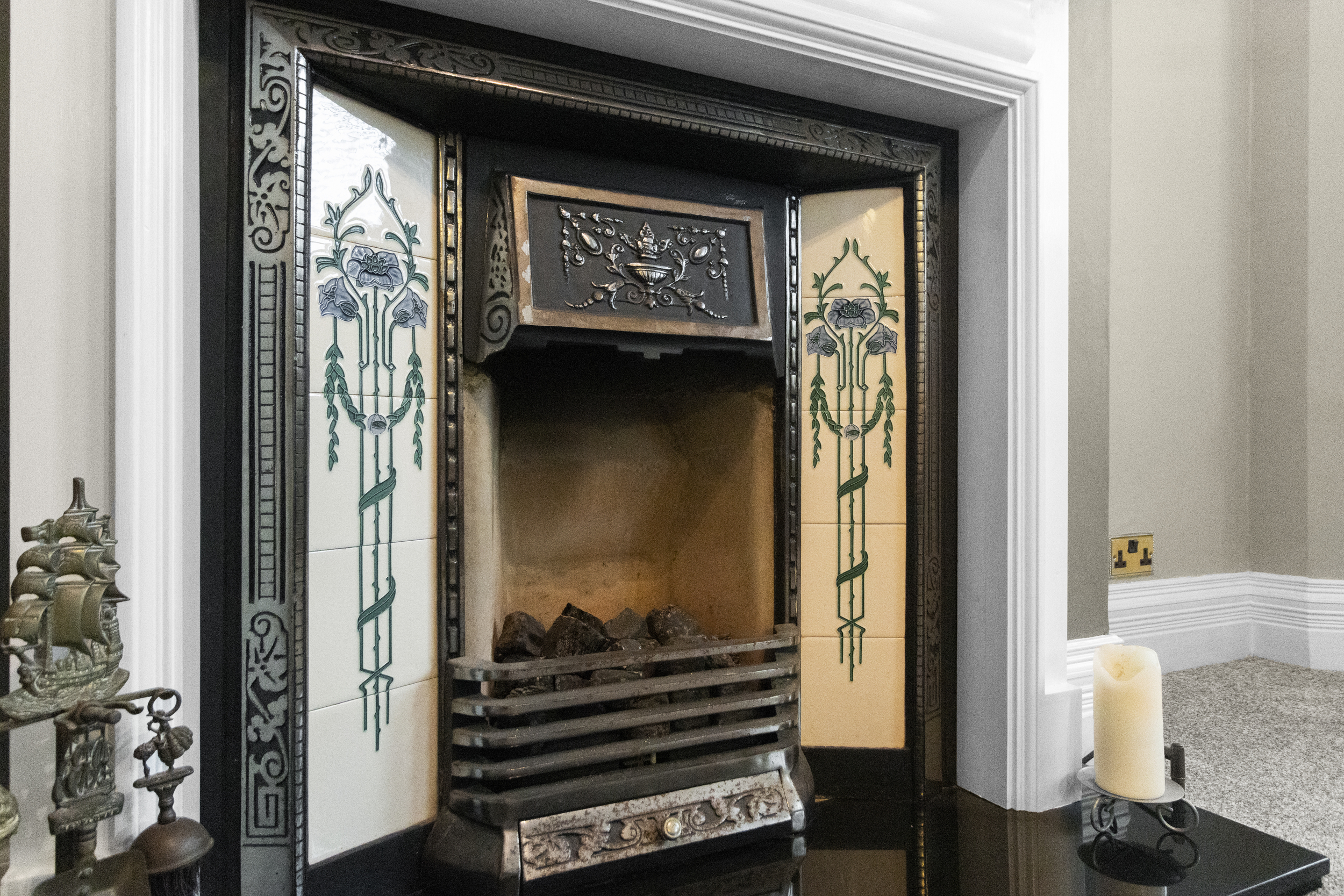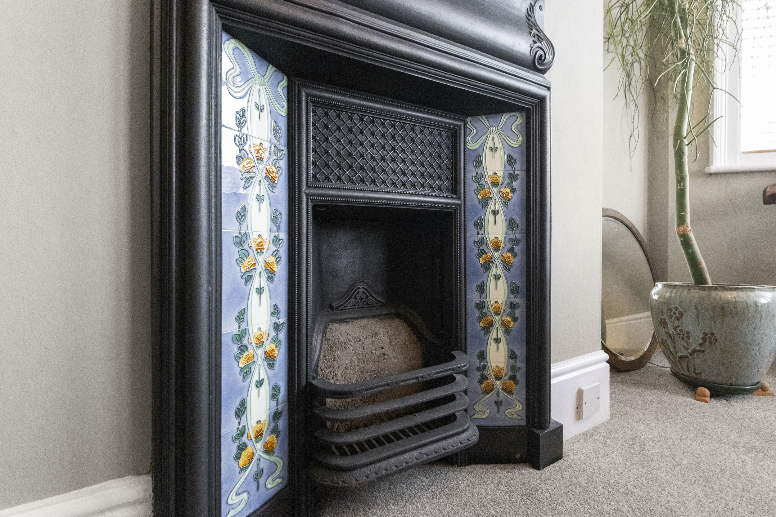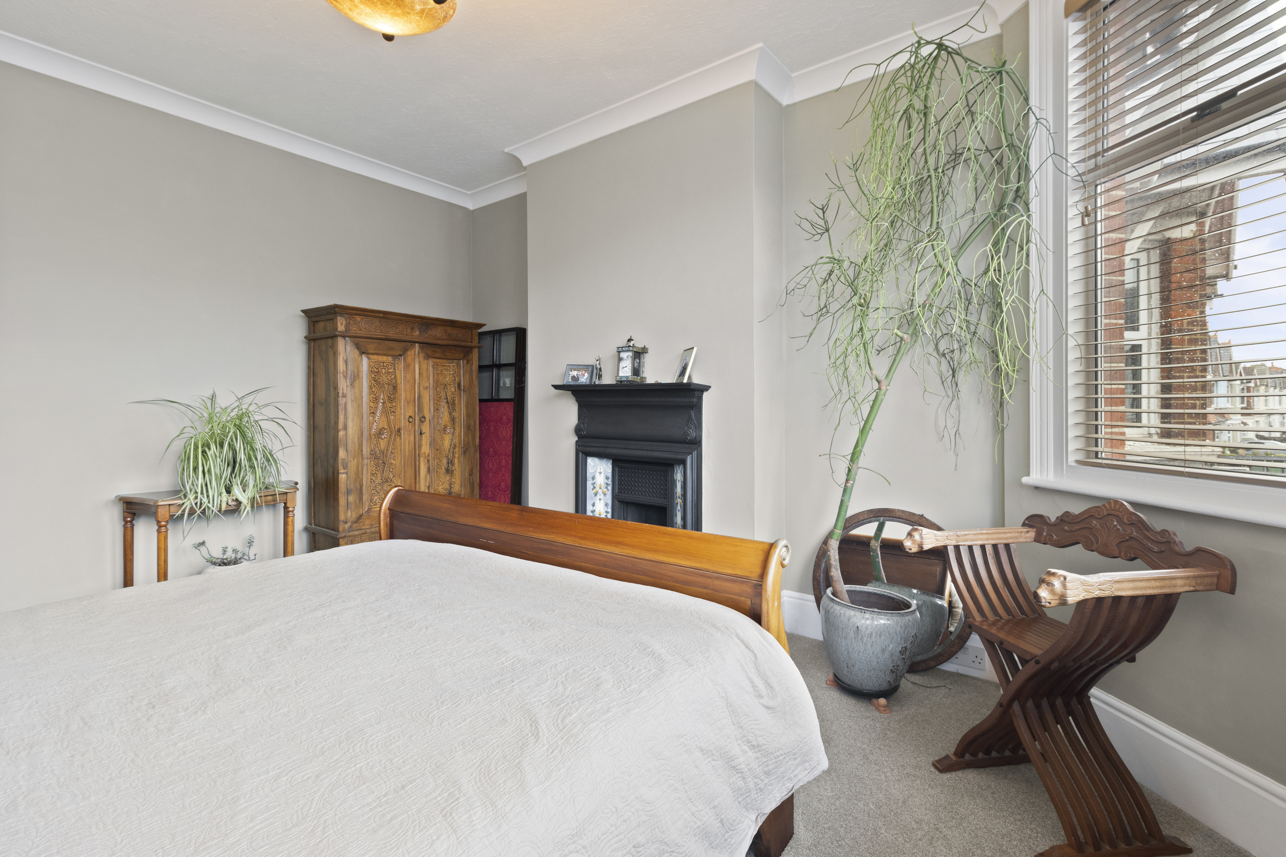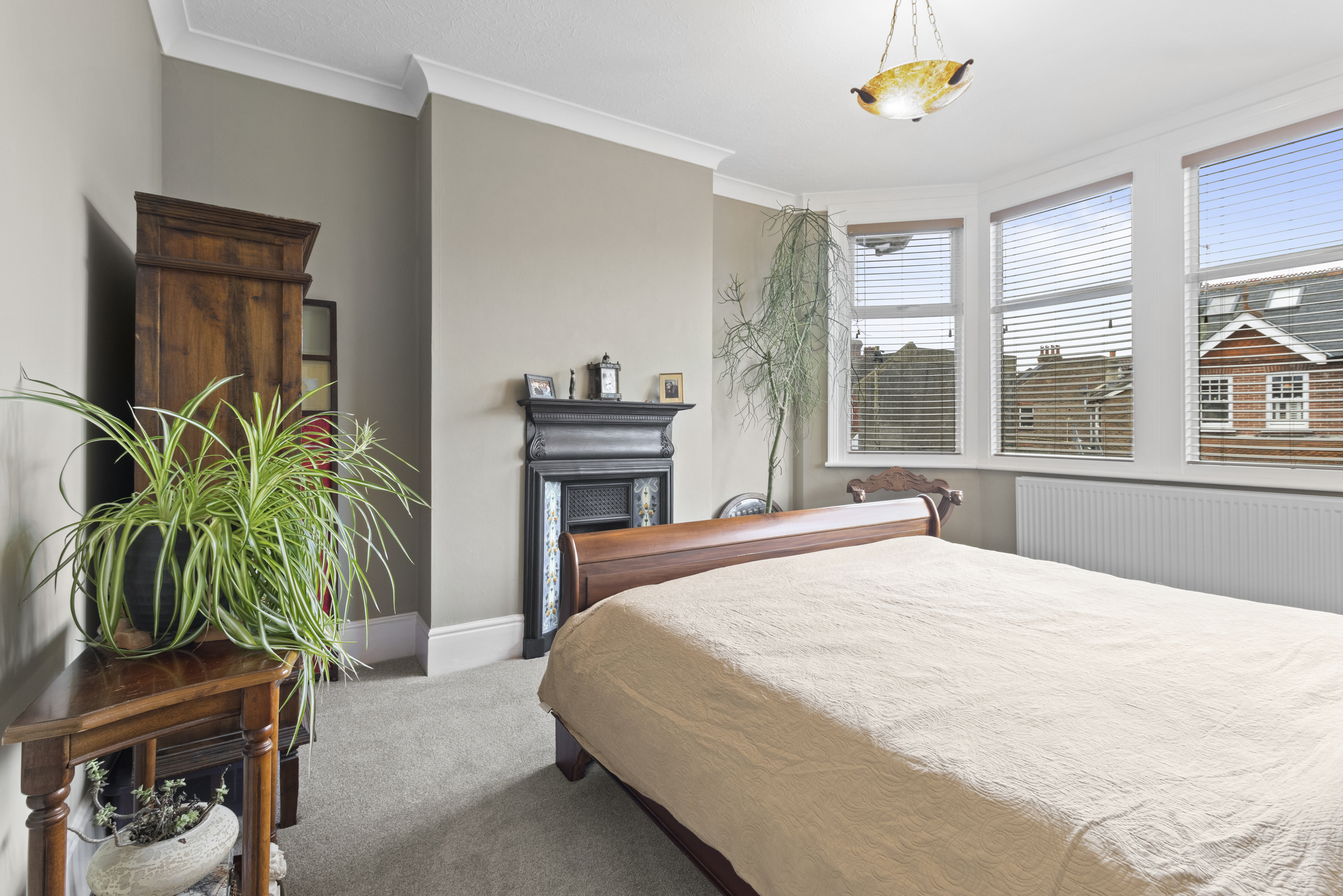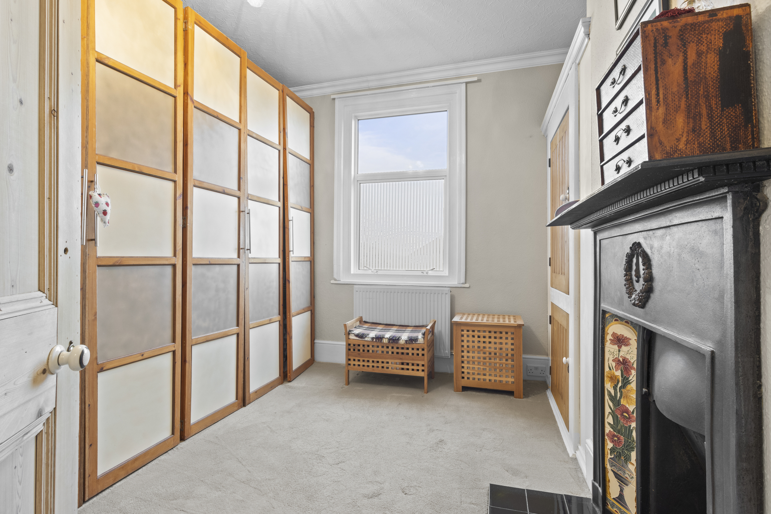 The front-facing living room is a bright and inviting space, boasting a large bay window that floods the room with natural light. A striking feature fireplace with an ornate surround adds a touch of character and warmth, making it the perfect space to unwind.