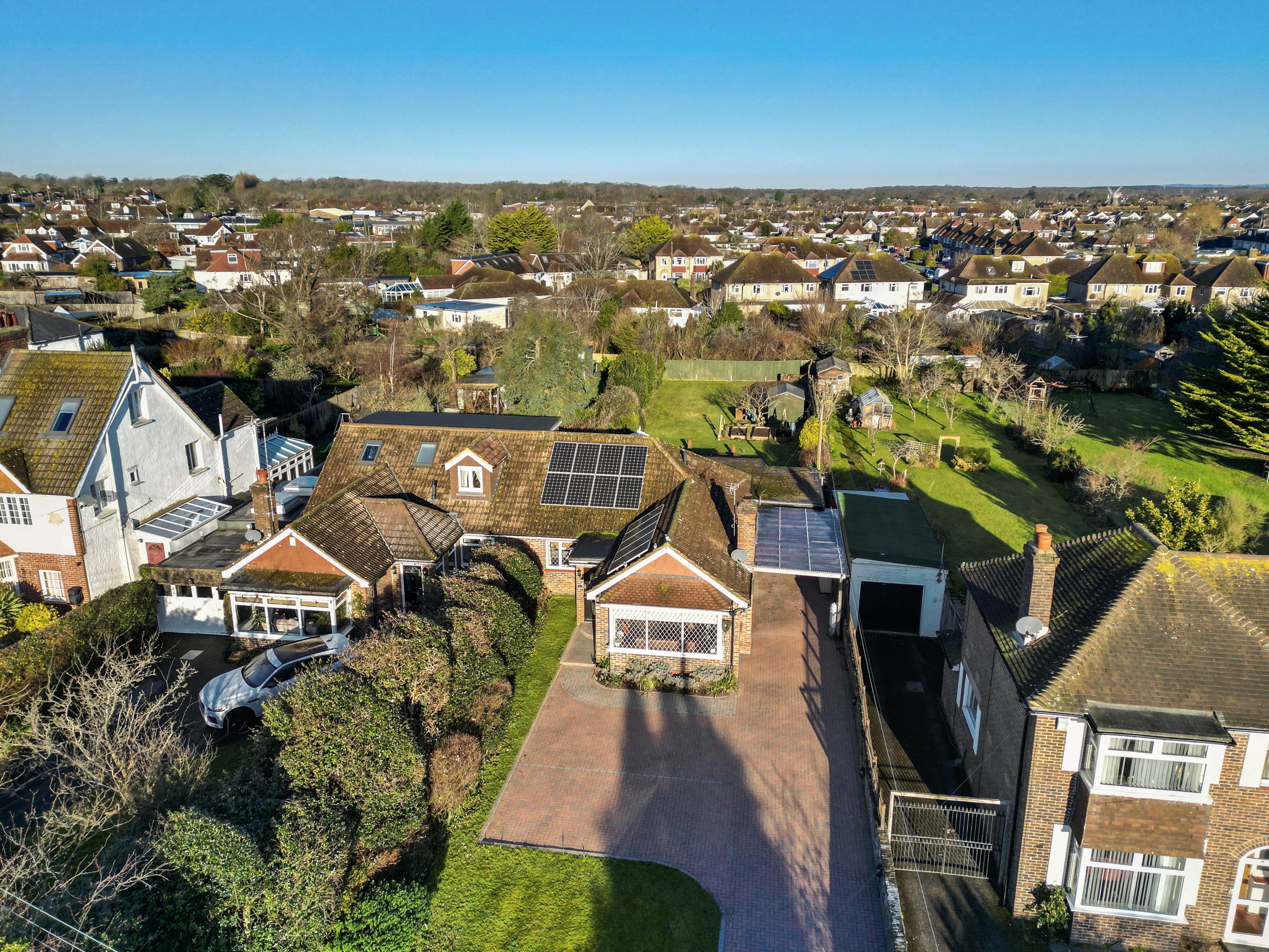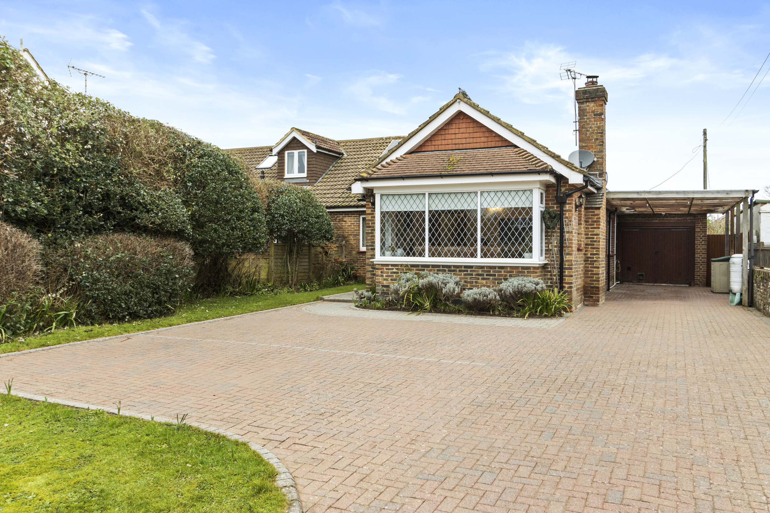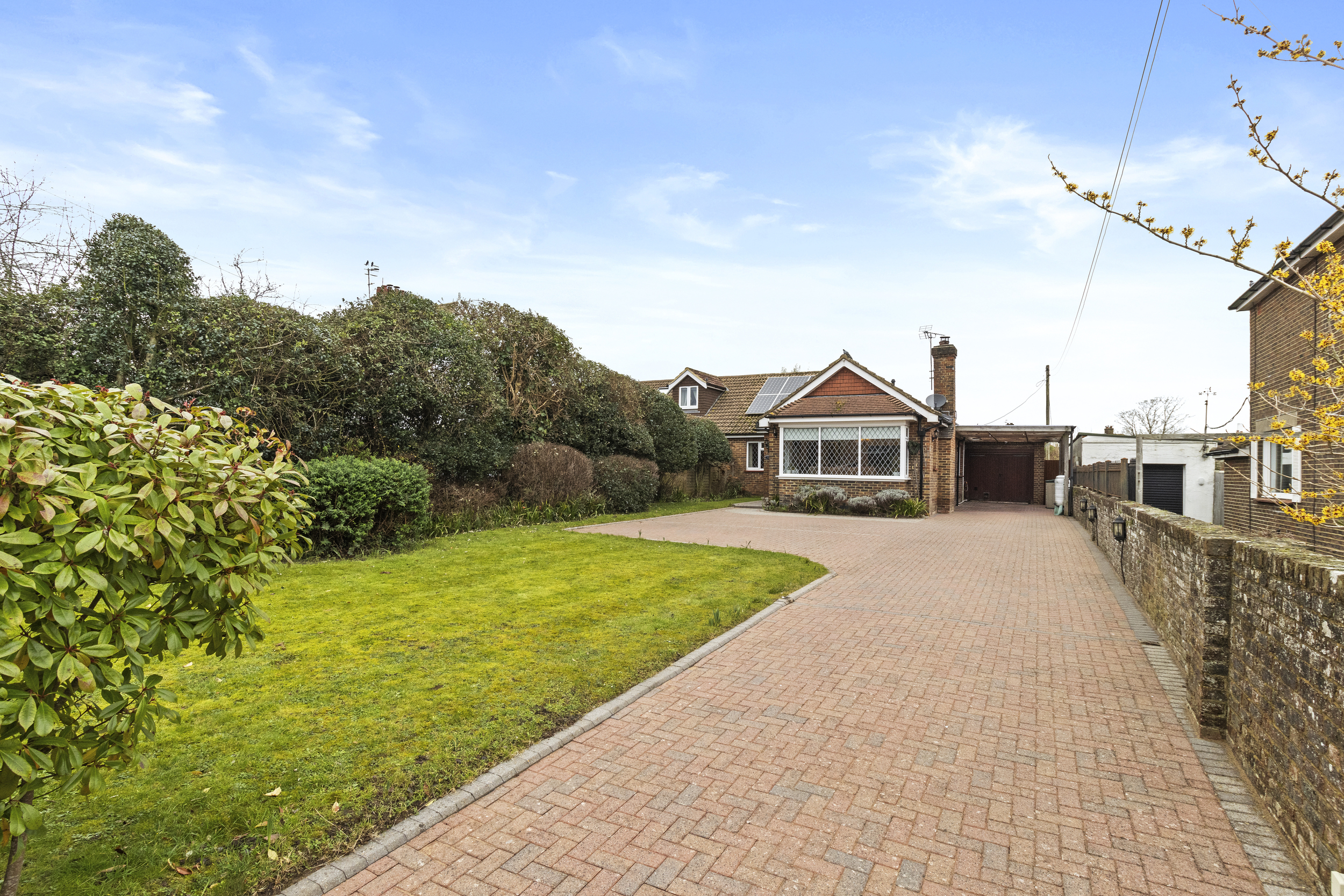 The exterior of this property is just as impressive as the interior. To the front, a brick-blocked driveway provides ample off-road parking for several vehicles, leading to a carport, which includes electric car charger, and a garage. A neatly maintained lawn adds to the property's curb appeal, creating an inviting first impression.