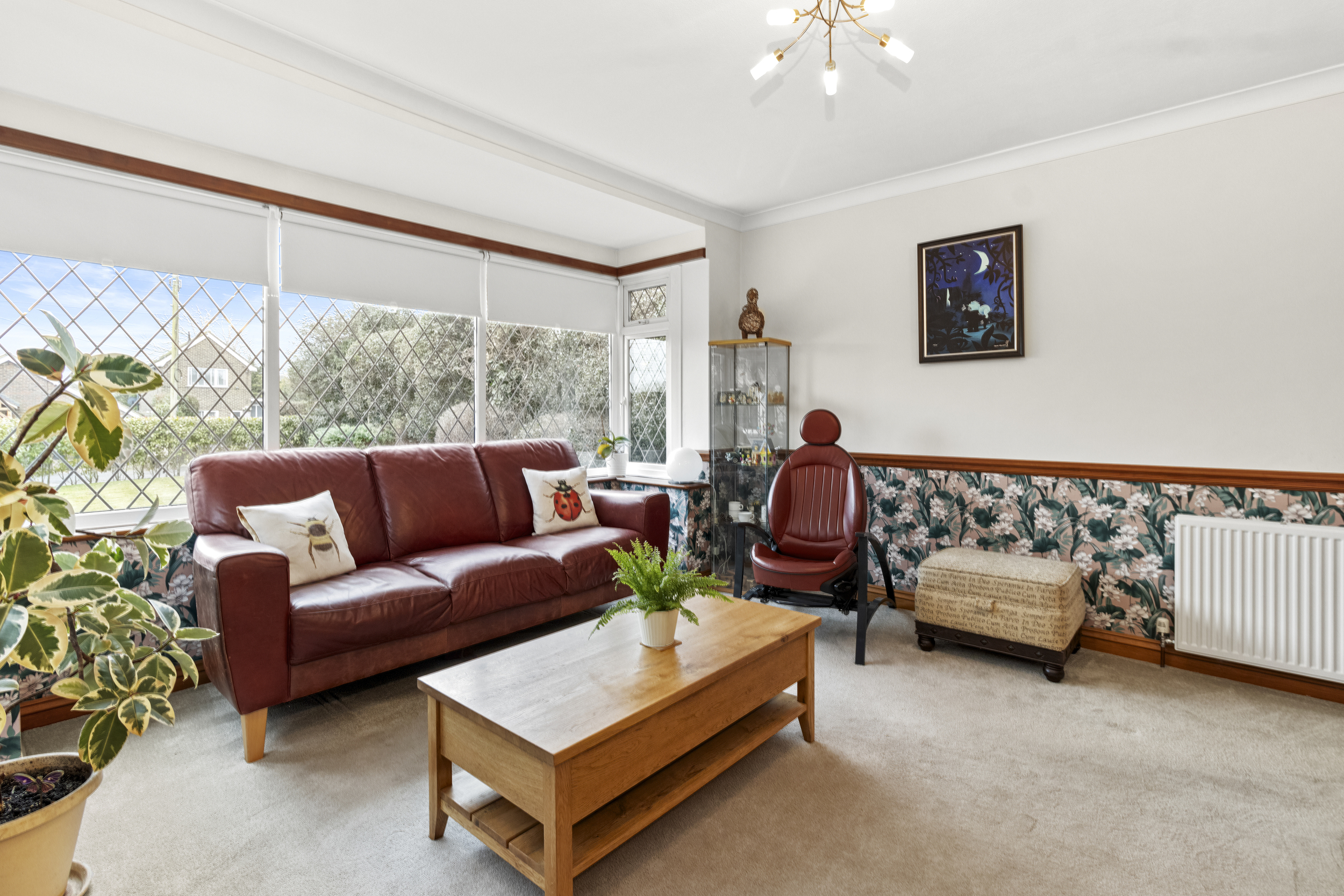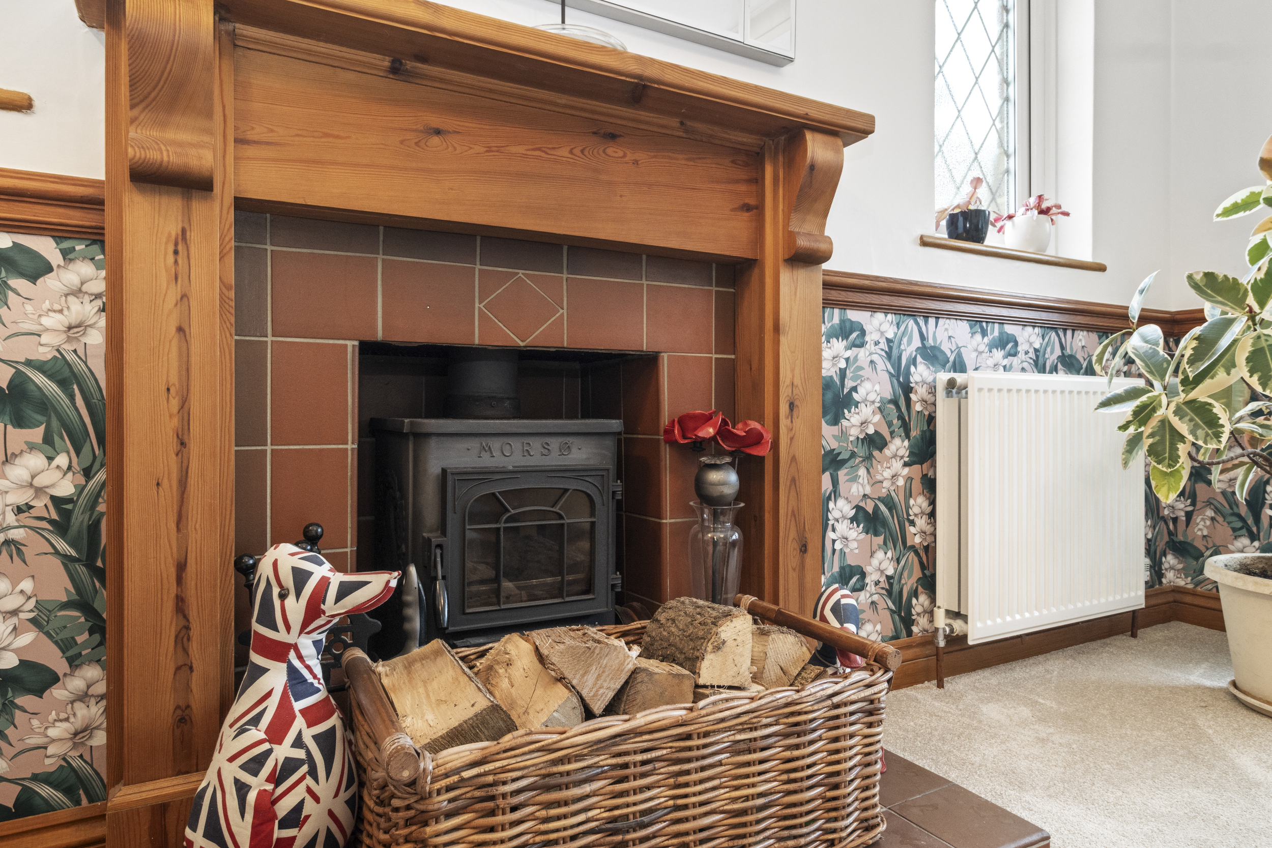 Upon entering, you are welcomed into a spacious L-shaped entrance hall, complete with built-in storage cupboards, loft access, and access to all principal rooms. The front-facing living room is bright and inviting, featuring a square bay window that allows natural light to flood the space, complemented by a charming log burner that adds warmth and character.