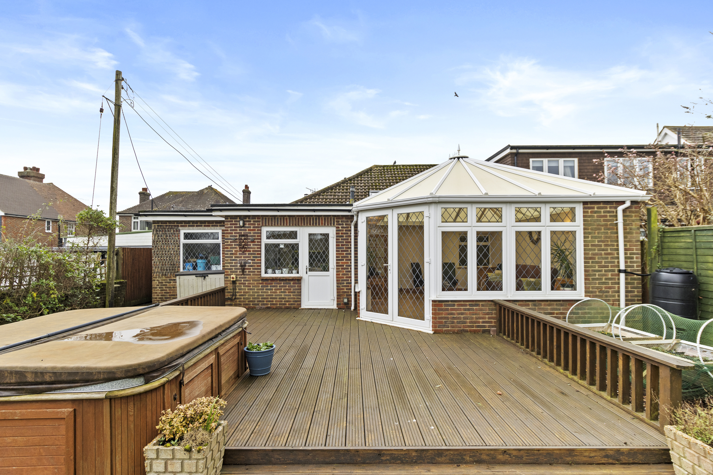 The rear garden is truly spectacular – a beautifully landscaped and fully enclosed outdoor space that has been carefully designed for relaxation, entertainment, and gardening enthusiasts alike. An elevated decking area adjoins the rear of the property, complete with a luxurious hot tub, making it an idyllic spot to unwind after a long day.