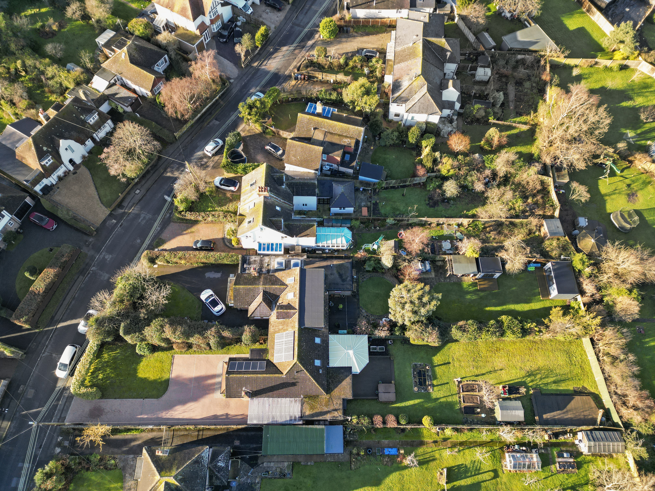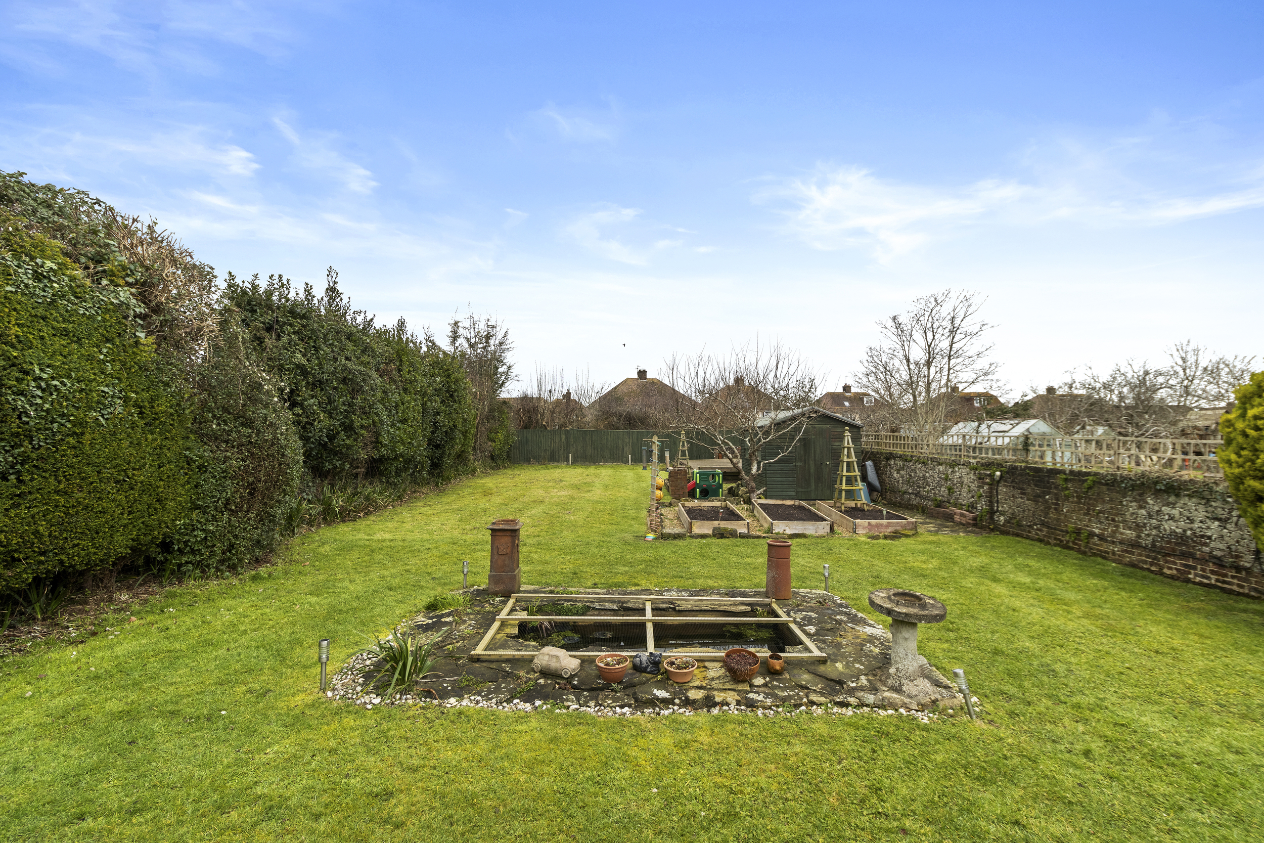 Beyond the decking, an expansive lawn stretches out, bordered by mature trees and lush greenery, offering privacy and a serene setting. For those with a passion for gardening, well-tended vegetable patches provide the perfect space to grow fresh produce. Towards the bottom of the garden, an additional decking area offers yet another inviting spot to relax, allowing you to enjoy the sunshine throughout the day.