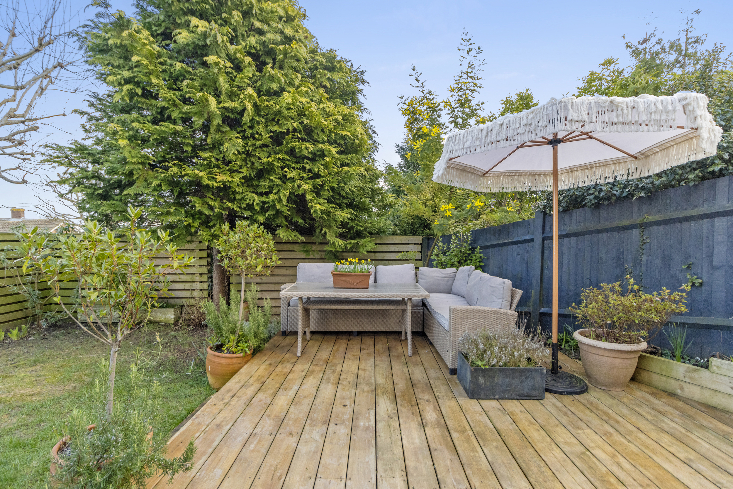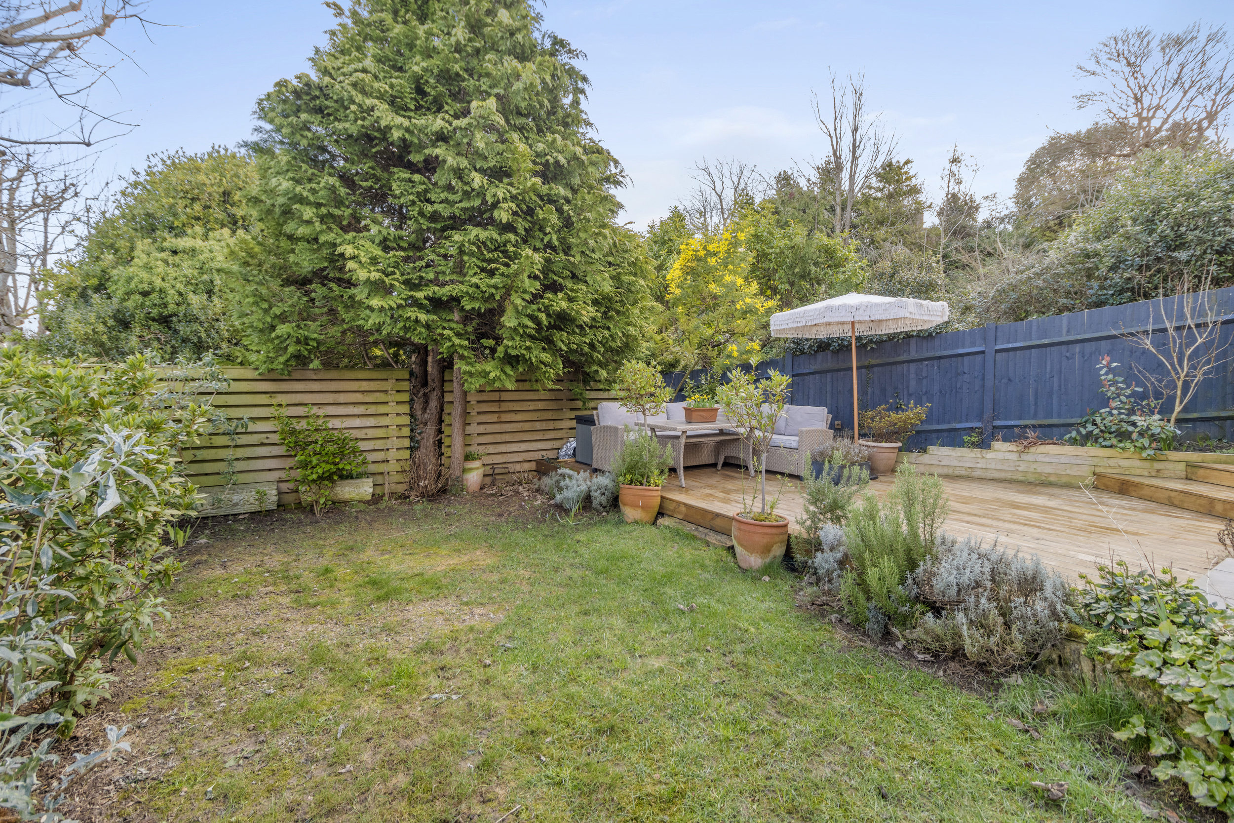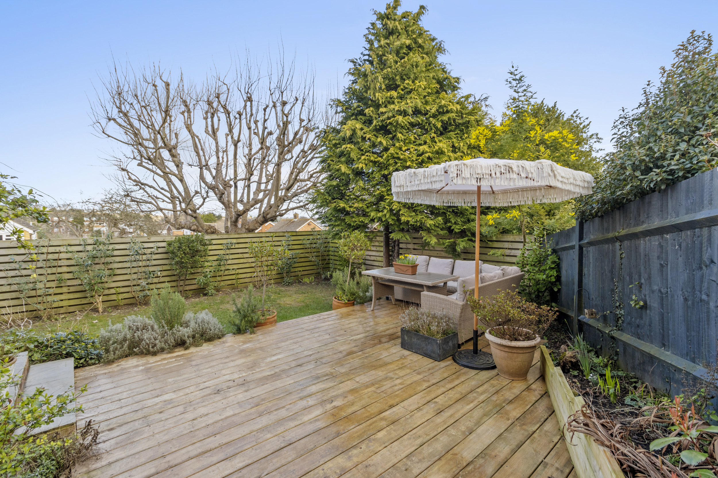 A secondary side garden, accessible from both the living room and the rear side entrance, featuring a spacious decking area and a well-maintained lawn, surrounded by mixed borders for added privacy and charm.