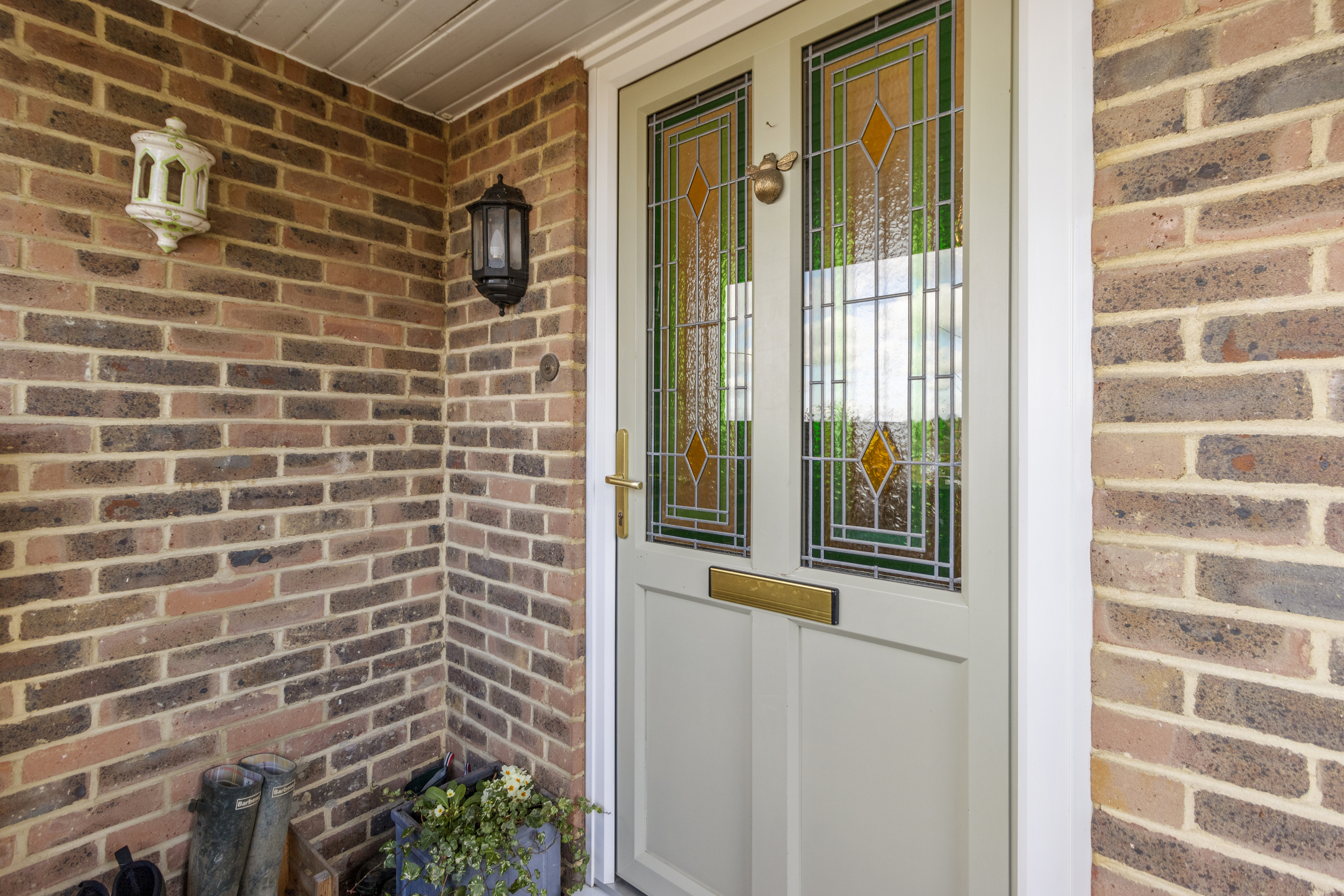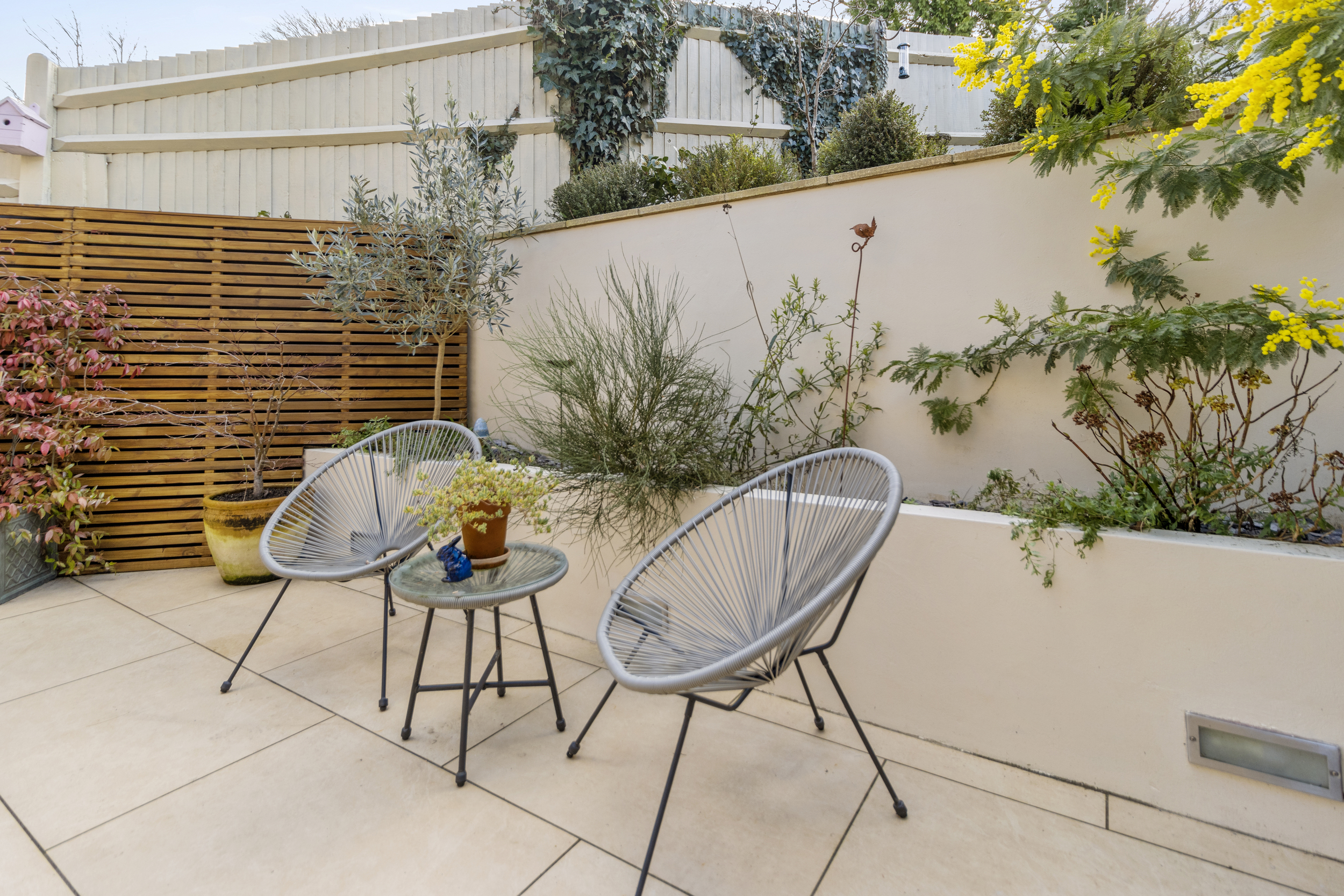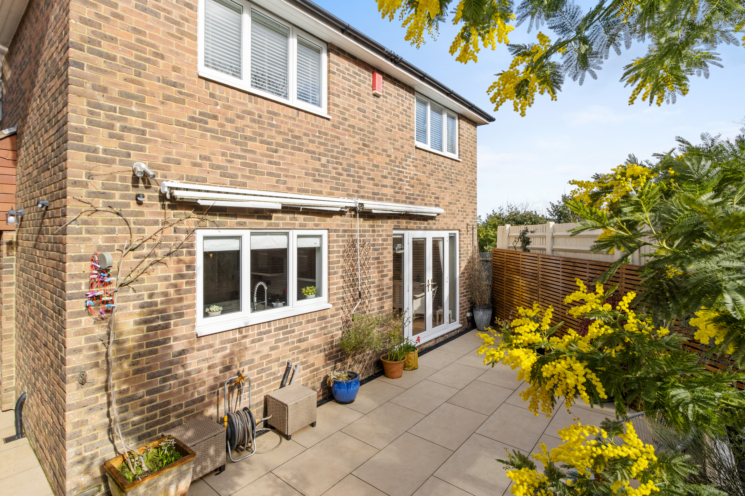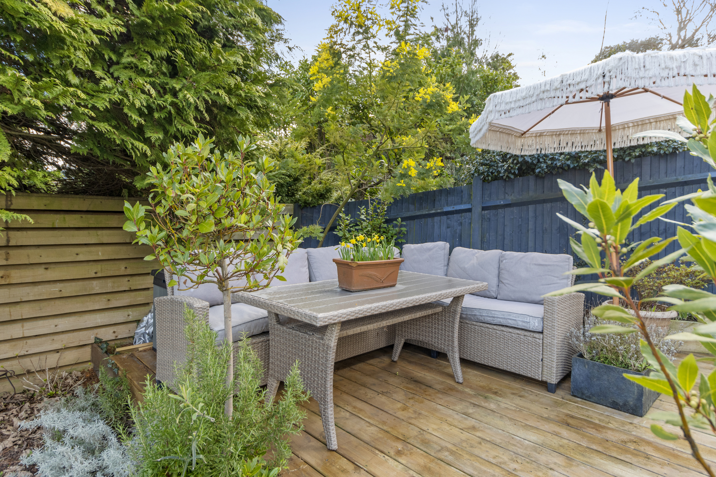 A secondary side garden, accessible from both the living room and the rear side entrance, featuring a spacious decking area and a well-maintained lawn, surrounded by mixed borders for added privacy and charm.