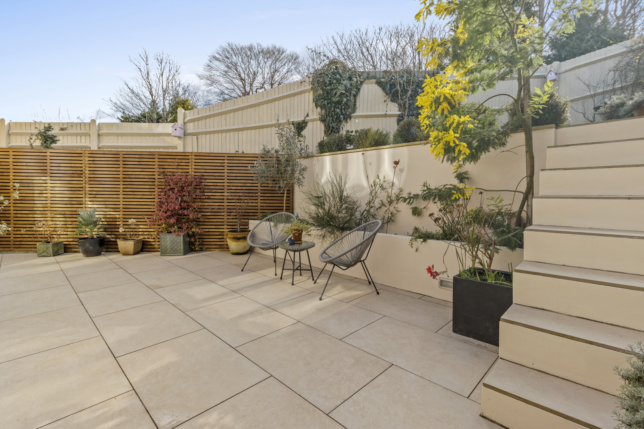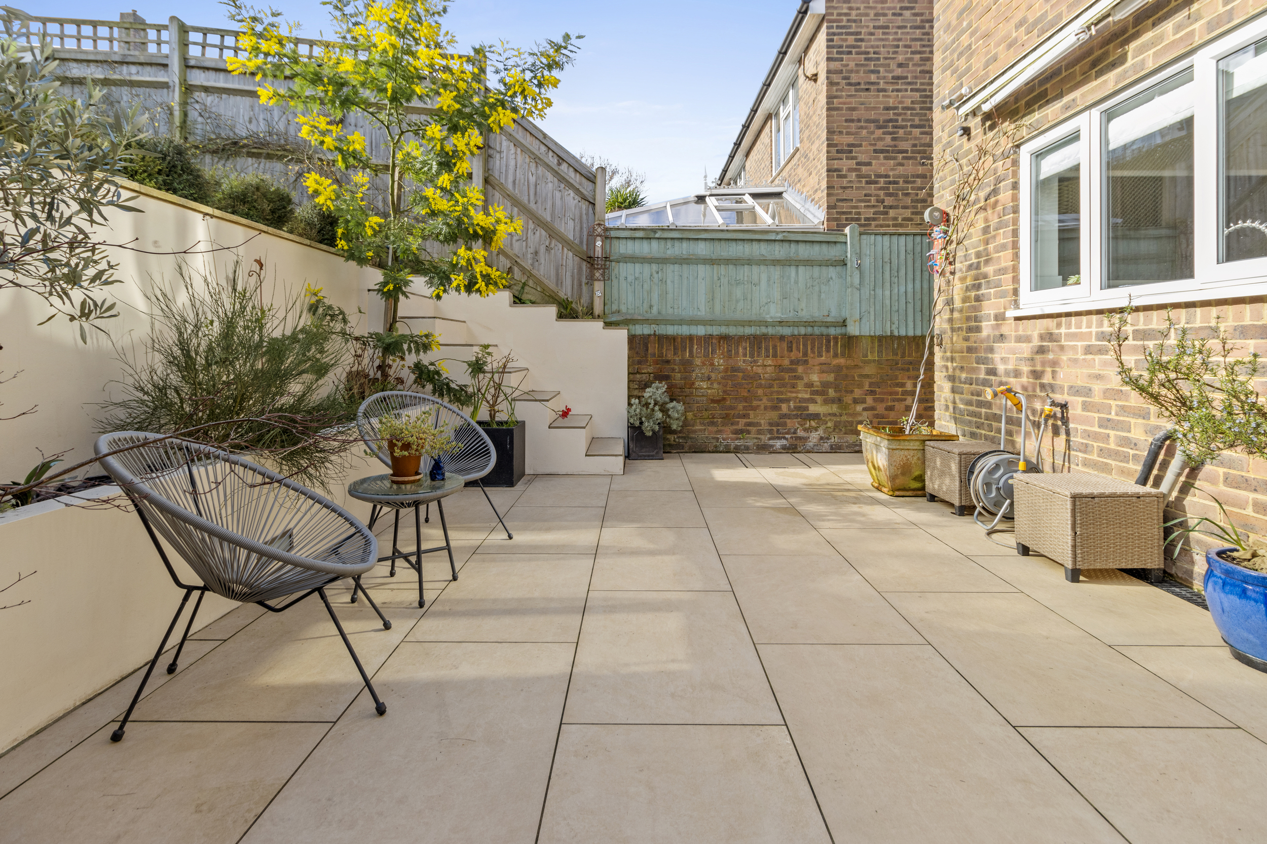 At the rear, the beautifully landscaped garden has been thoughtfully designed to provide both aesthetics and functionality. Features include a porcelain-tiled patio area adjoining the property, ideal for entertaining and alfresco dining, with steps up leading to a raised patio area with stunning views.
