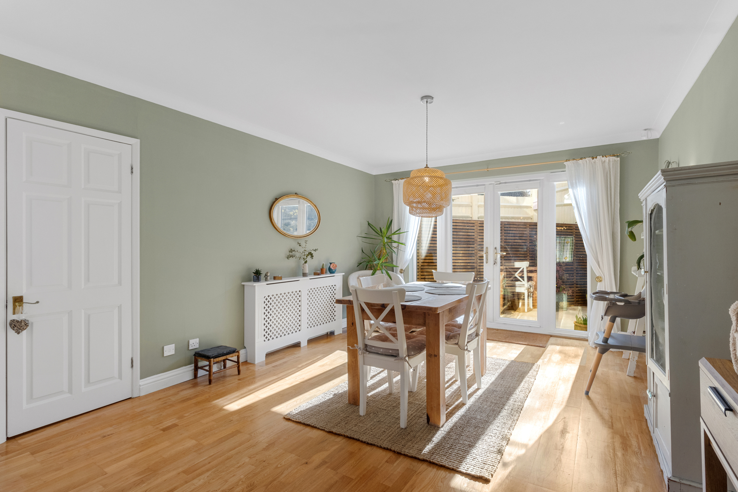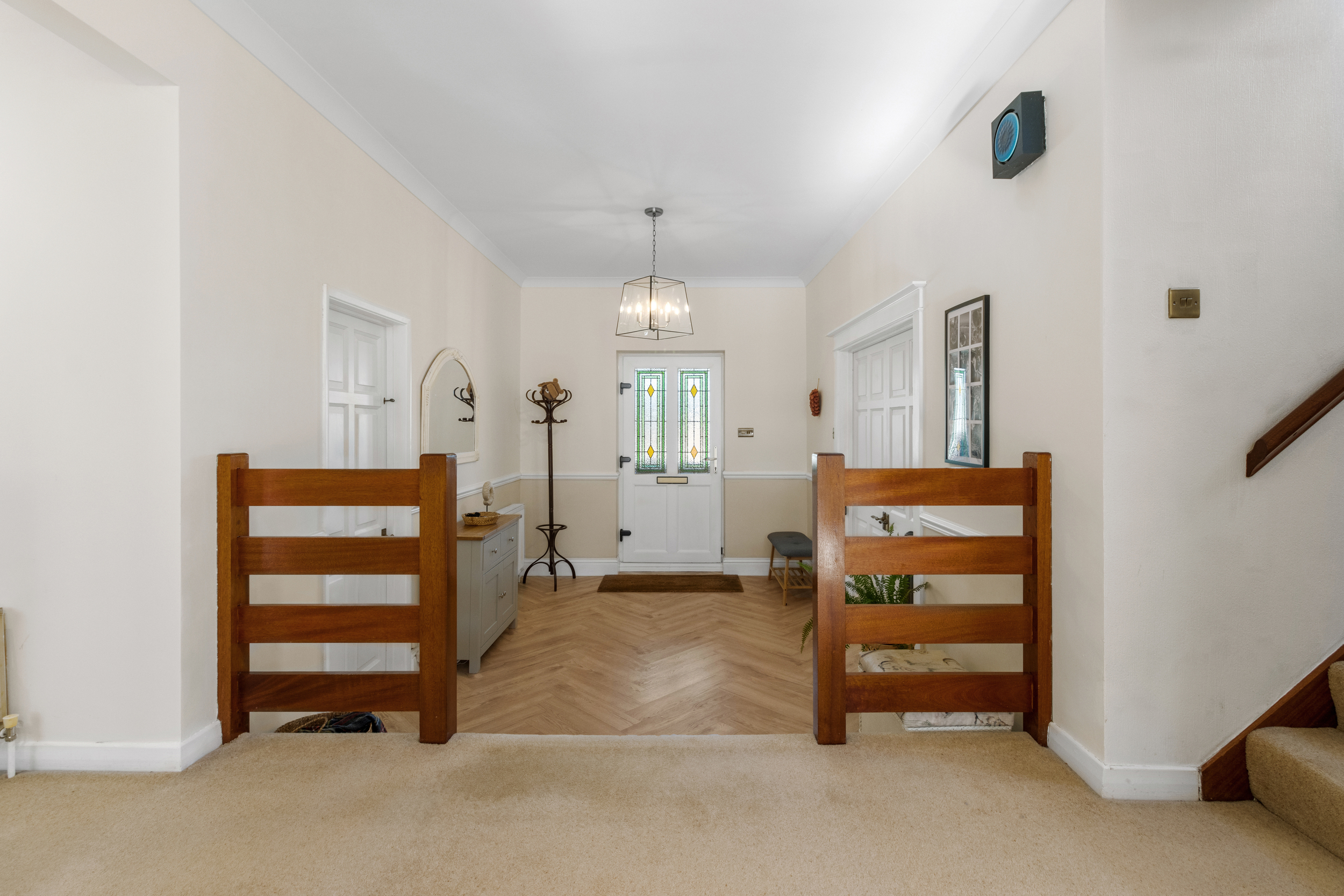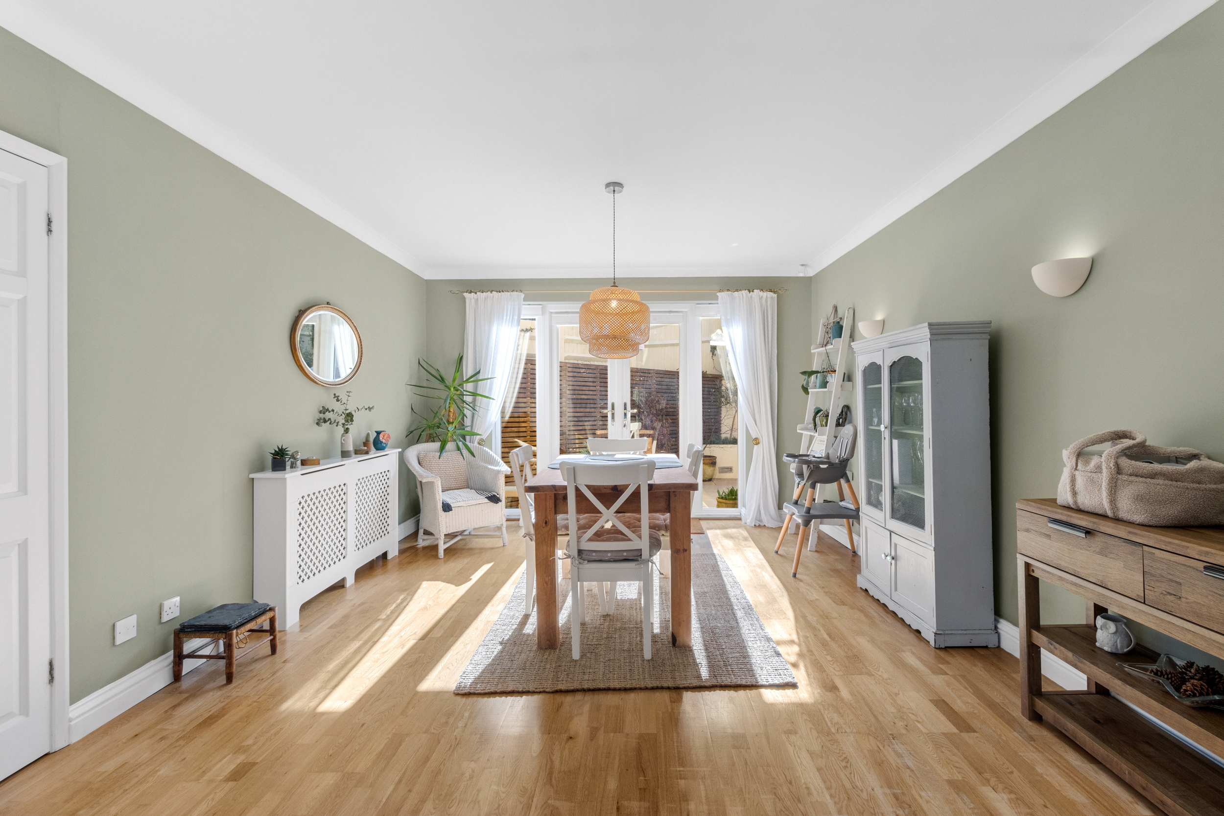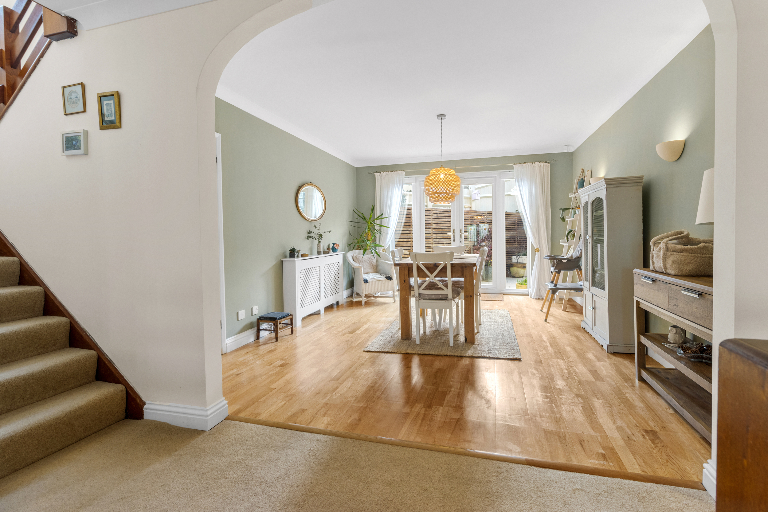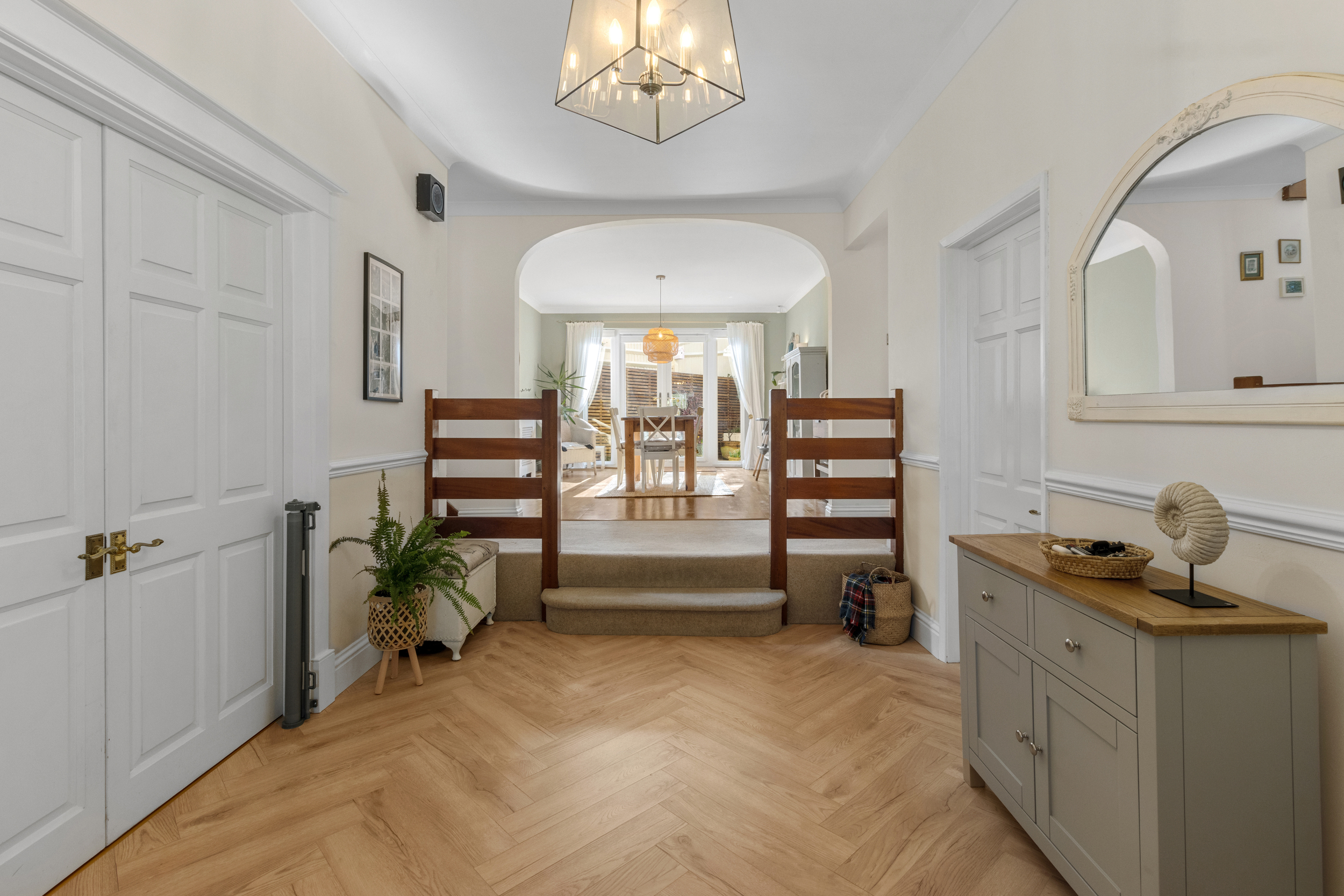 As you step into the home, you are welcomed by a striking split-level entrance hall, setting an impressive tone for the rest of the house. This inviting space leads to the raised dining area, a perfect setting for formal gatherings or casual meals. The double doors open onto the rear garden, seamlessly blending indoor and outdoor living.