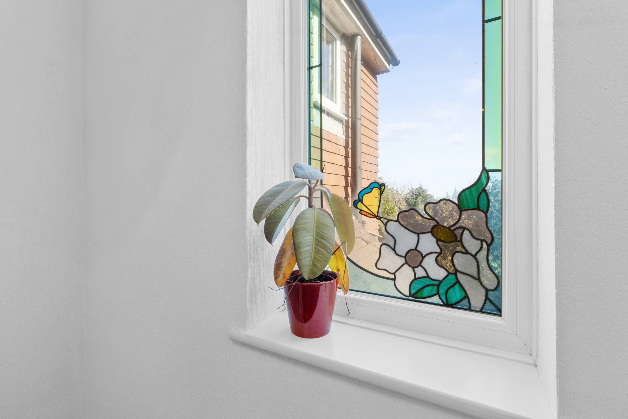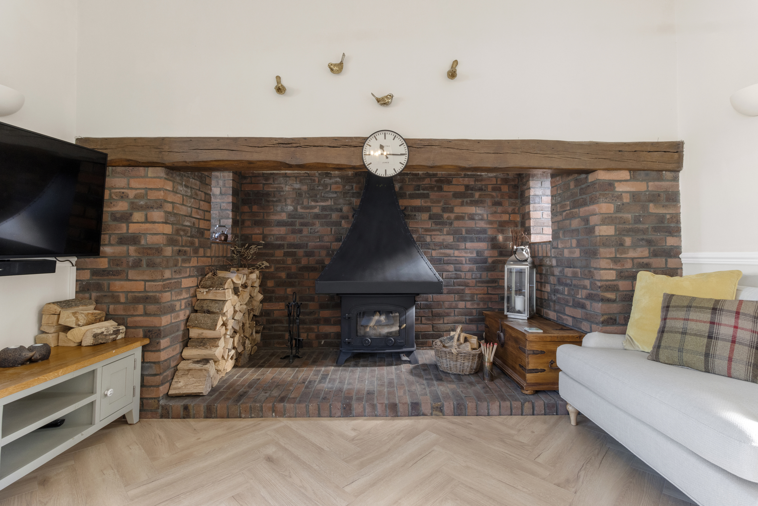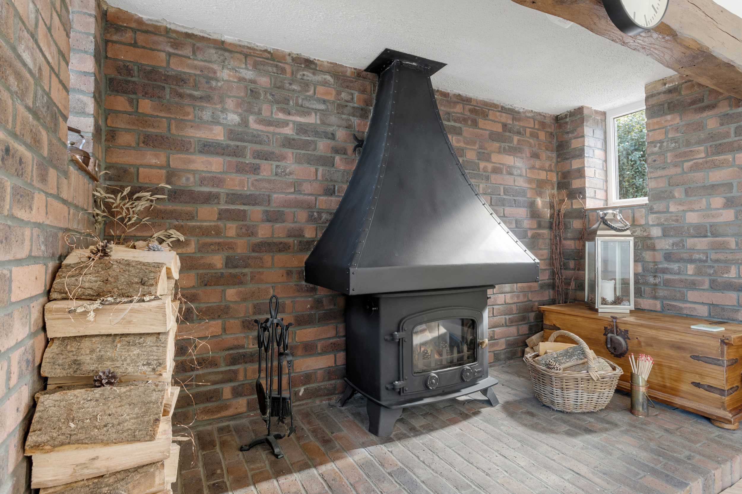 The spacious living room is a focal point of the home, designed to offer both comfort and sophistication. The impressive Inglenook fireplace with a brick hearth creates a warm and inviting ambiance, while the large front-facing window bathes the room in natural light. A separate door from the living room leads to an additional garden area, further enhancing the sense of openness and tranquillity.