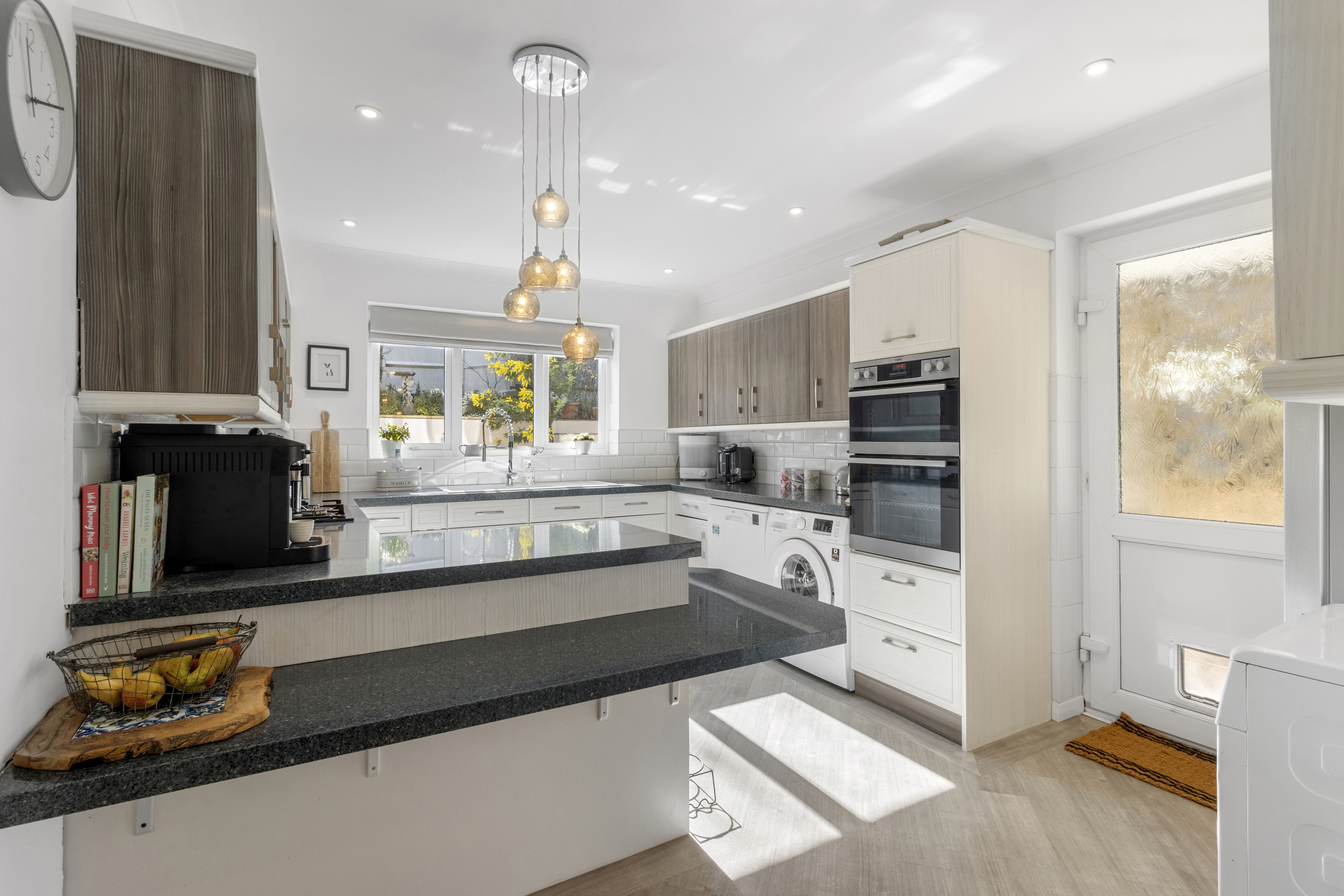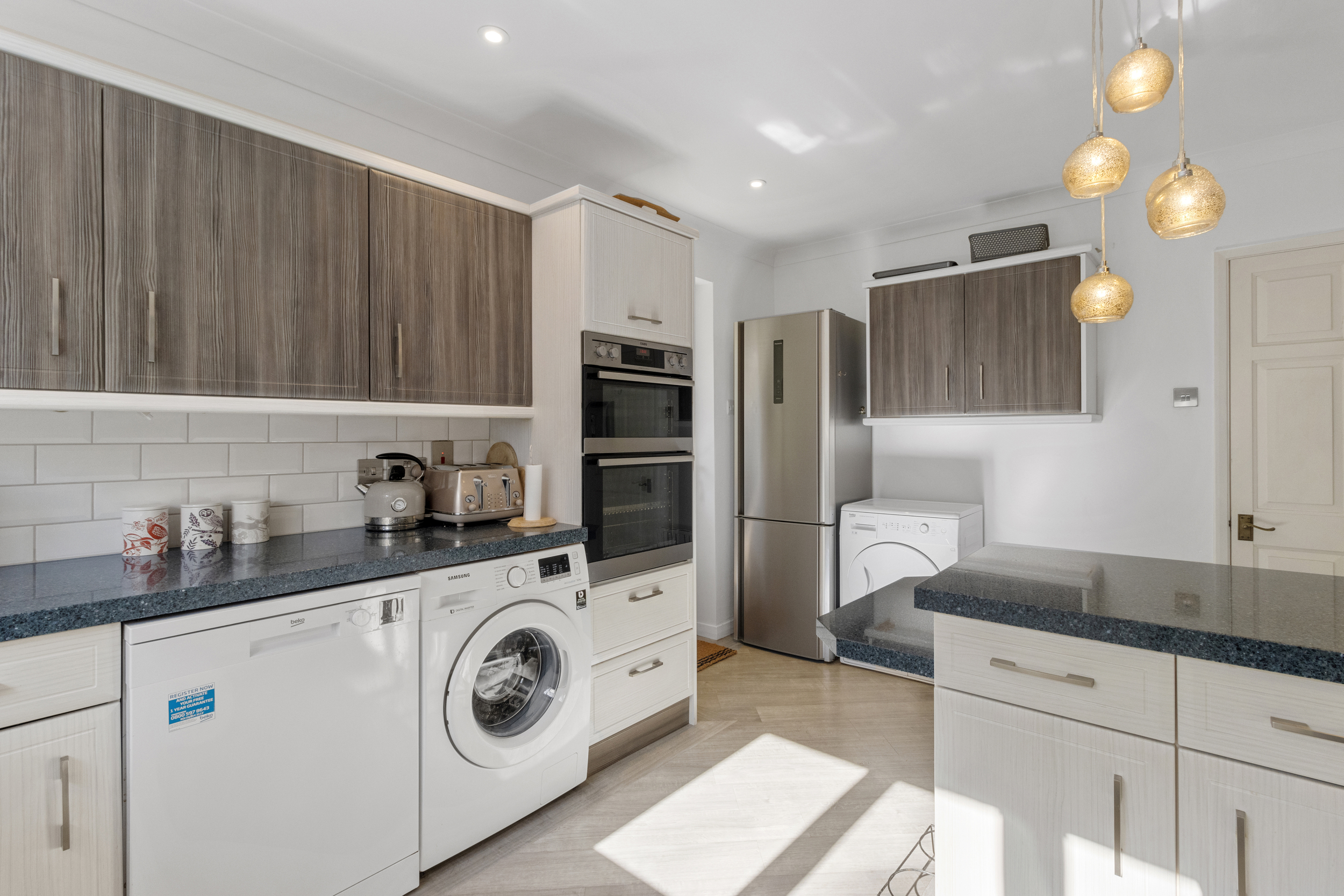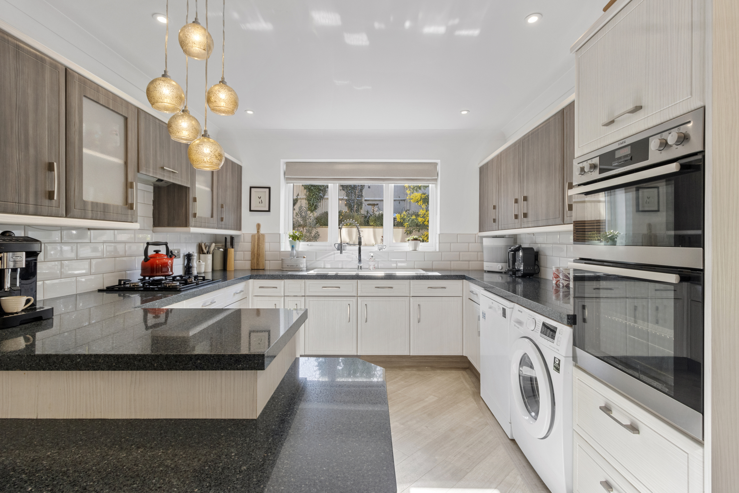 Designed with both style and functionality in mind, the kitchen/breakfast room is well-equipped with high-quality appliances and ample storage. Features include stone-effect work surfaces, AEG eye-level electric oven, Bosch four-burner gas hob with a Neff extractor fan, space and plumbing for both a washing machine and a dishwasher and stylish Karndean flooring.