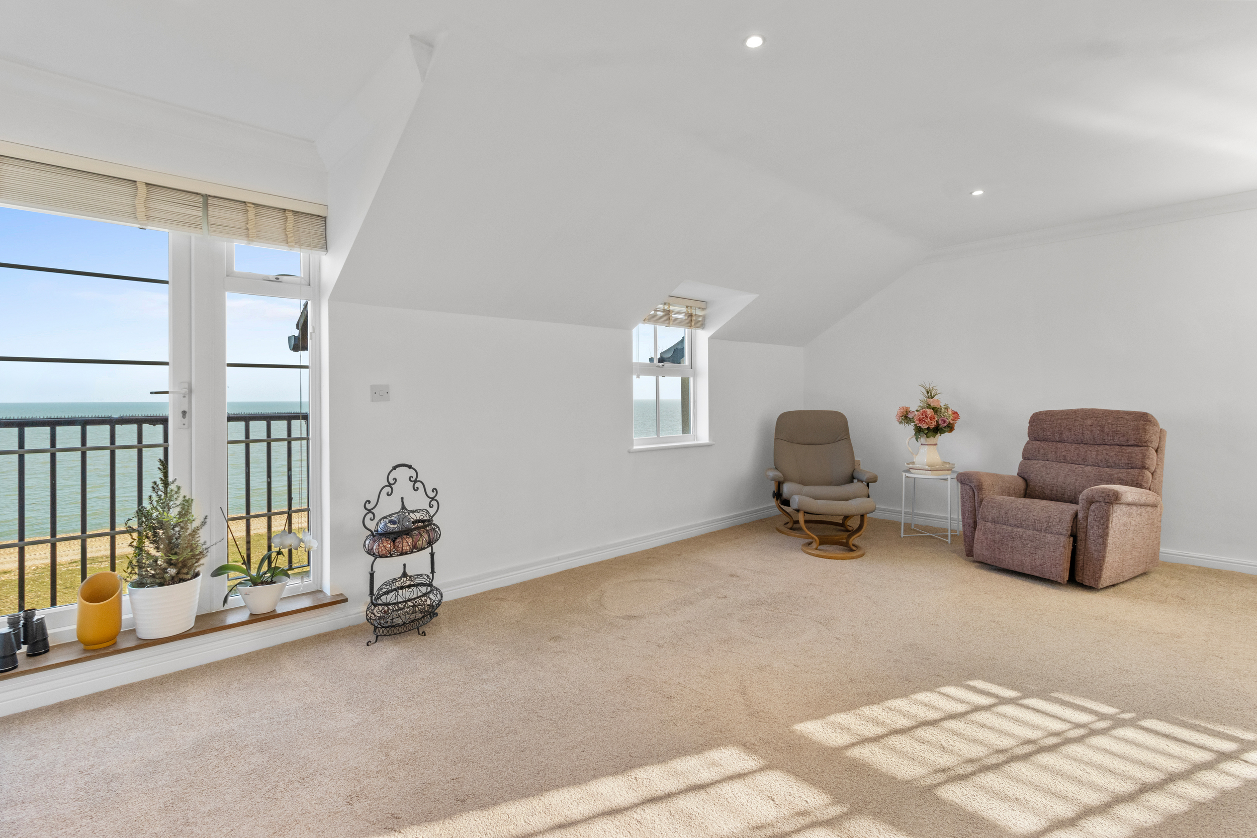 The thoughtfully designed kitchen/breakfast room is both stylish and functional. Featuring a range of wall and base units, it offers ample storage and workspace. High-end integrated appliances include a Neff fridge, freezer, oven, hob, extractor hood, and dishwasher, as well as a Bosch washing machine. With space for a small dining table and chairs, this kitchen is perfect for casual meals. An additional balcony access point from the kitchen allows you to step outside and enjoy the fresh sea air while preparing meals or dining al fresco.