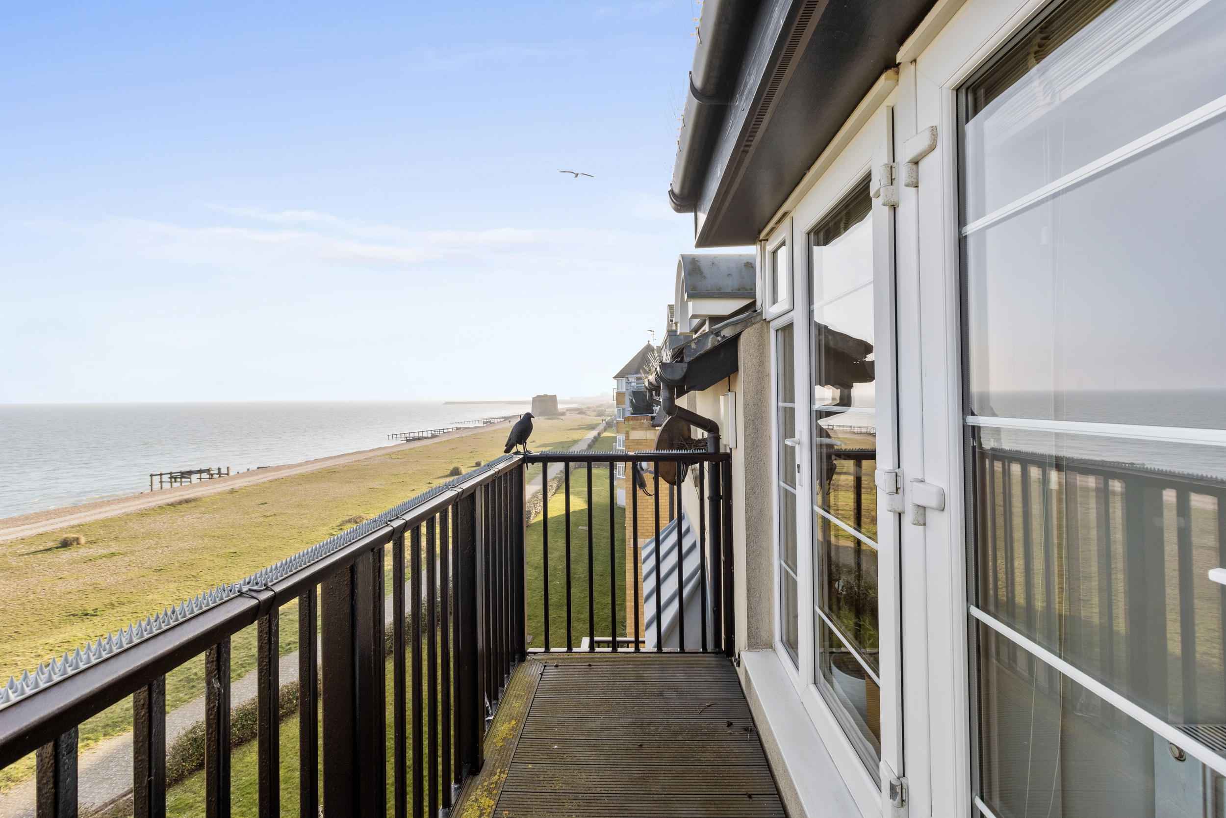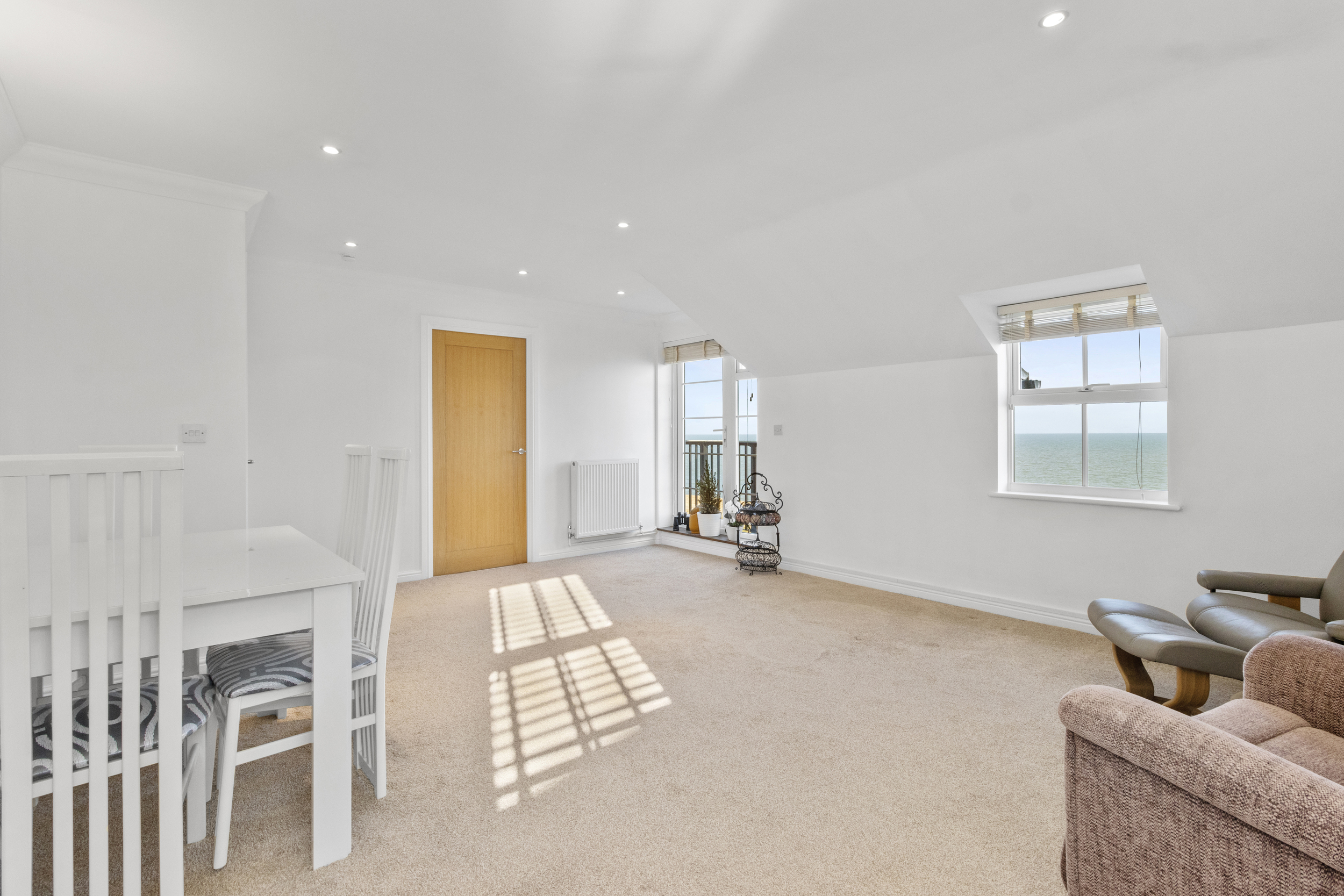 The open-plan living and dining area is the true heart of this home, designed to take full advantage of its spectacular setting. The double-aspect windows flood the space with natural light, creating a bright and airy atmosphere. A private balcony, accessible via the living area, provides an idyllic outdoor space where you can sit back, unwind, and soak in the unparalleled sea views.