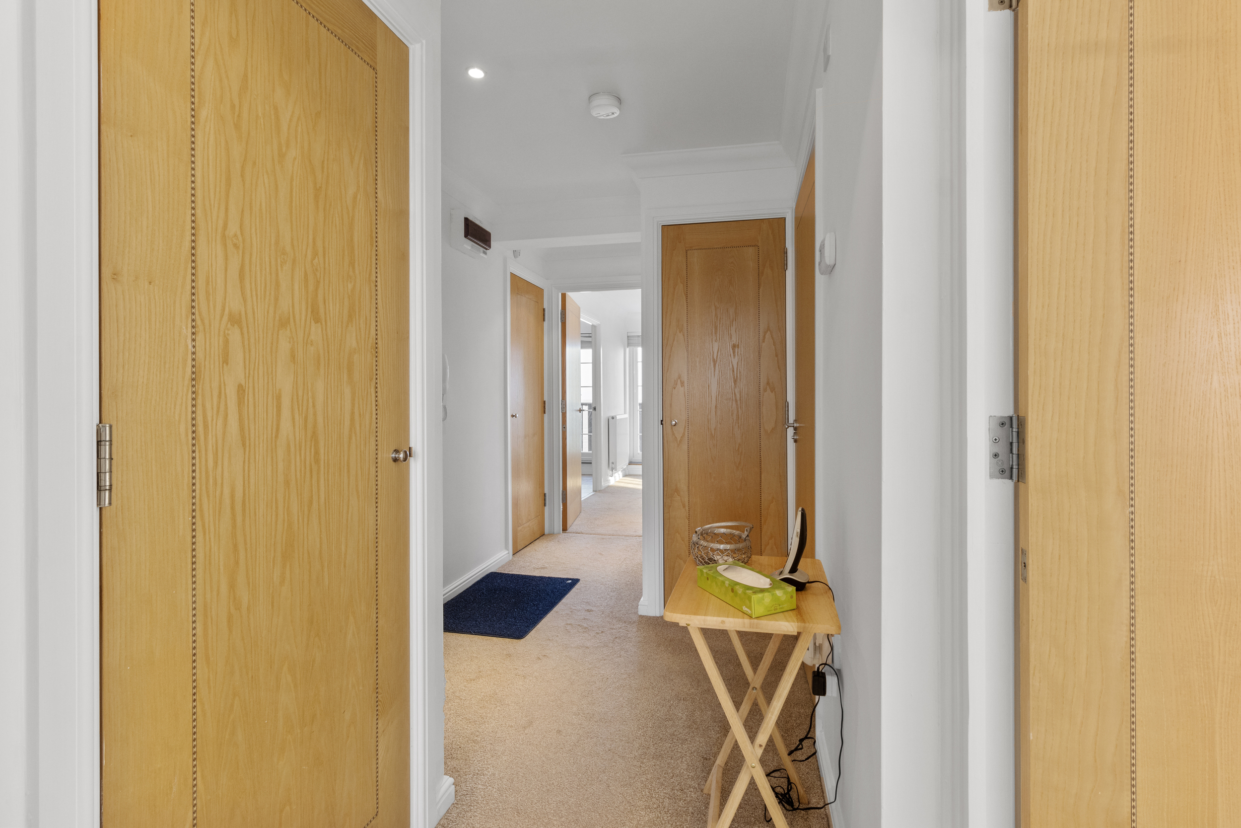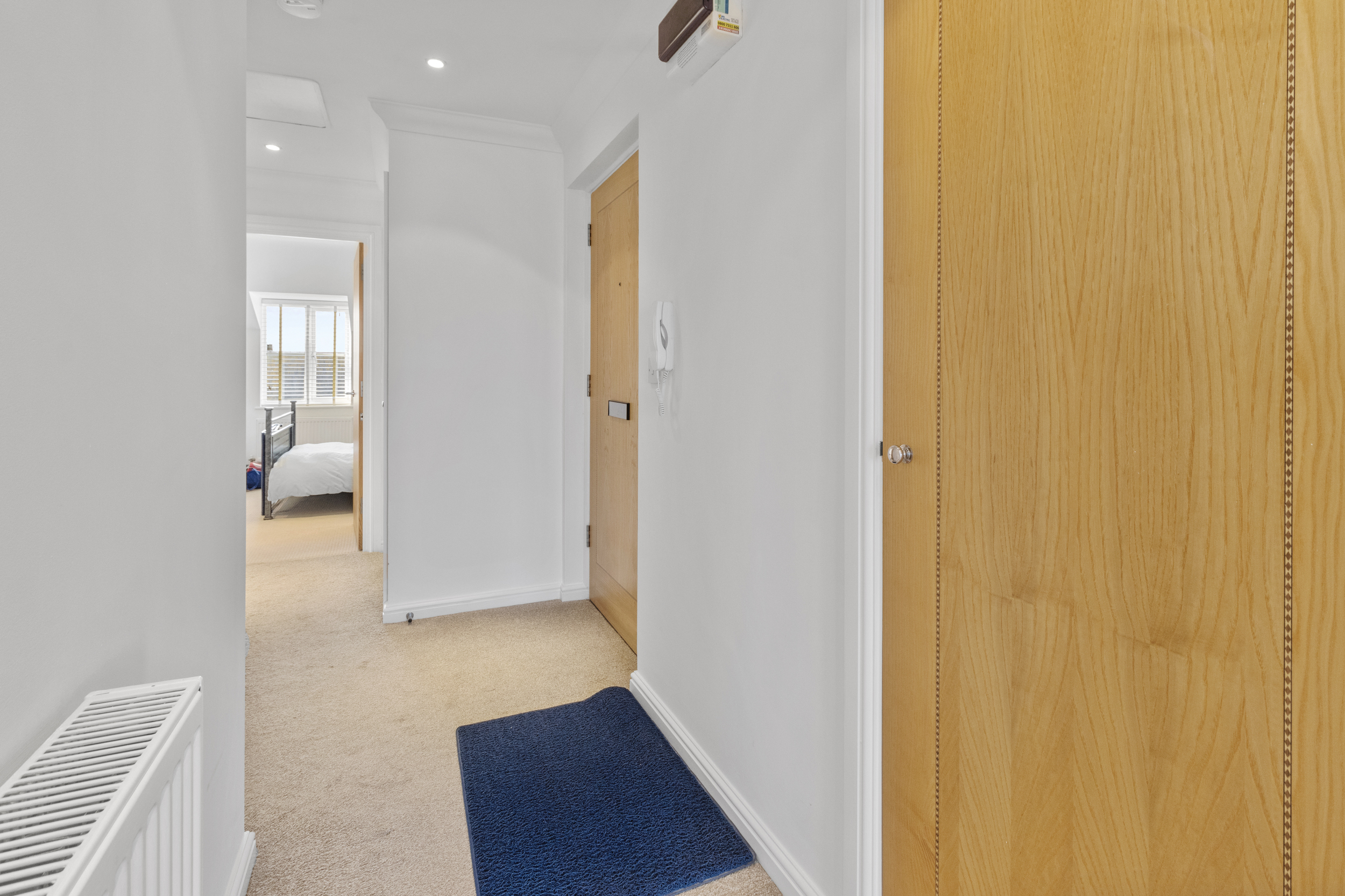 Upon entering the property, you are welcomed by a well-maintained communal entrance hall, where both lift and stair access lead to the third floor. As you step inside, the wide entrance hall immediately conveys a sense of space and light, offering access to all rooms and featuring three built-in storage cupboards.